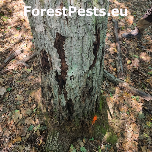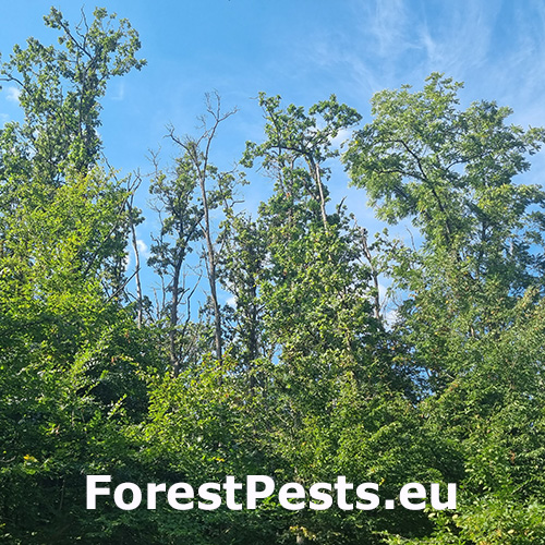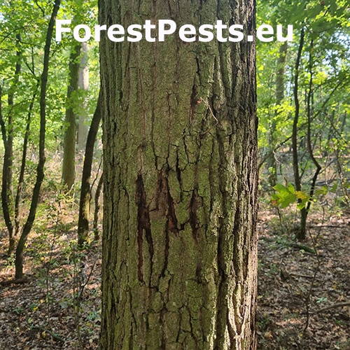 Acute Oak Decline (AOD) is an emerging disease affecting oak trees (Quercus spp.). The disease primarily affects pedunculate oak and sessile oak, but other oak species can also be affected. Most affected trees are mature, but younger ones with trunk diameters of 10-12 cm have also been recorded. It can lead to the death of oak trees within four to six years of symptom onset. The disease is primarily caused by various agents, particularly bacteria, and is associated with environmental factors that weaken the trees. Sometimes, Agrilus species are present, but they only play a minor role in this type of decline. Generally, the exact cause of this decline remains unknown. AOD was first discovered in the UK; however, similar oak decline diseases have been reported in other parts of the world, making AOD a global concern. There is no cure for AOD, but management strategies aim to reduce the spread of the disease.