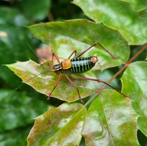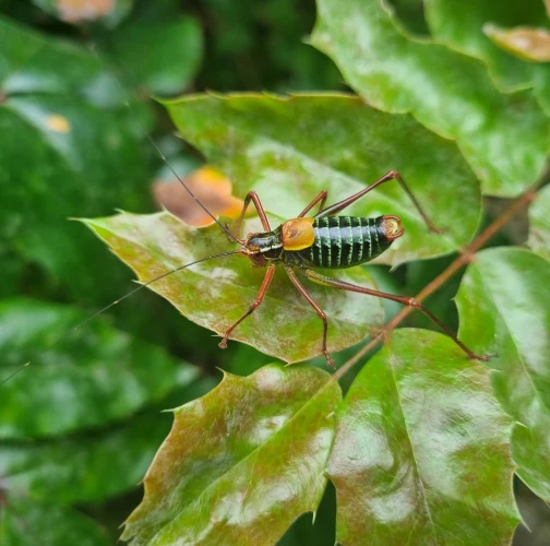 A large bush crictet on leaves. Leaves with damages.