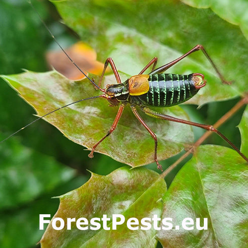 Eastern saw bush-cricket Barbitistes constrictus is a species of bush-cricket (family Tettigoniidae) found in Europe. It is relatively common in parts of Europe, particularly in Central and Eastern regions. It primarily inhabits coniferous forests and wooded areas. Barbitistes constrictus insect feeds on various tree species, often causing damage to young trees by feeding on their needles and leaves, buds, and shoots. While not typically considered a major pest, large populations can sometimes cause significant defoliation in forests, impacting tree growth. The adults are green or brownish, with long antennae and strong hind legs for jumping. It has one generation per year. Females lay eggs in late summer or early autumn. The eggs hatch in spring, and the emerging nymphs go through several molts as they grow. These nymphs resemble smaller versions of the adults but lack fully developed wings. The adult stage occurs in summer, when Barbitistes constrictus becomes fully winged and sexually mature.