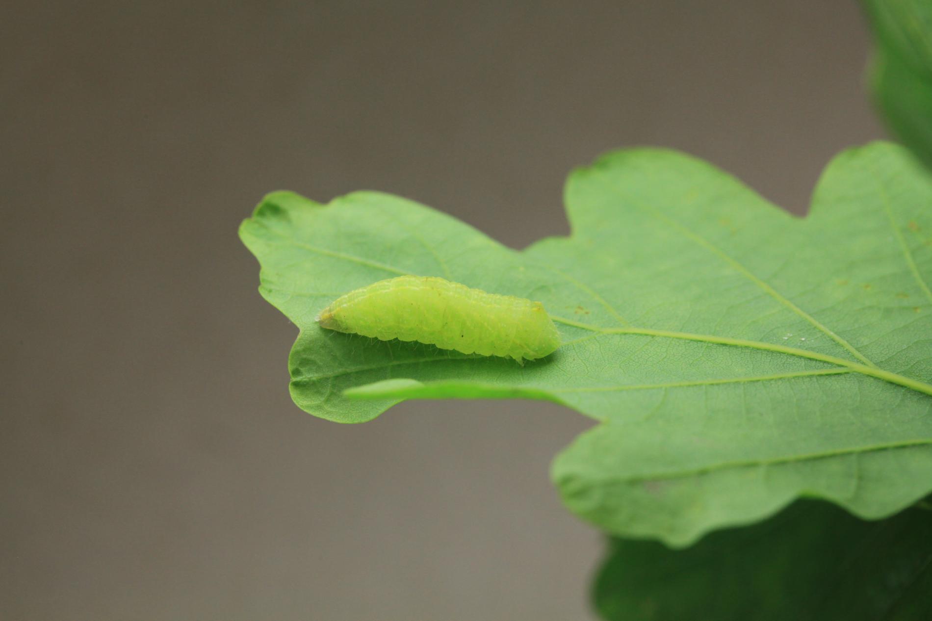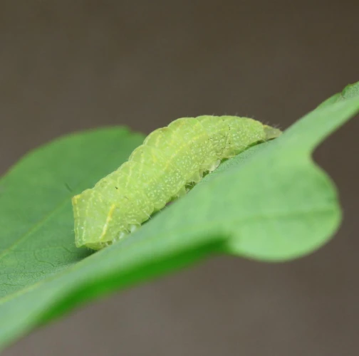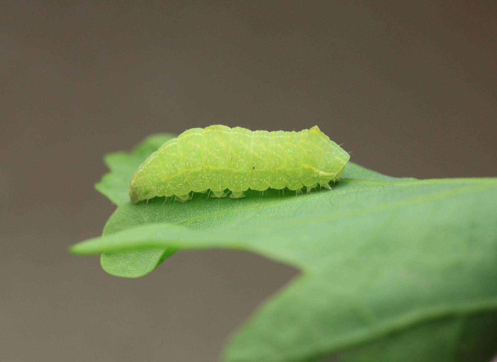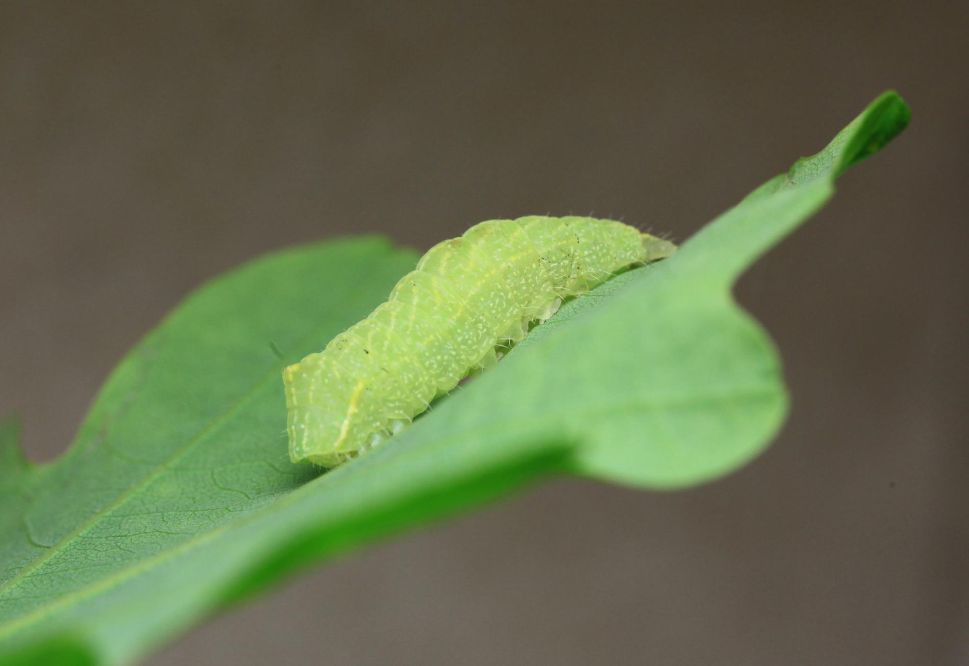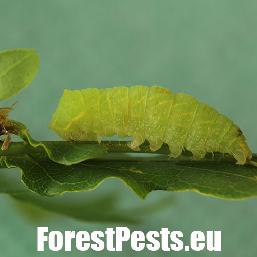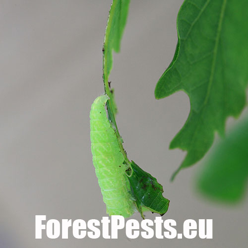 The caterpillar is green. She has a yellow stripe behind her head, is massive and often sits as if she has a ridge just behind her head. Eat in the upper parts of the crown. There are holes in the leaves, or they are eaten from the sides.