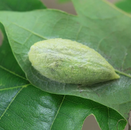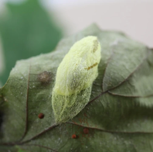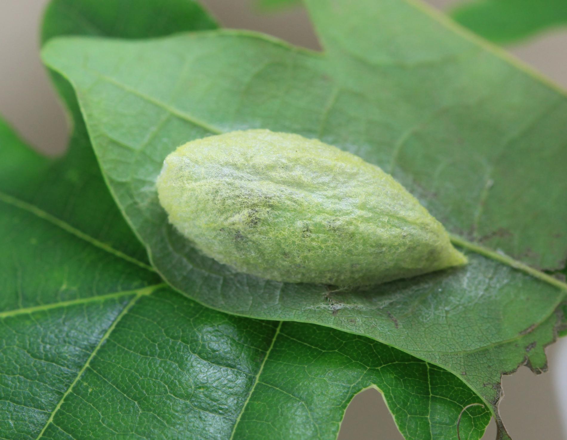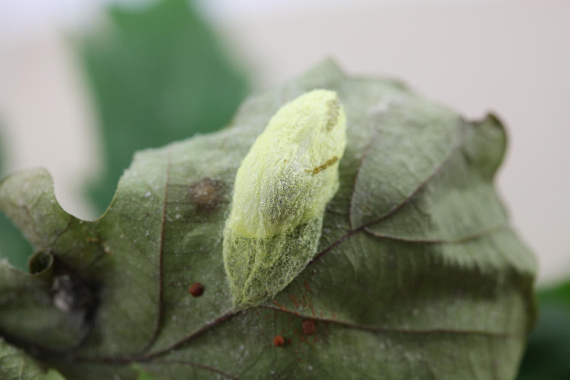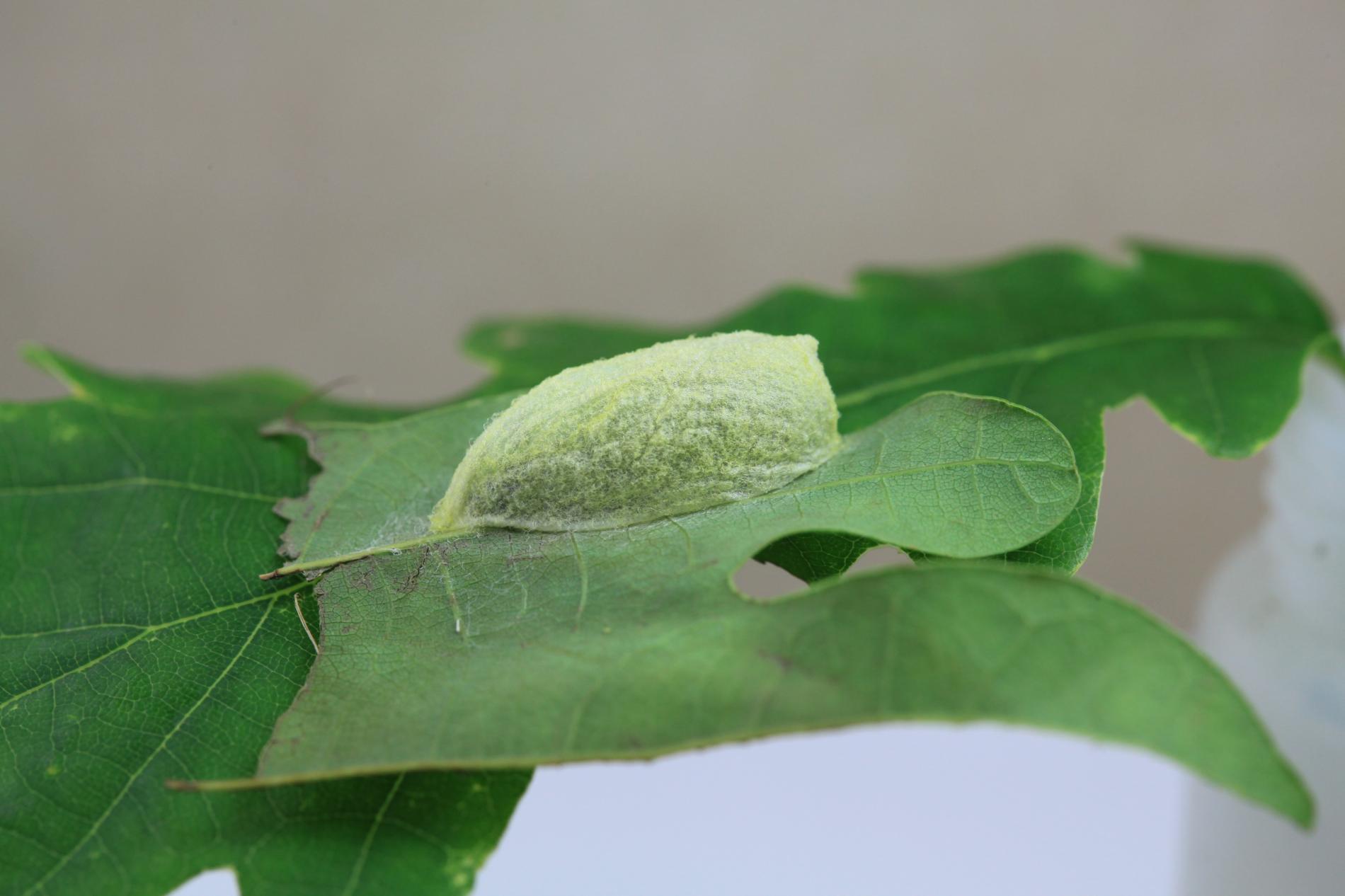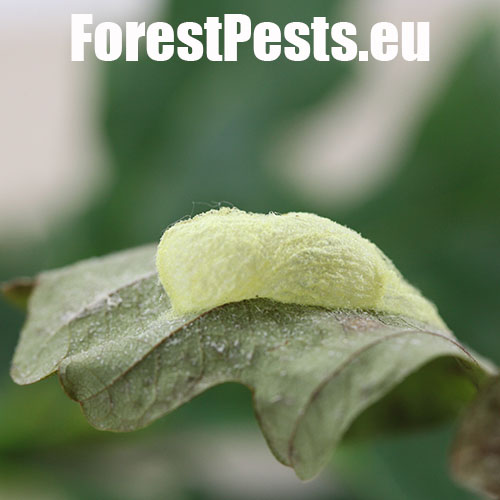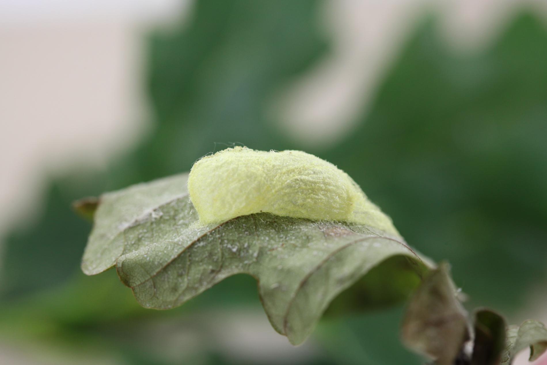 The caterpillar is green. She has a yellow stripe behind her head, is massive and often sits as if she has a ridge just behind her head. Eat in the upper parts of the crown. There are holes in the leaves, or they are eaten from the sides.