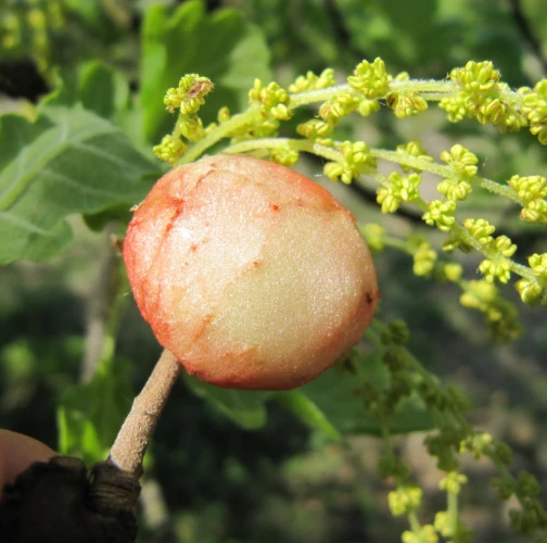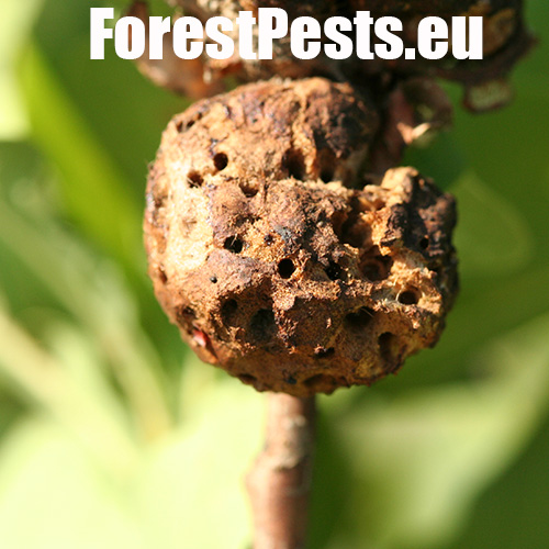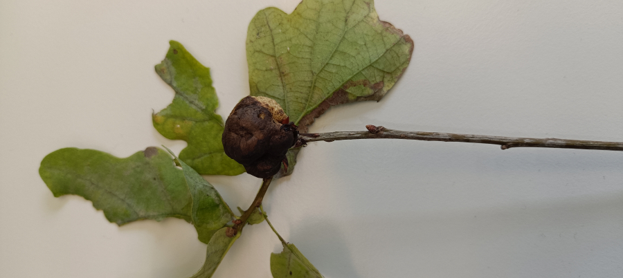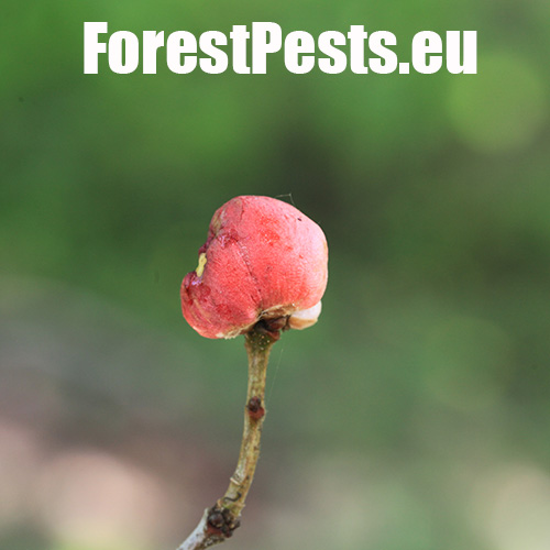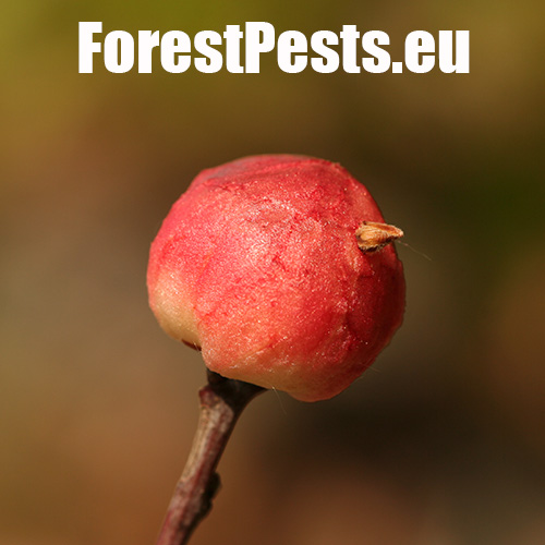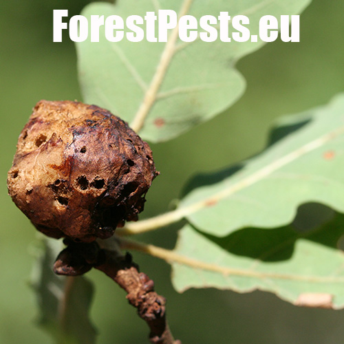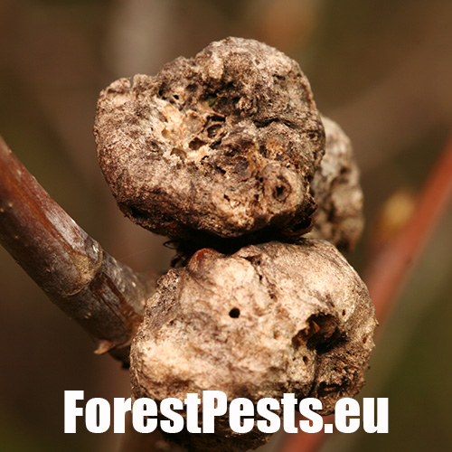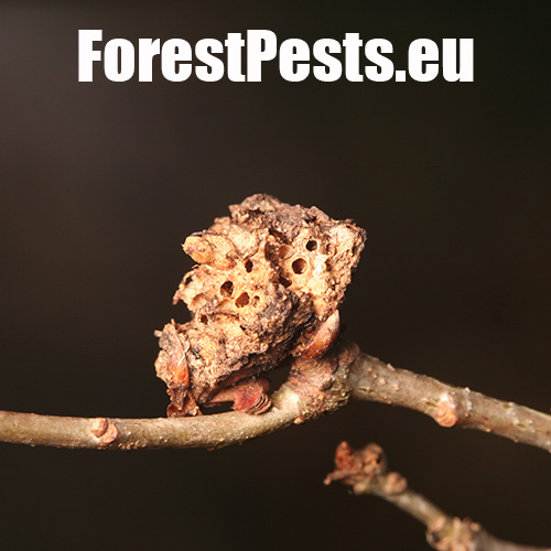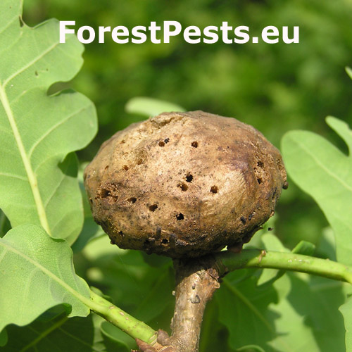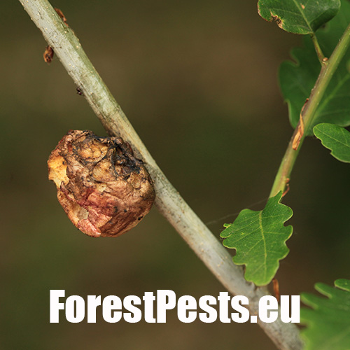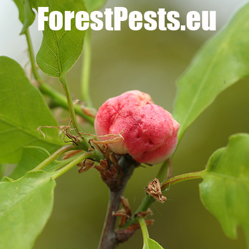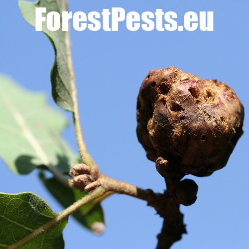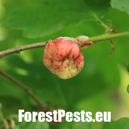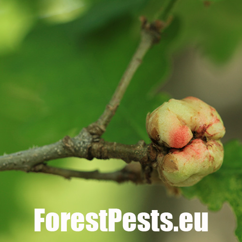 Wingless females (asexual generation) hatch in early spring, already in February. They lay eggs on twigs even at a temperature of around 0º C. When laying eggs, they give rise to the creating of a specific potato-like gall. In the gall live together several larvae. In summer, the larvae pupate inside the gall. Males and females (some of them winged, the other ones wingless) of the sexual generation hatch in July. After mating, the females lay eggs on oak roots where the asexual generation is developed in 5 mm long red crown galls.
