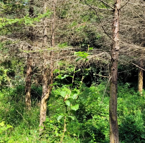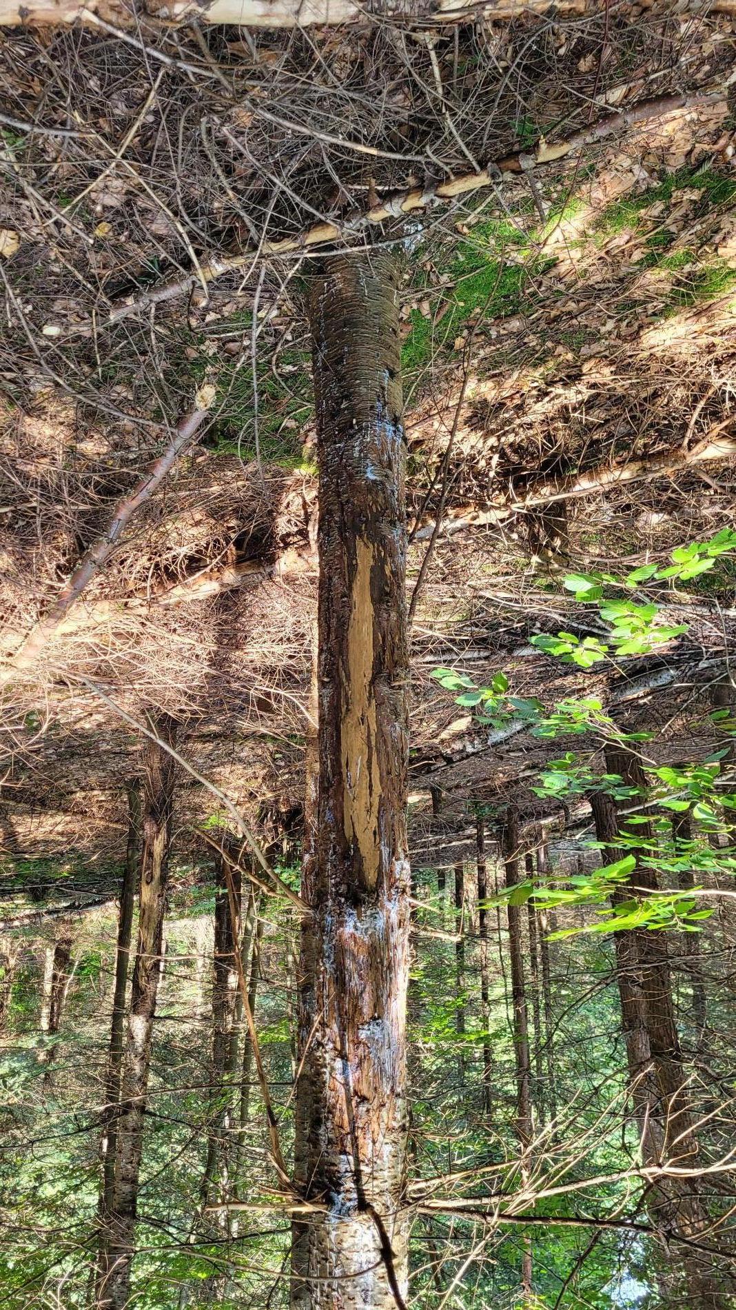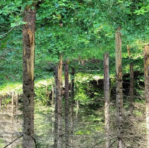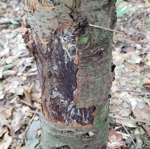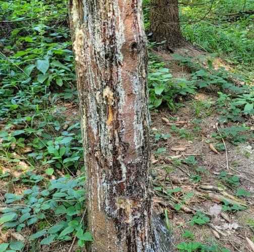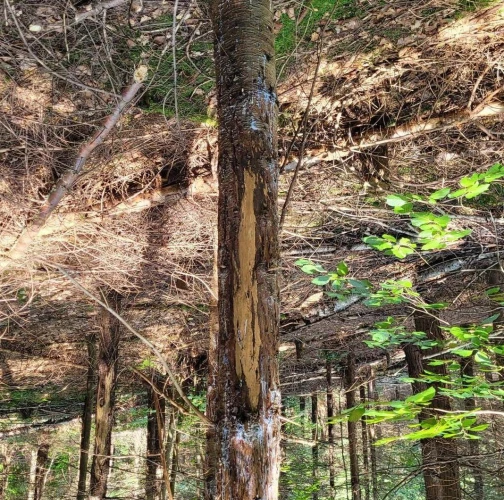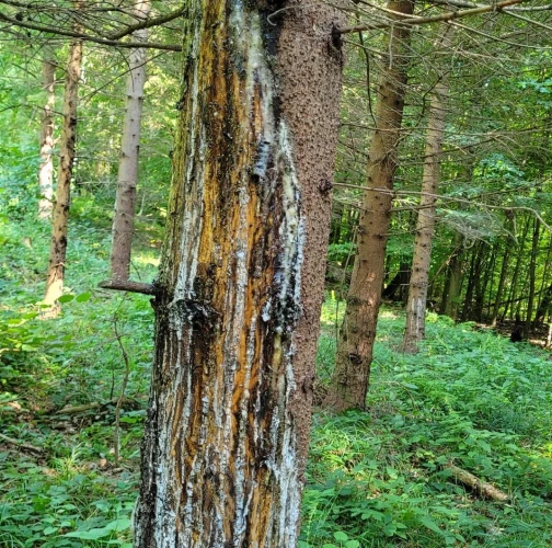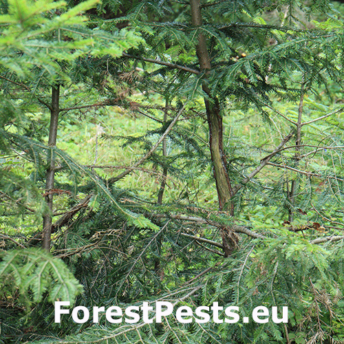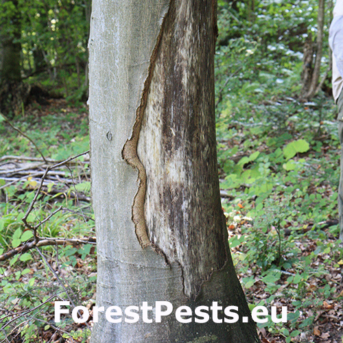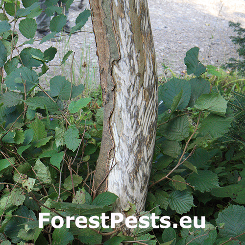 European bison consumes the bark, bast, and sapwood of trees by stripping. On the tree's trunk at the height of approximately 0.5 - 2 meter, there are clear traces of gnaws in the bast or sapwood part. A stripping can damage a part of the trunk girth, resulting in the physiological weakening of the damaged tree. In addition, fungal diseases can attack the tree as a secondary pest in the wound place. The availability of further secondary damages increases, and if the tree survives, the trunk quality is permanently reduced. If a bark stripping damages the entire circumference of the trunk, the conductive tissues are interrupted, and the damaged tree dies. Damaged trees are more susceptible to the attack by bark beetles. In the case of European bison bites, the width of the gnawing tracks is 2 cm and more.