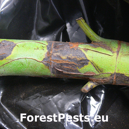 Botryosphaeria dothidea is a globally distributed fungal pathogen affecting a wide range of woody plants, including species such as Acacia, Eucalyptus, Vitis (grapevine), and Pistacia (pistachio). It is known to cause various diseases, including twig, branch, and stem cankers, tip and branch dieback, fruit rots, and, in severe cases, host plant death. The fungus often remains latent within host tissues, becoming pathogenic primarily when the plant is under stress from factors like drought, physical damage, or unsuitable growing conditions. In Europe, B. dothidea has been reported on multiple hosts, including Ostrya carpinifolia (European hop hornbeam), indicating its widespread presence across the continent. Infected plants may exhibit reduced vigor, dieback, and unsightly cankers, significantly impacting both their health and aesthetic appearance.