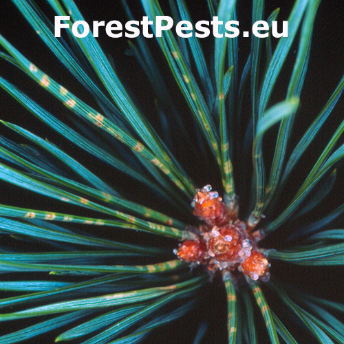 Brachonyx pineti, commonly known as the pine needle weevil, is a small beetle species, measuring between 2.0 to 2.5 mm. It primarily feeds on pine species, particularly Scots pine (Pinus sylvestris), Mountain pine (Pinus mugo), and Black pine (Pinus nigra). After overwintering in the forest litter, females lay eggs in young, swelling pine buds. The larvae mine inside the needles, creating winding corridors filled with dispersed brown frass. This results in needle swelling and stunted growth. The larvae pupate in the needle sheath, and the mined needles often turn brown, fail to grow fully, and may fall off. The weevil is distributed across Europe, where it is typically found on weakened or stressed pine trees.