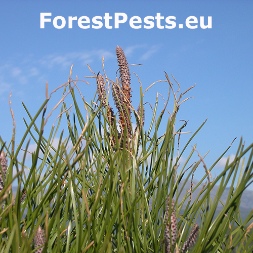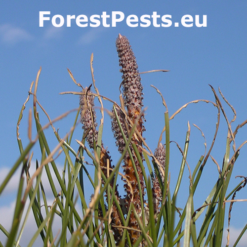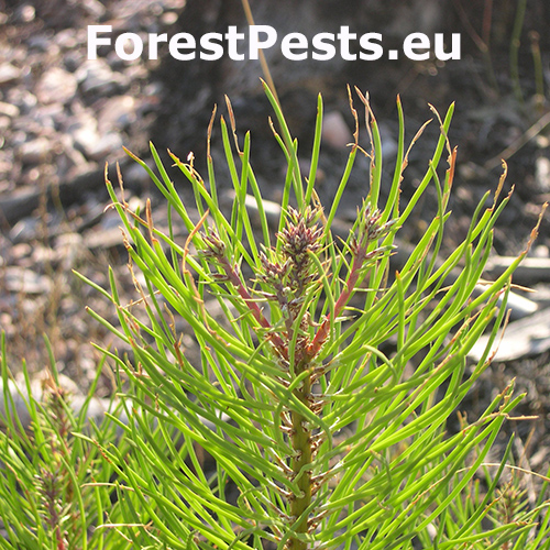 Infestations result in needle damage caused by adult feeding, as well as root damage by larvae, which can weaken the plant's overall health and growth, particularly in young pines.
