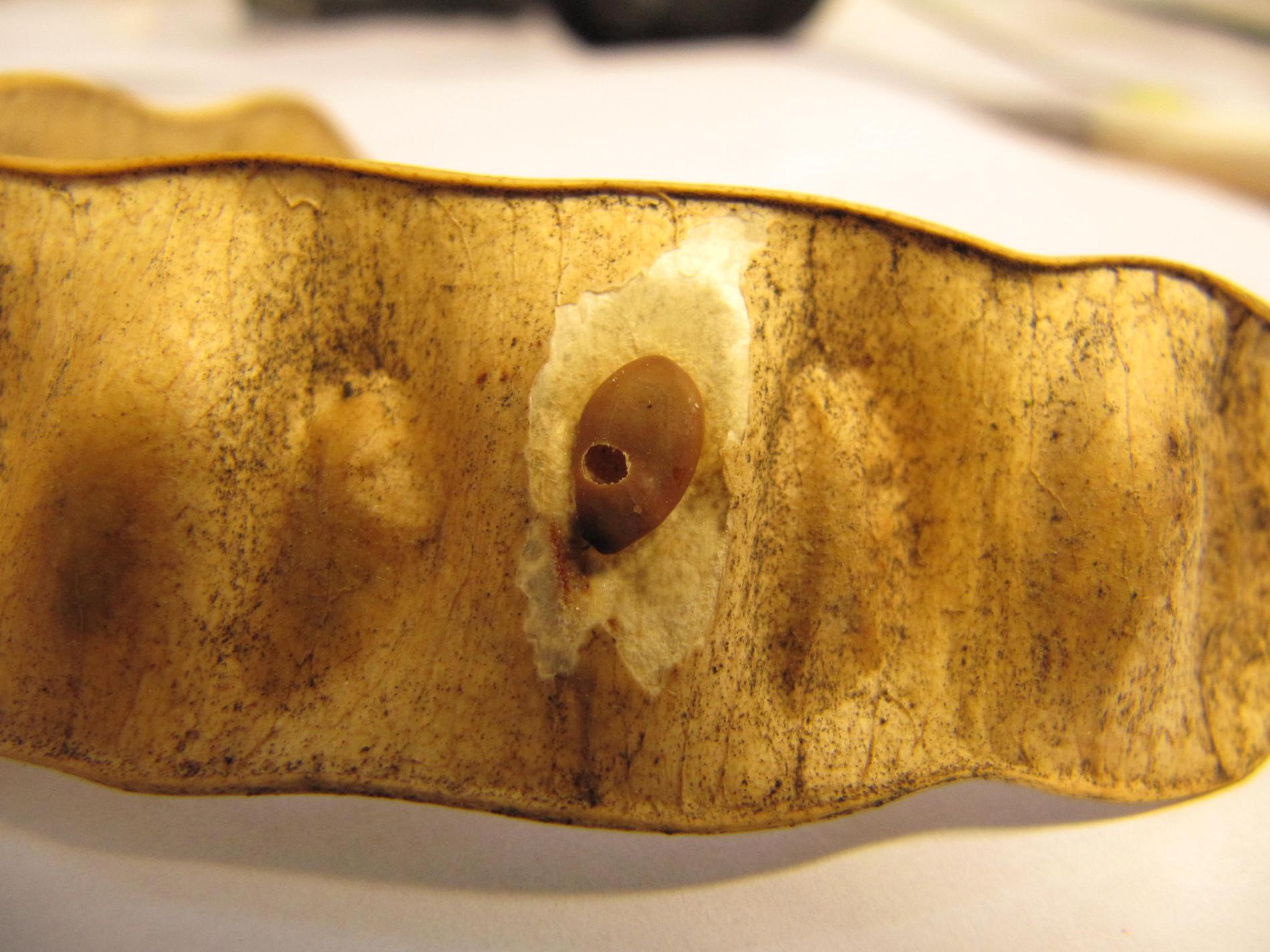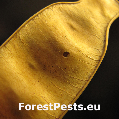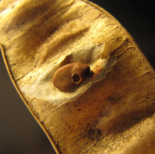 Infested seed pods display small circular exit holes from which adult beetles emerge. The seeds inside are hollowed out, often with visible frass. Pods may appear shriveled or damaged.