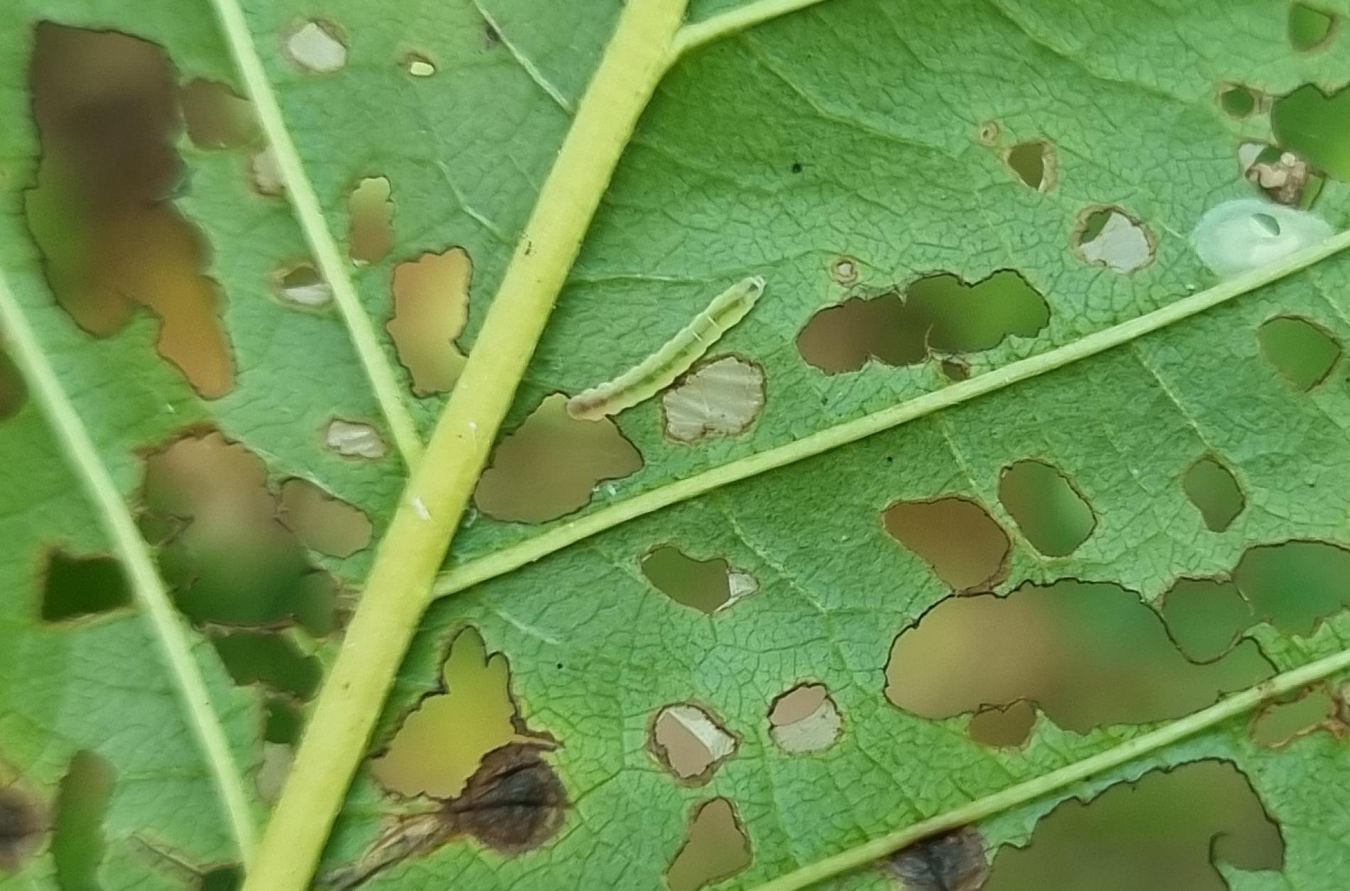 Spiral leaf mines filled with dark frass; later small translucent windows on the underside of leaves, which may merge so that only the veins remain.