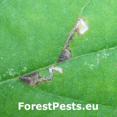 Leaves contain small, hook-like mines near vein junctions, later forming a narrow corridor along the vein. External feeding results in characteristic window-like damage on the underside of leaves, leading to discoloration and premature leaf drop.