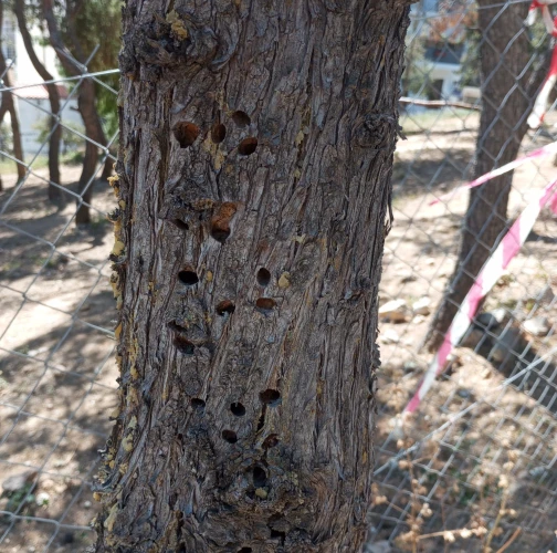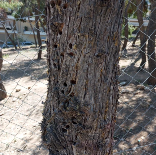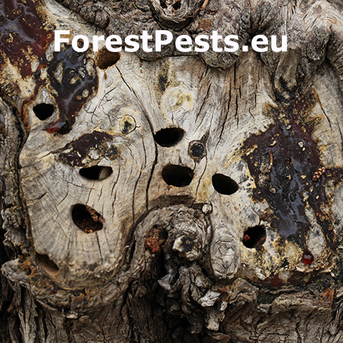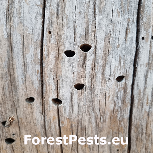 Infested trees show bark cracks and resin leaks. Beneath the bark, larval galleries filled with frass are visible, winding irregularly. Branches may exhibit localized dieback, and the bark may detach in severe cases. Dark beetlas on stem and many exit holes – D shaped.