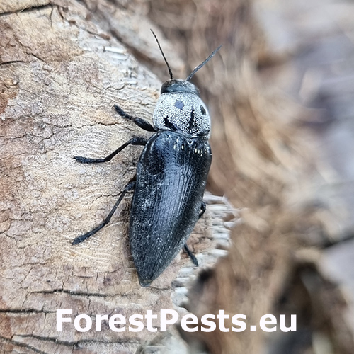 This species is distributed across southern and central Europe, where it is commonly found in regions with dry and warm climates. Adult beetles are dark, metallic and feed on bark and needles, causing minor damage to the tree’s appearance. However, larval feeding can lead to more severe aesthetic damage, such as bark cracks and resin leaks, impacting the overall health and appearance of affected trees. Heavy infestation can cause tree dieback.