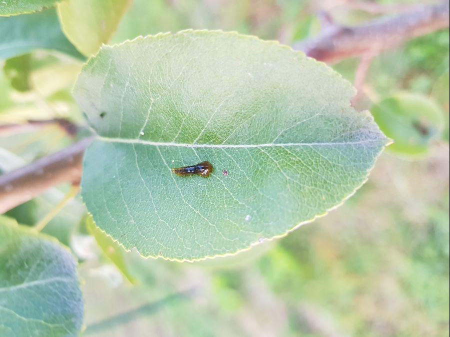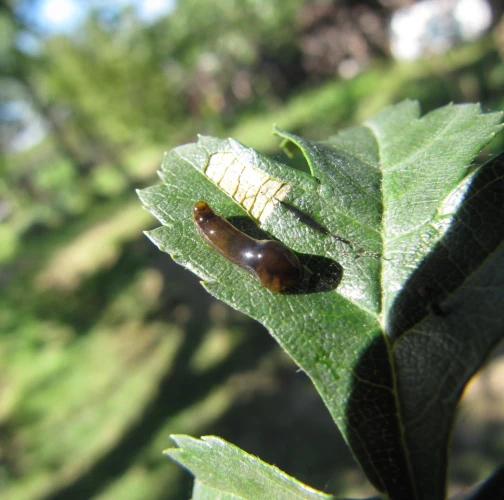 The slug shaped larvae are brown-yellow or bottle green colored, covered by dark slime exuding from their skin. They feed on the upper surface of leaves causing large skeletonized patches.