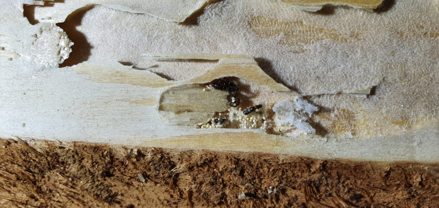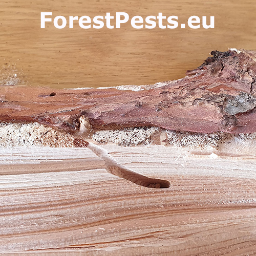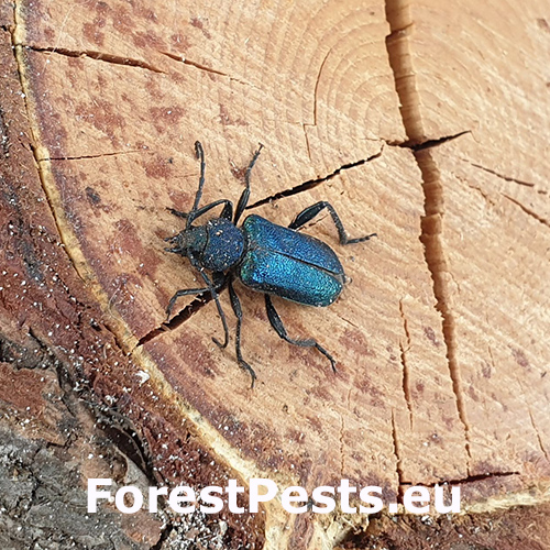 Splendid, metallic colored beetle, size 8 to 18 mm. The female lays eggs in crevices in the bark - they prefer timber with bark. Larvae are 16 to 26 mm in size, excavate expanding corridors under the bark, later on they pupate in the wood. Larvae development takes from 1 to 3 years. This species is a common pest in a wood warehouses, where it attacks timber stored with bark. If timber is debarked, such a wood is not attacked.