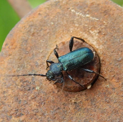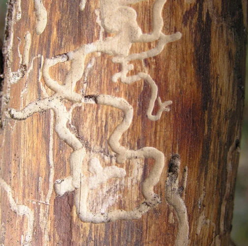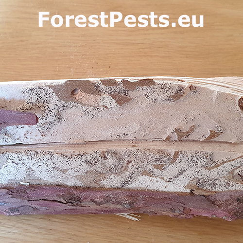 Splendid, metallic colored beetle. Creamy white larvae feeding under the bark in the corridor cut a few millimeters into the wood and later go to pupate chamber through a hook corridor 1 to 4 cm into the wood. The whitish crumbs have the form of semolina with small dark grains of dung. Excavation holes are elliptical.