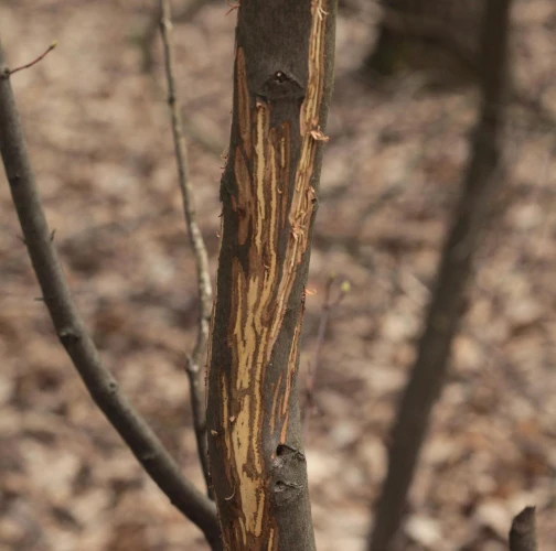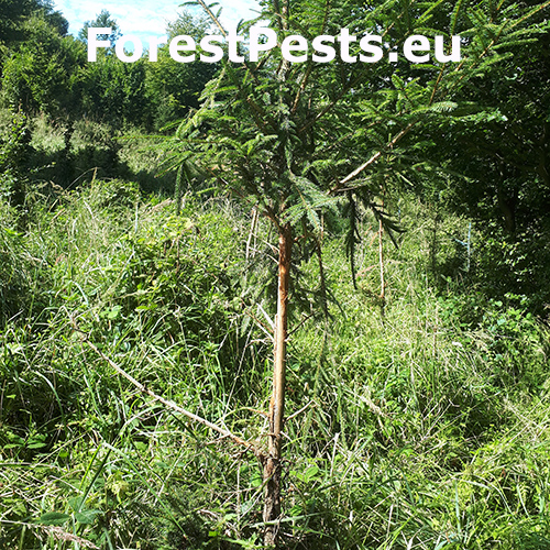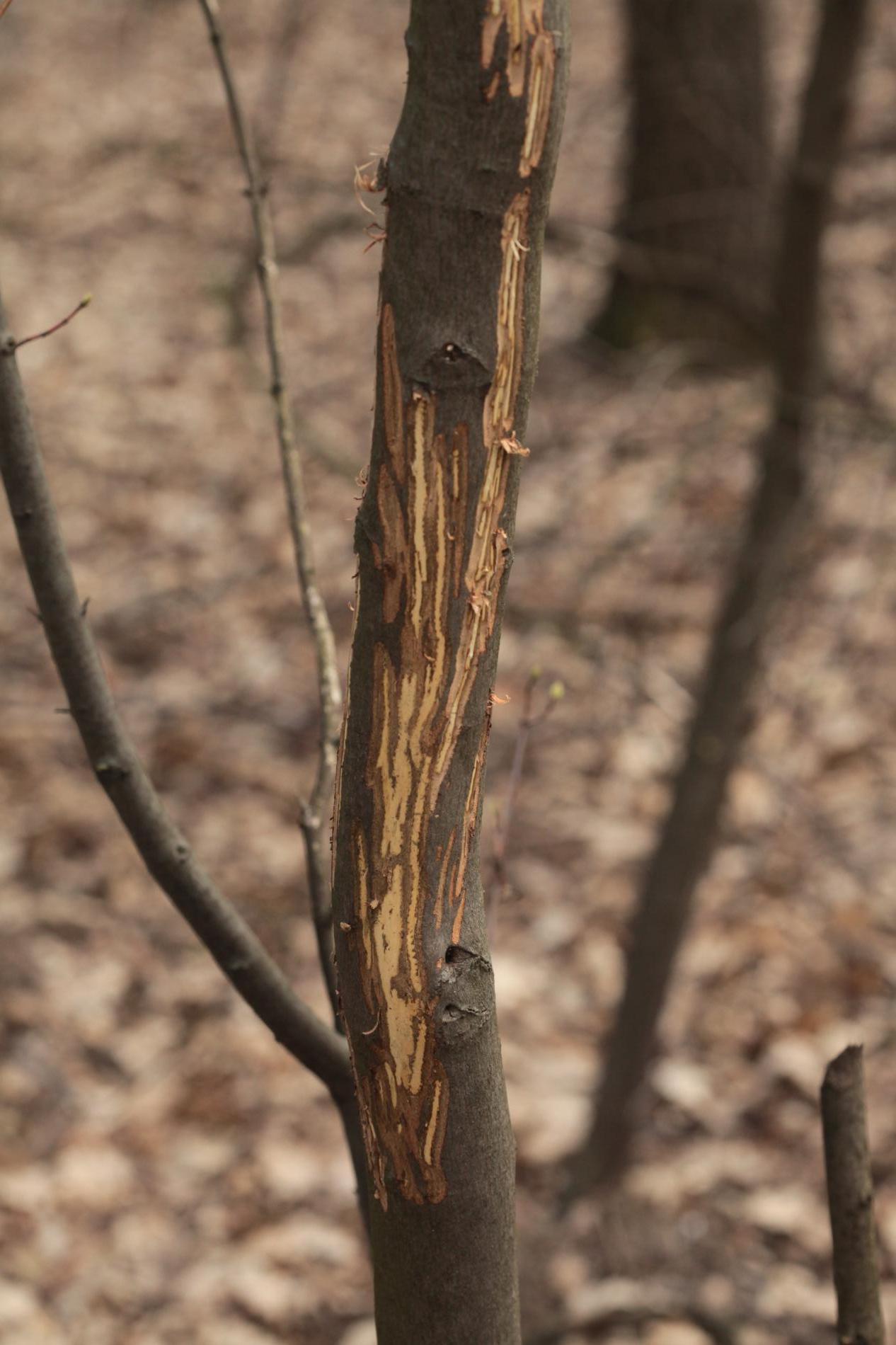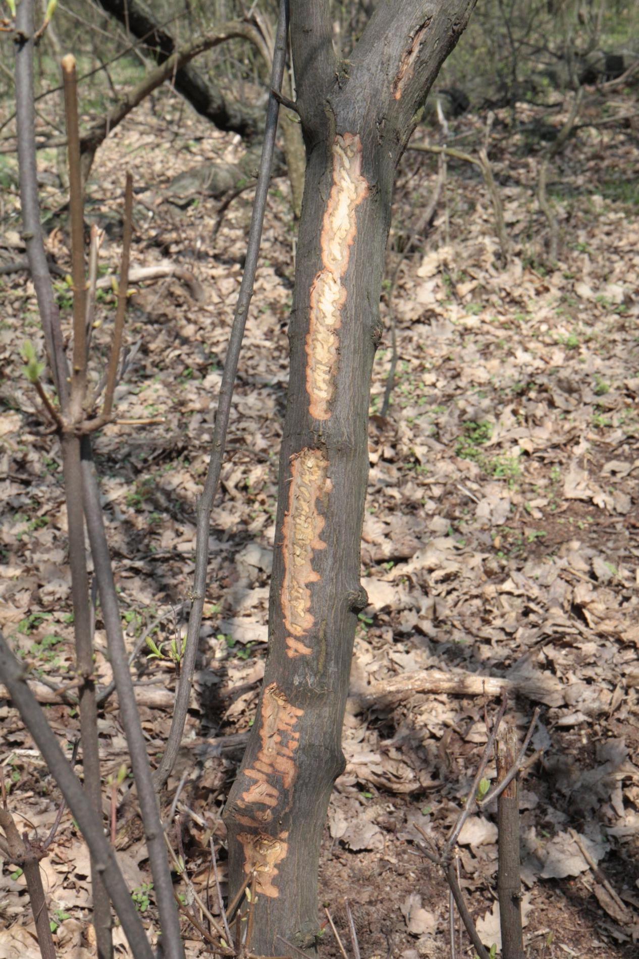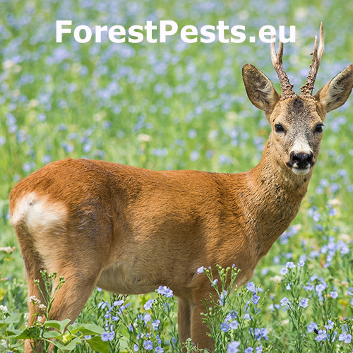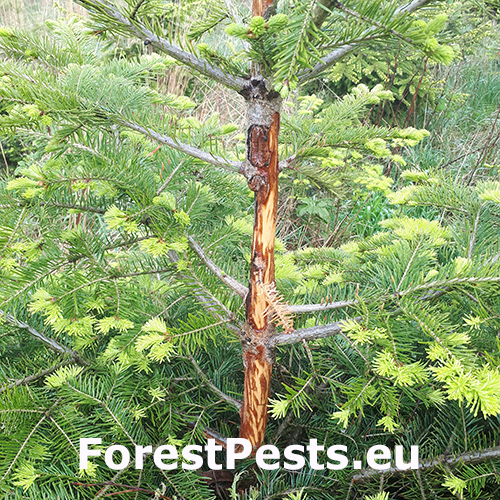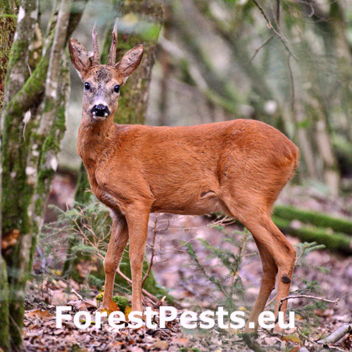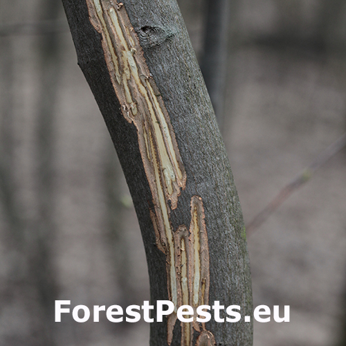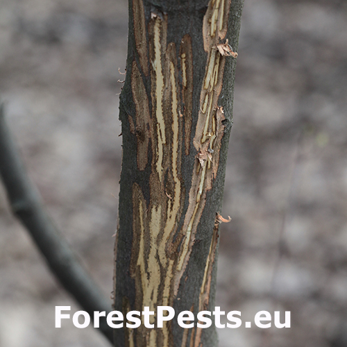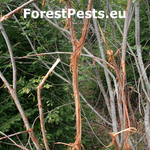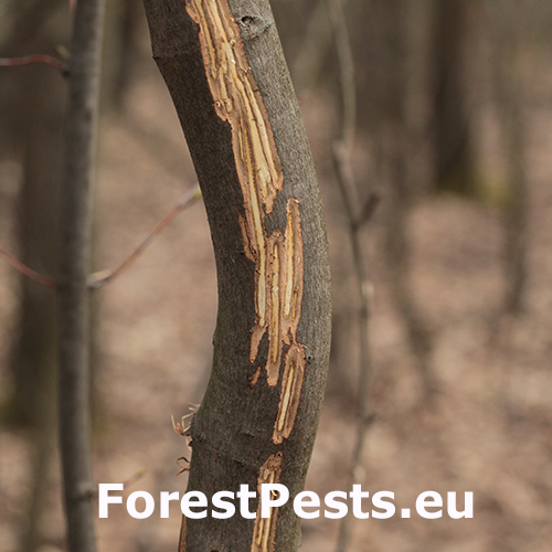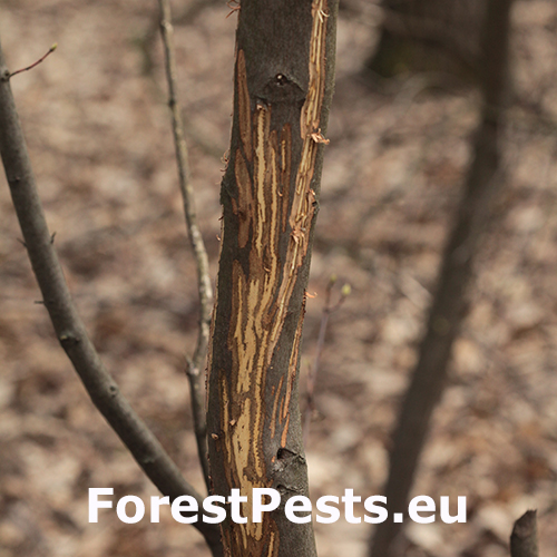 The Roe deer damages and consumes the bark, bast, and sapwood of trees by stripping. On the tree's trunk at the height of approximately 1 - 1.5 meter, there are clear traces of gnaws in the bast or sapwood part. A stripping can damage a part of the trunk girth, resulting in the physiological weakening of the damaged individual. In addition, fungal diseases can attack the tree as a secondary pest in the wound place. The availability of further secondary damages increases, and if the tree survives, the trunk quality is permanently reduced. If a bark stripping damages the entire circumference of the trunk, the conductive tissues are interrupted, and the damaged tree dies. In the spring (April - June) - the period of sap flow, the Roe deer also damages the trunk by peeling. It peels 50 centimeter strips of bark on trunks to a height of approximately 1 – 1.5 m. The sapwood layer remains exposed. The branches are not damaged.