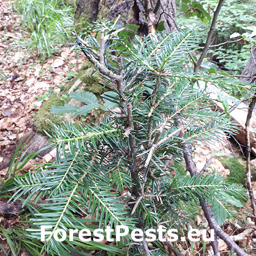 Young annual shoots are damaged and subsequently consumed by browsing, or only the end parts on older trees. During the summer browsing, the leaves are consumed along with the annual shoots, and during the winter browsing, which is more harmful, the Roe deer consumes buds and needles. The side twigs are damaged, as well as the terminal part of the tree. Repeated intense browsing associated with damage to the top of the tree leads to a significant slowdown in growth or even death of the tree. Browsing is especially harmful to seedlings. Repeated intensive browsing slows the growth, forming conical - pyramidal tree shapes.
