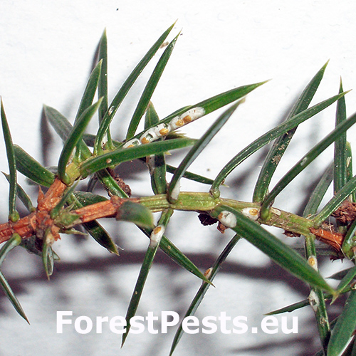 Infested needles show yellowing (chlorosis), premature drying, and shedding. Dense colonies are visible on twigs and needles, leaving dead scale shells behind, often covering the plant surface.