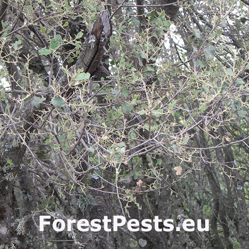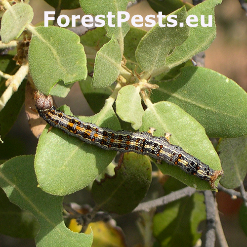 Infested trees exhibit chewed leaves, particularly on evergreen oaks like Quercus ilex. Leaf edges are irregularly damaged, and severe infestations may lead to partial defoliation.