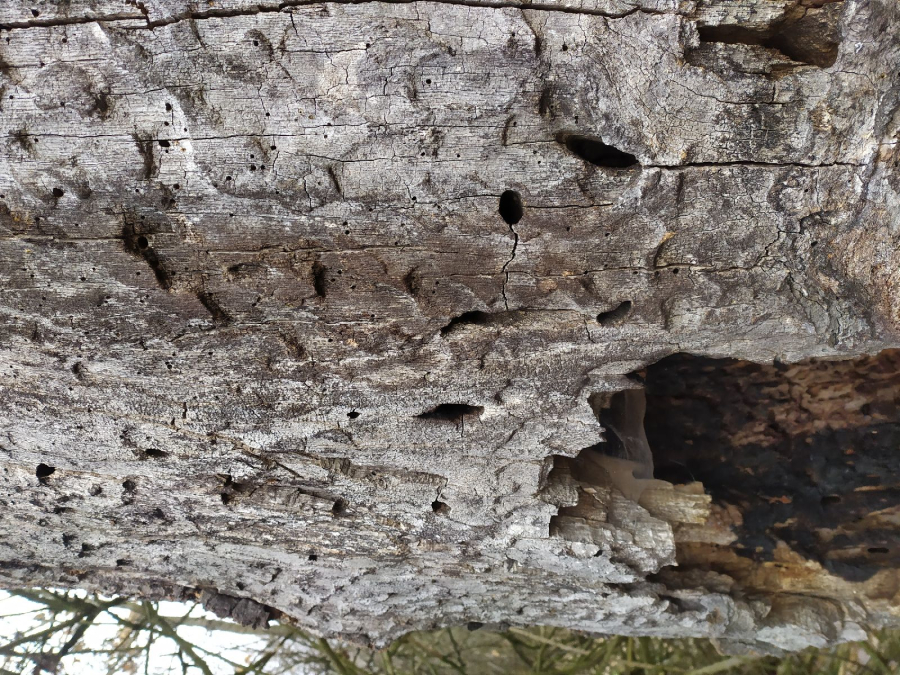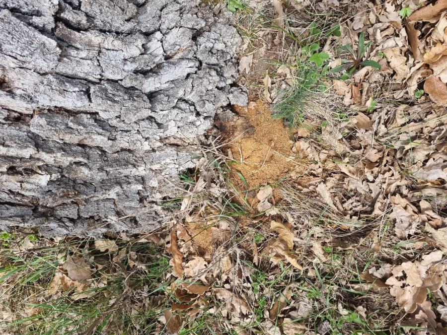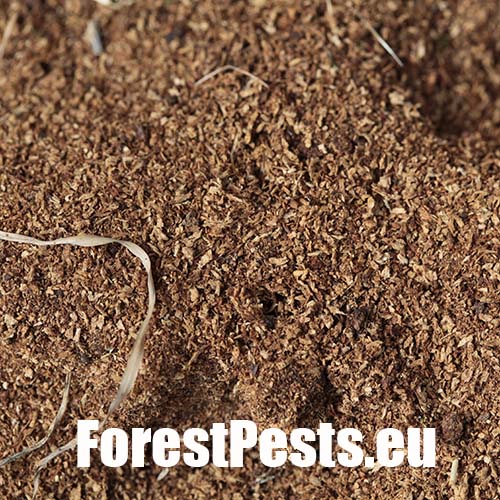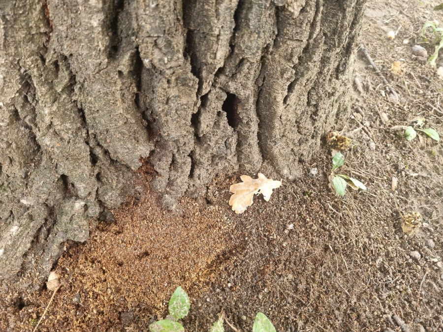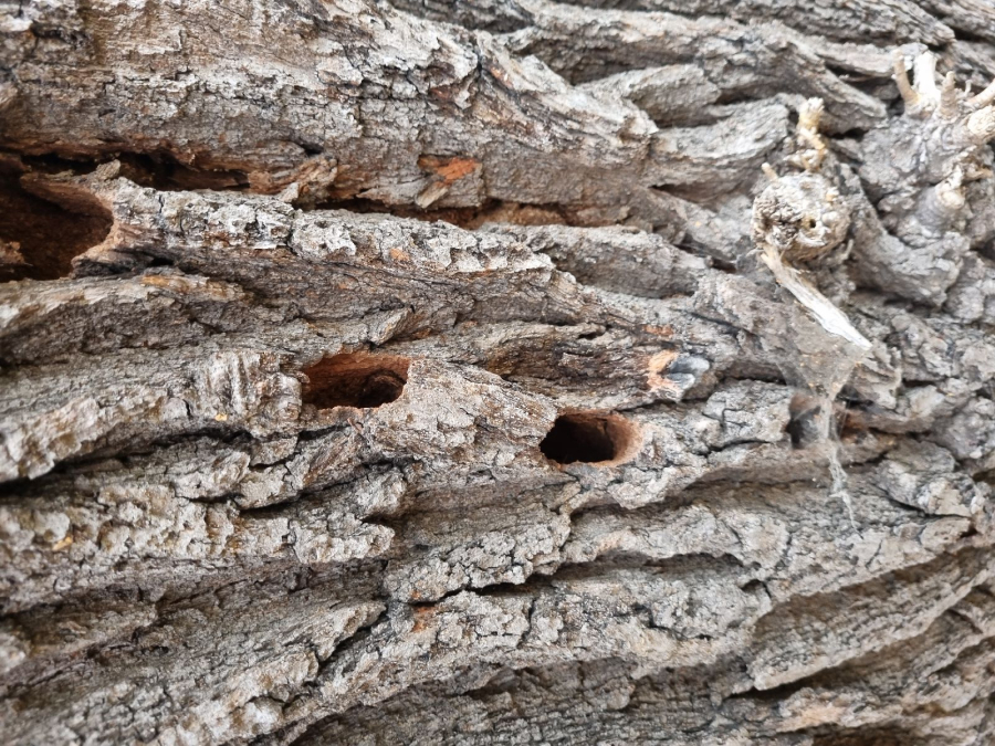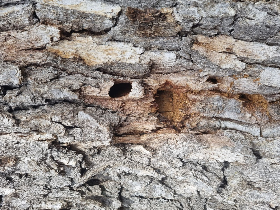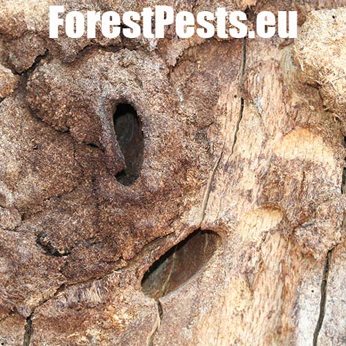 Larval galleries are long, irregular and widen as the larvae increase in size. A large amount of woodchips accumulates at bottom of the trunk. Huge exit holes on stems.