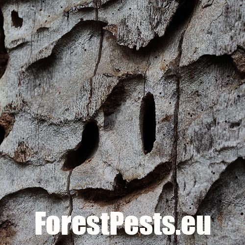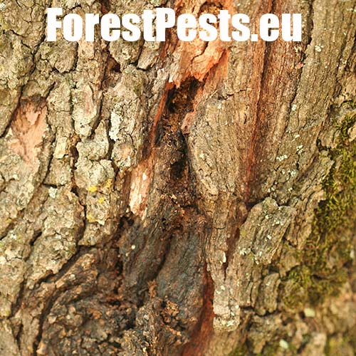 One of the largest beetles in Europe. Adult beetles are 24 to 53 mm long, with a blackish body and legs. Male antennae are twice as long as the body, while those of the female extend to the elytral apex. Females of several generations lay eggs on the same tree trunk which is later on bored by a maze of galleries. The larva feeds subcortically during the first year and moves into wood and sapwood in the second year. Larval galleries are long, irregular and widen as the larvae increase in size. A large amount of woodchips accumulates at bottom of the trunk. Pupation occurs in the sapwood (approximately 80 mm deep) in a large, elongate, oval pupal cell. Exit holes are oval, up to 2 cm in diameter. The species does not attack healthy trees but technically damages wood of dying trees. It develops in old oak stands or in old solitary trees.