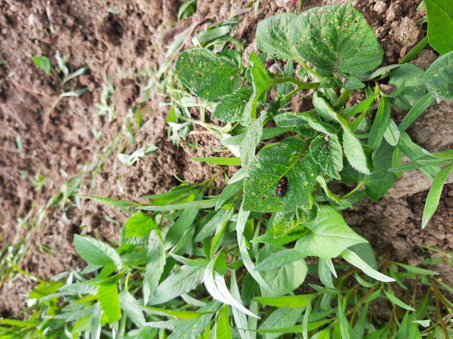 A colourful bug. A truly unmistakable species. In apple orchards, the adults can cause characteristic damage to the upper surface of the foliage. These typically angular leaf marking are at first greenish yellow, but later on turn brownish. There may be several hundreds such marks on a single leaf.