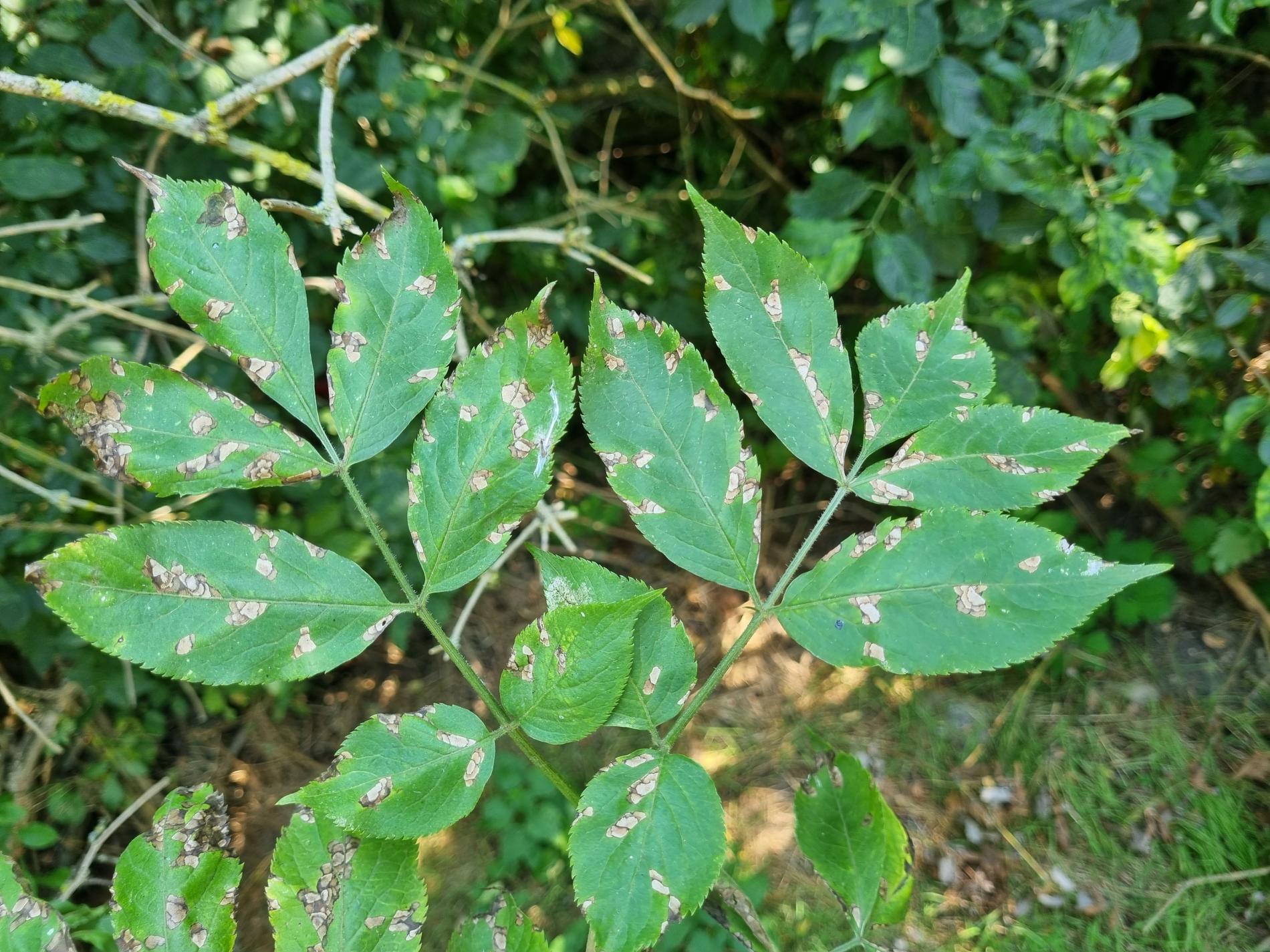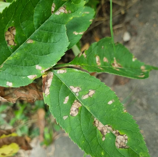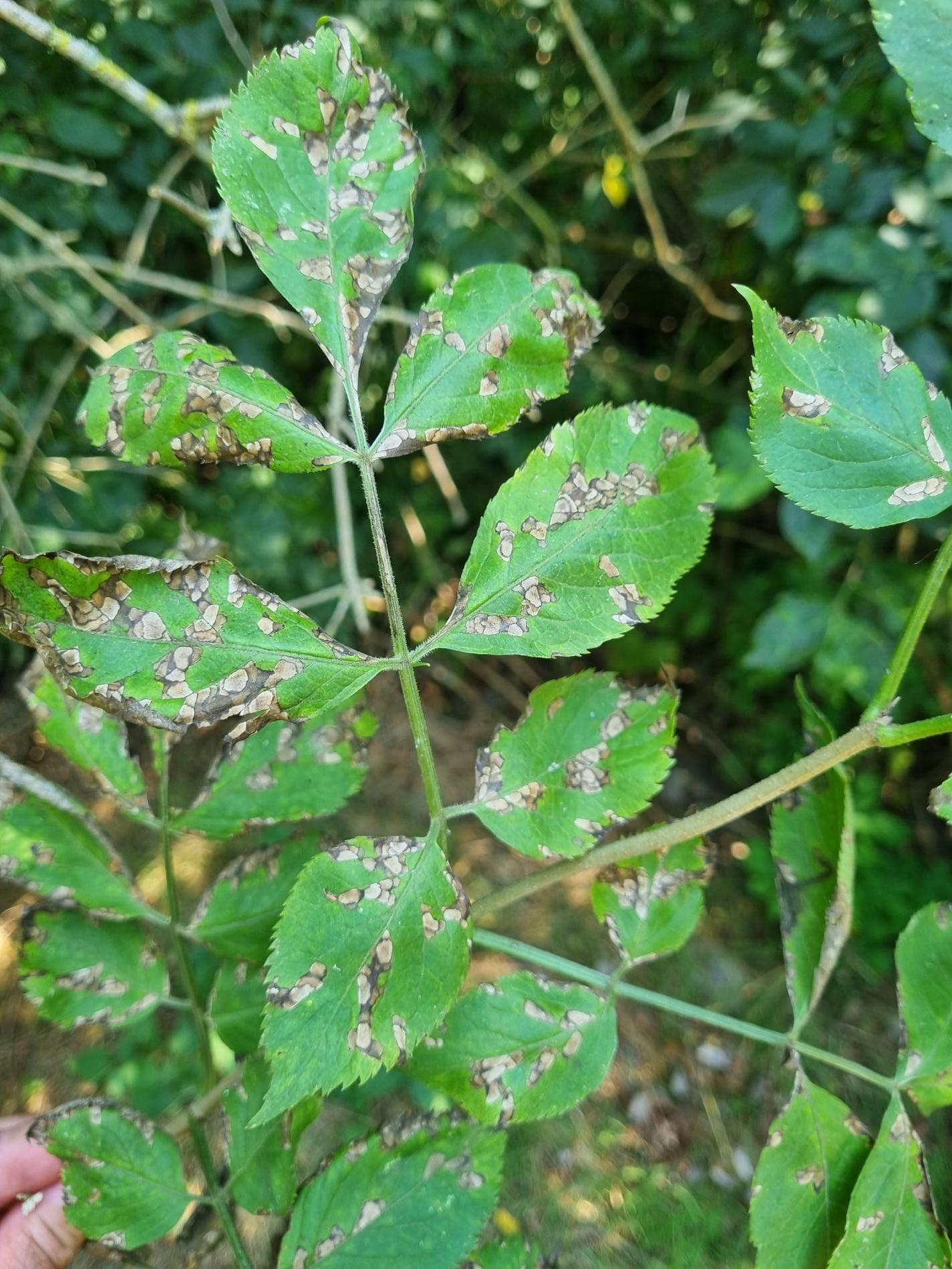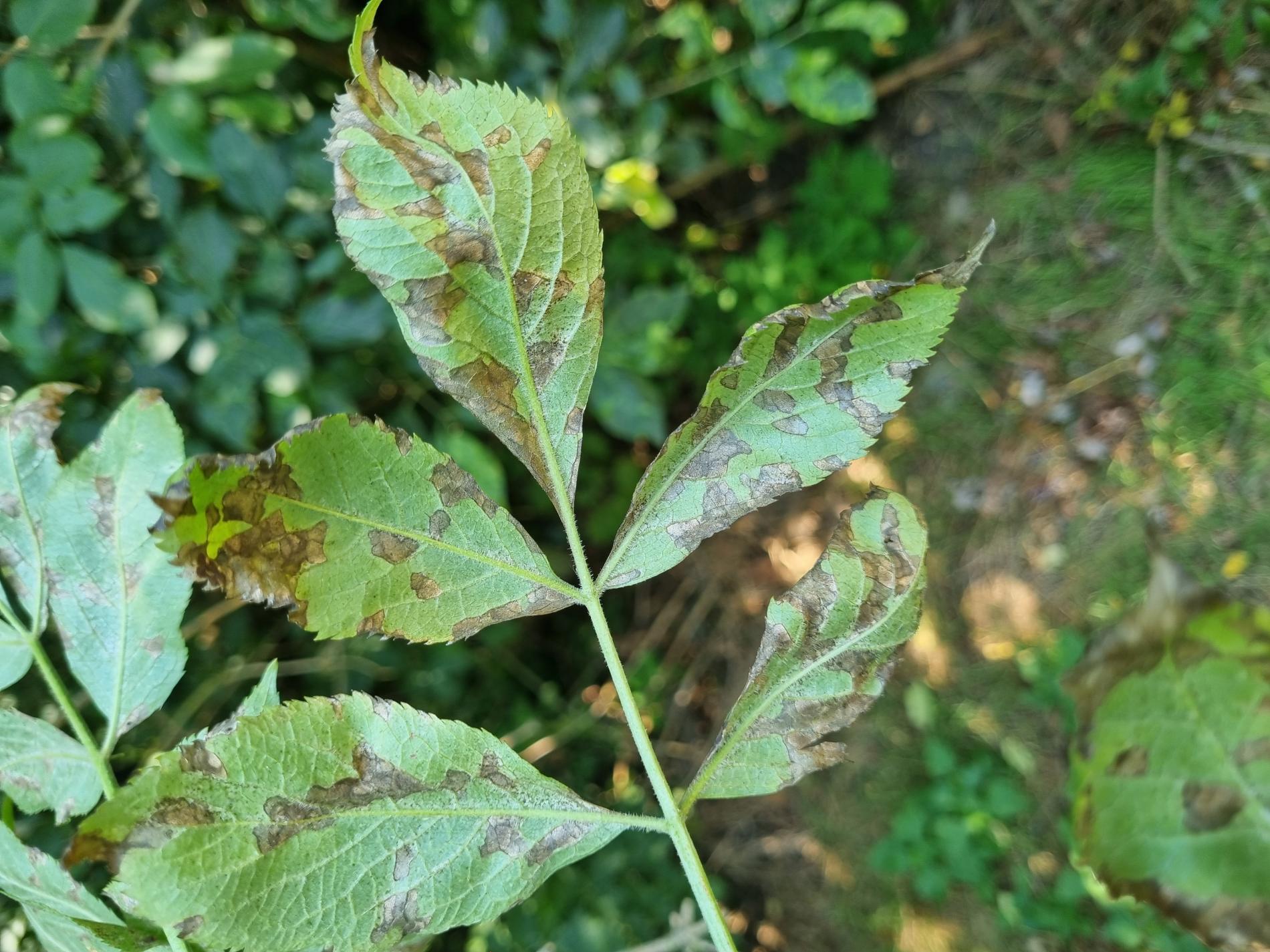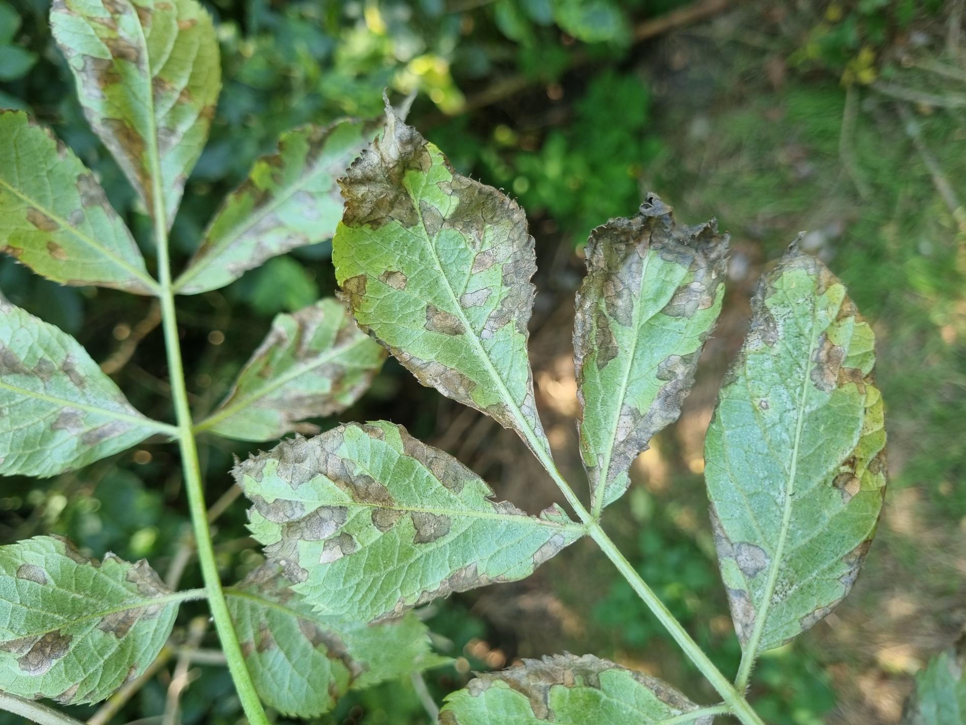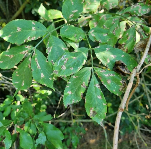 Cercospora depazeoides is a fungal pathogen that affects elder plants (Sambucus spp.). It causes leaf spots and lesions, leading to premature leaf drop and reduced photosynthesis. The disease is characterized by small, dark, irregularly shaped spots on the leaves, which can merge and cause significant defoliation. This can weaken the plant, impacting its growth and fruit production. Proper management includes removing infected leaves and ensuring good air circulation to reduce humidity around the plants.