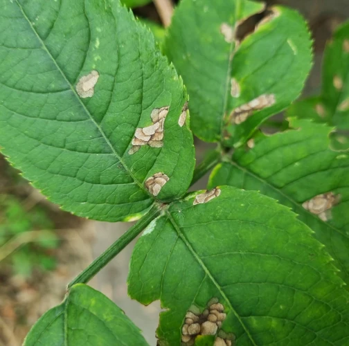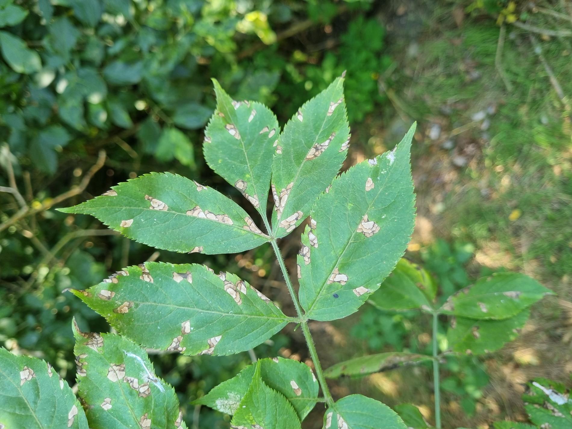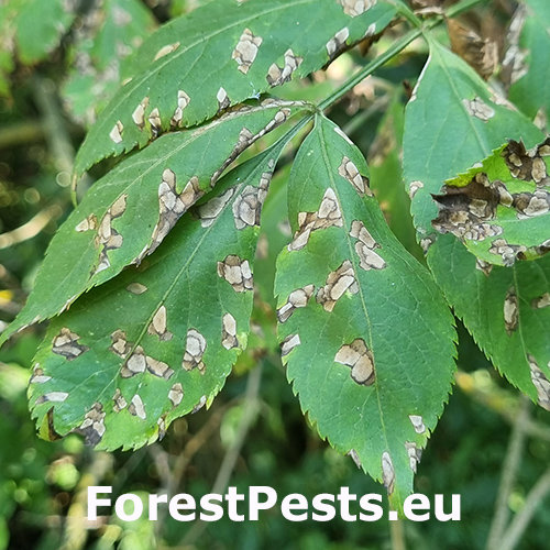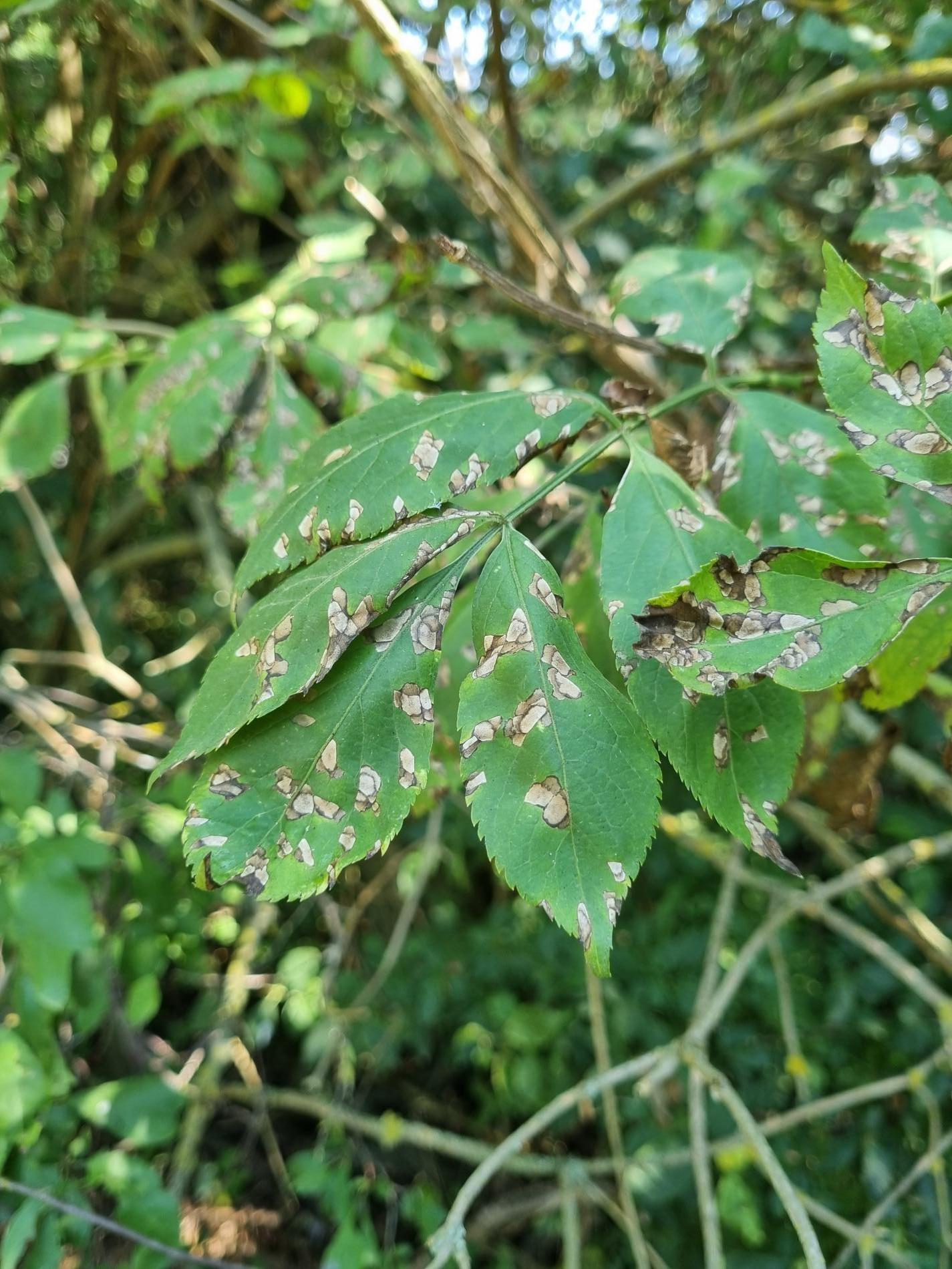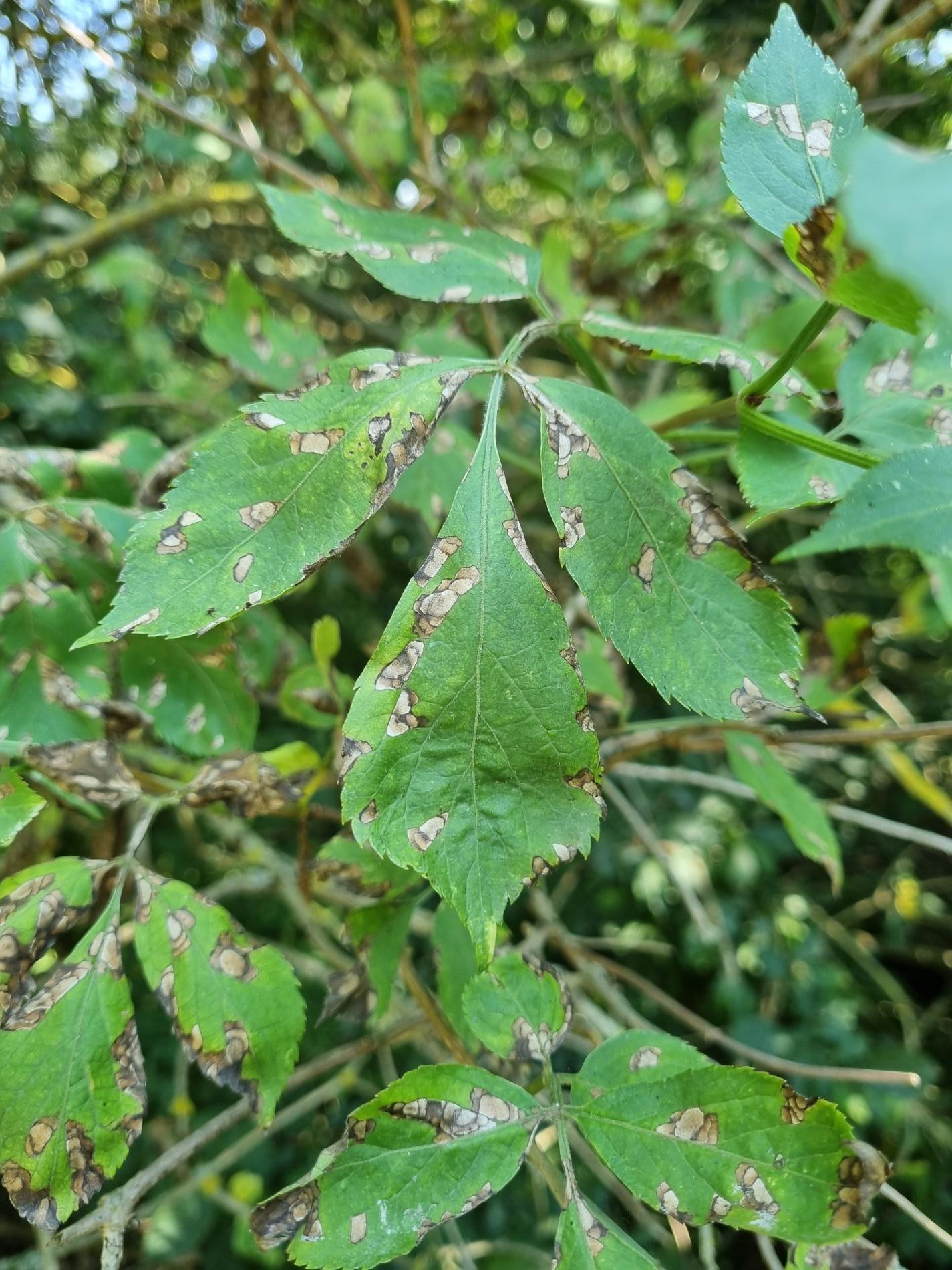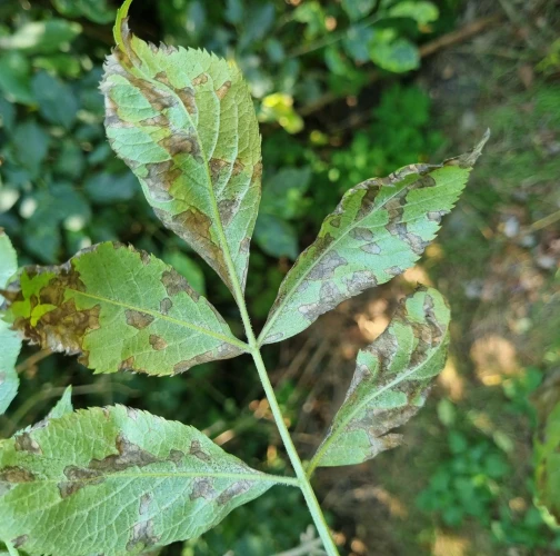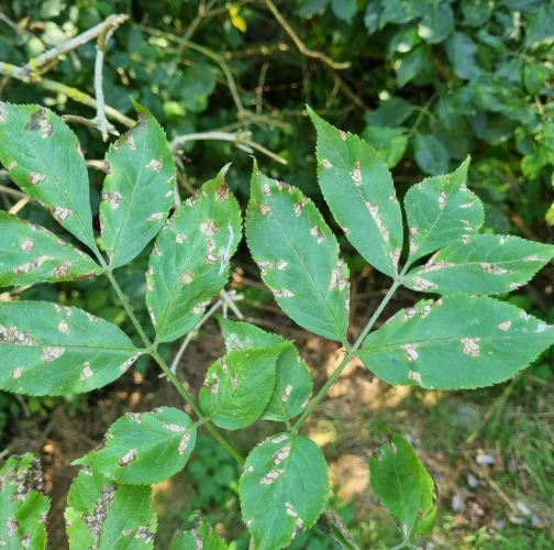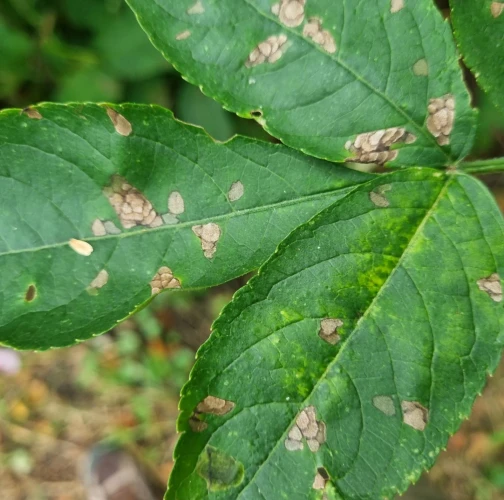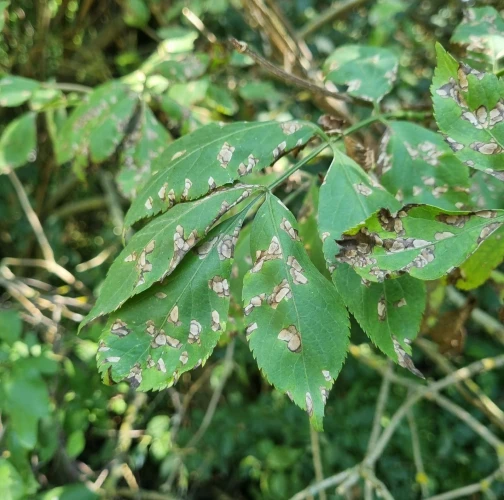 Cercospora depazeoides is a fungal pathogen that affects elder plants (Sambucus spp.). It causes leaf spots and lesions, leading to premature leaf drop and reduced photosynthesis. The disease is characterized by small, dark, irregularly shaped spots on the leaves, which can merge and cause significant defoliation. This can weaken the plant, impacting its growth and fruit production. Proper management includes removing infected leaves and ensuring good air circulation to reduce humidity around the plants.