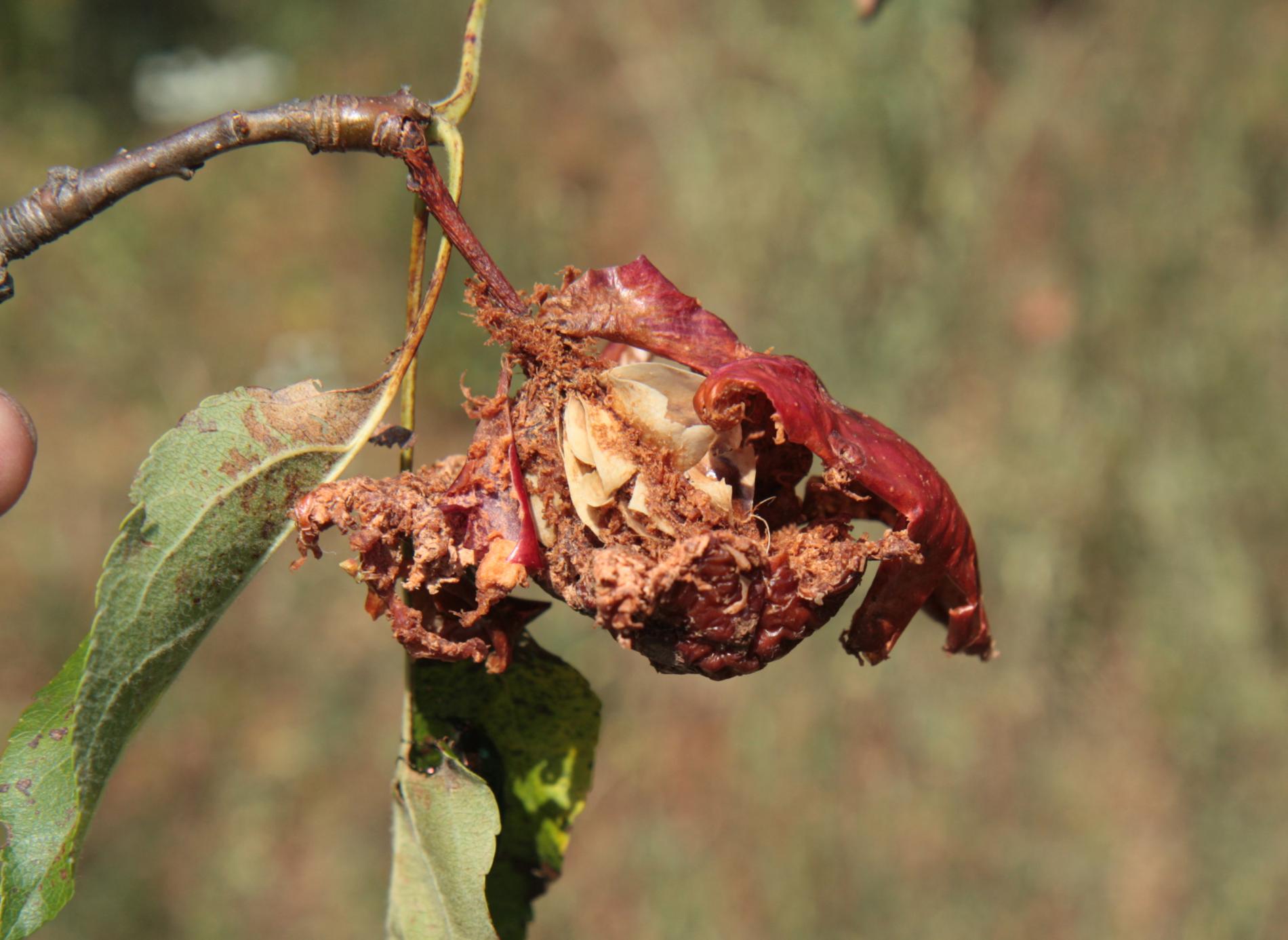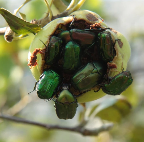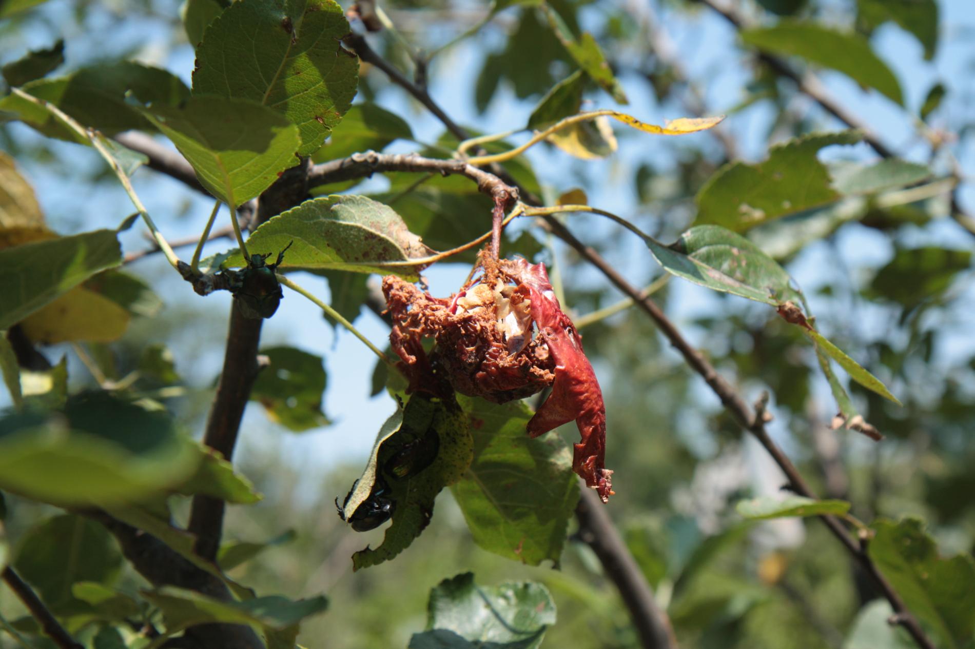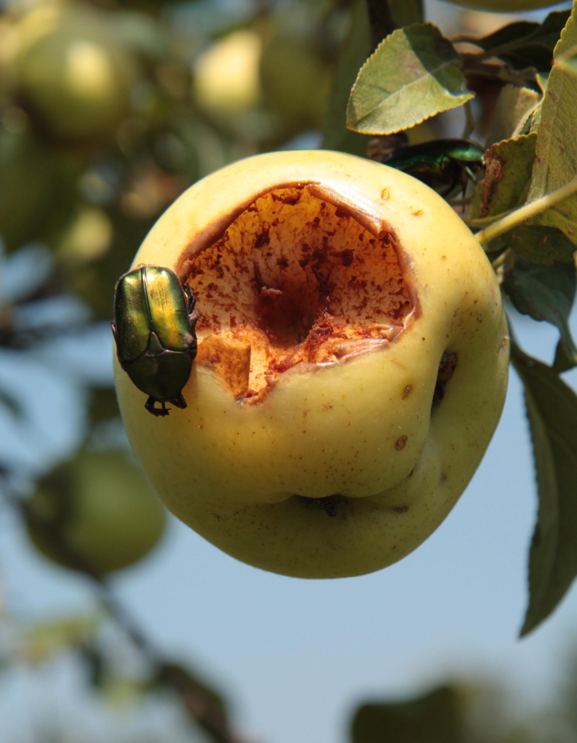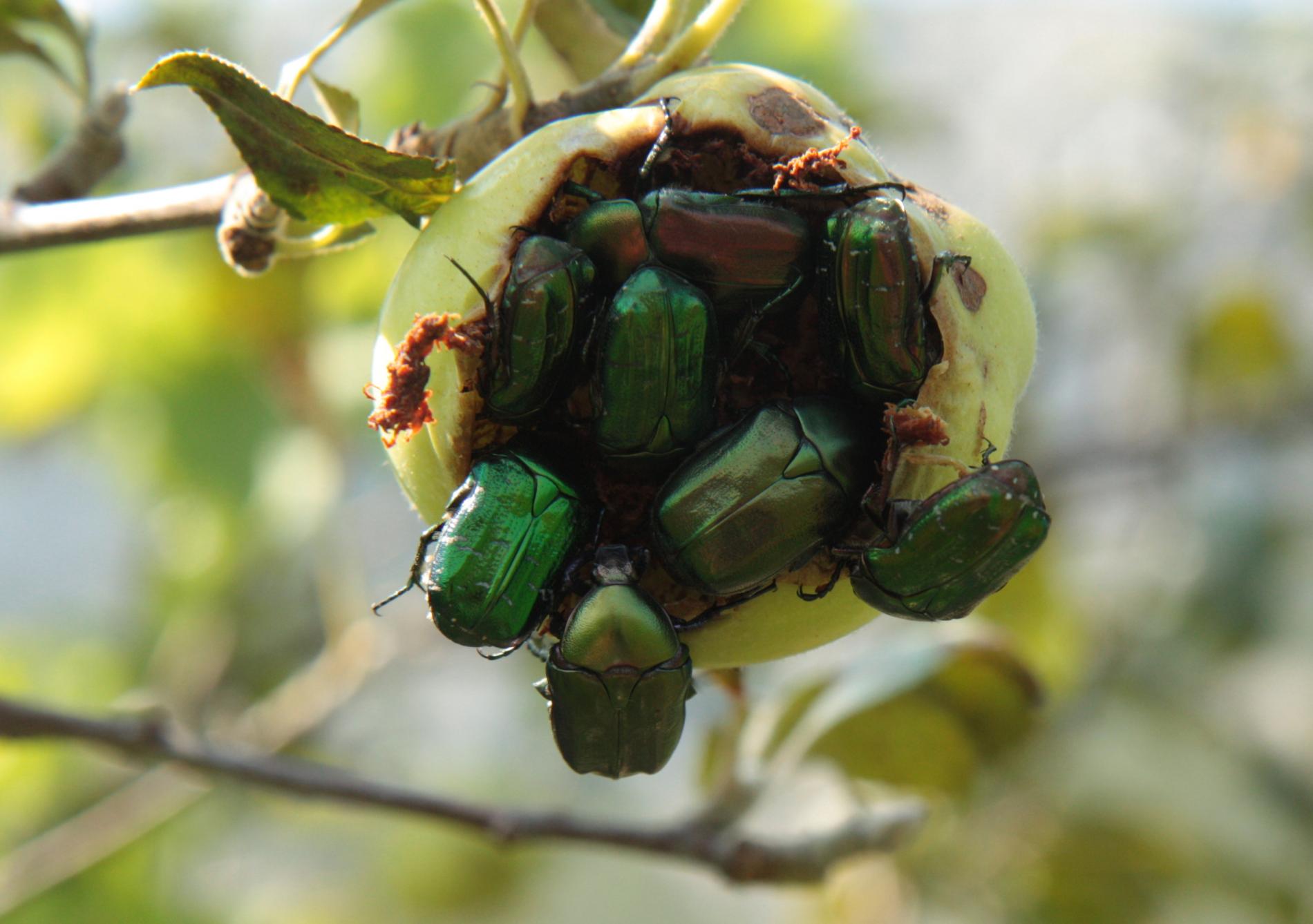 Fruit damage. Pits, cavities, consumed whole fruits. Metallic shiny, medium-sized beetles on fruit.