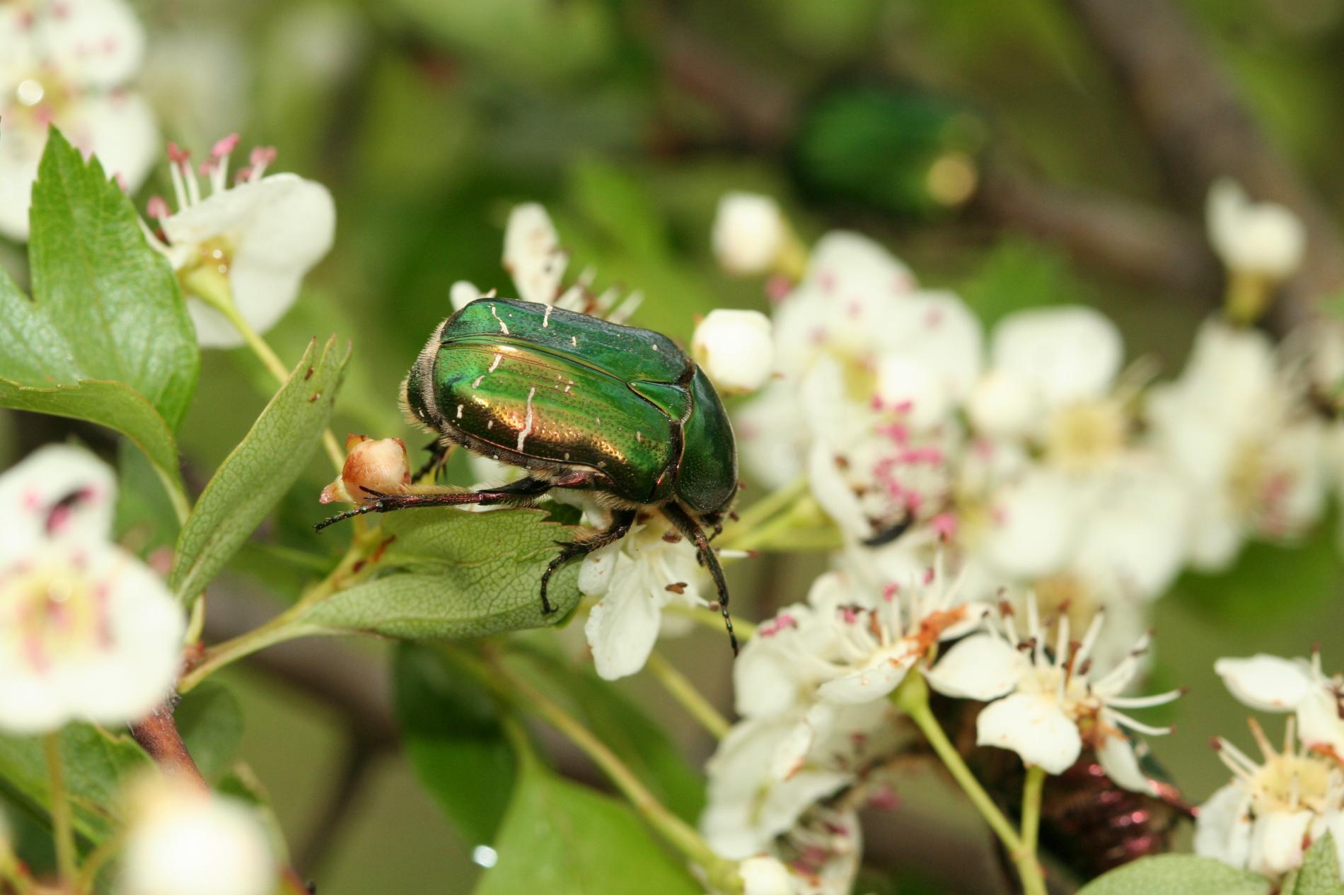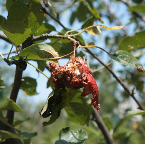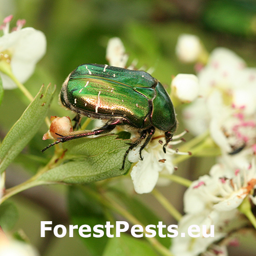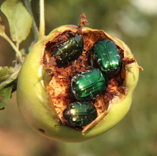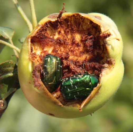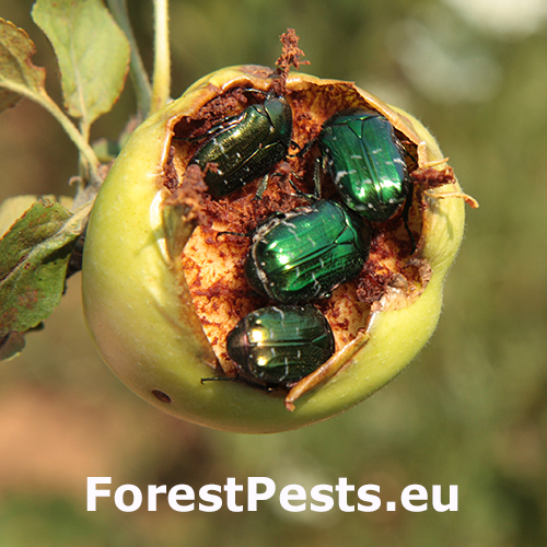Beetles belonging to the subfamily Cetoniinae (Family Scarabaeidae) have been known to cause damage to apple fruits and other fruits in Europe. These beetles typically feed on the surface of the fruits, creating shallow, irregularly shaped pits or cavities. Sometime whole fruit can be consumed. The feeding activity of Cetoniinae beetles can result in cosmetic damage to the fruits, making them less visually appealing for consumers. Additionally, the feeding places may provide entry points for pathogens, leading to potential fruit rot or fungal infections. The severity of the damage caused by Cetoniinae beetles can vary depending on factors such as the population size of the beetles, fruit susceptibility, and environmental conditions. The rose chafer Cetonia aurata is a widespread and economically significant pest in Europe. However also other species can cause damages to the fruits, like Potosia spp., Cetonischema spp. etc. They feed on a variety of plants, including roses, fruits, and ornamental flowers. The larvae are not harmful. They live in decaying wood.