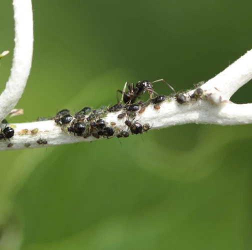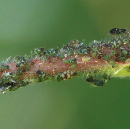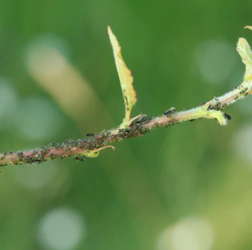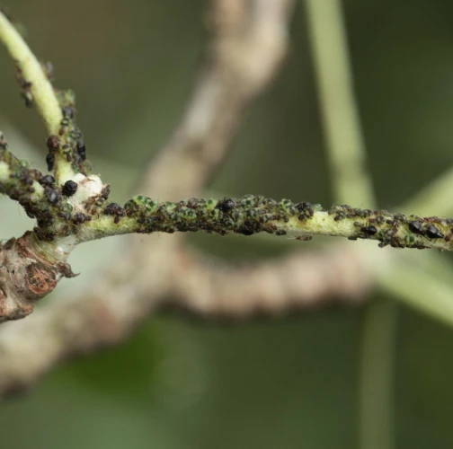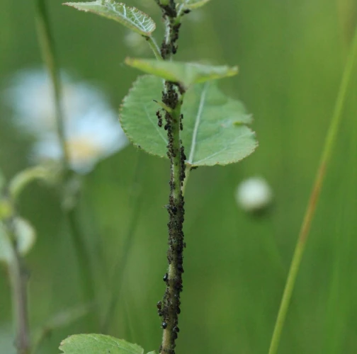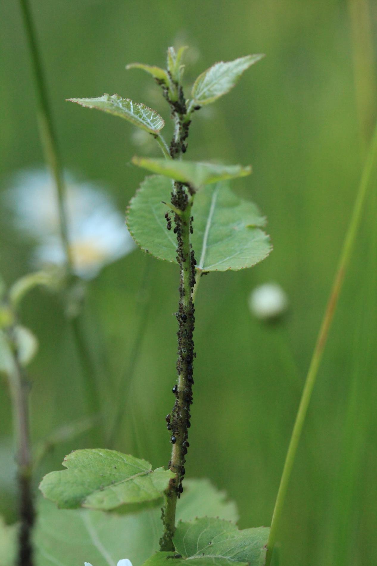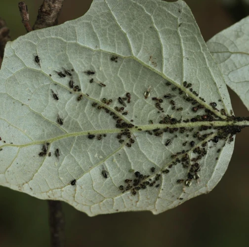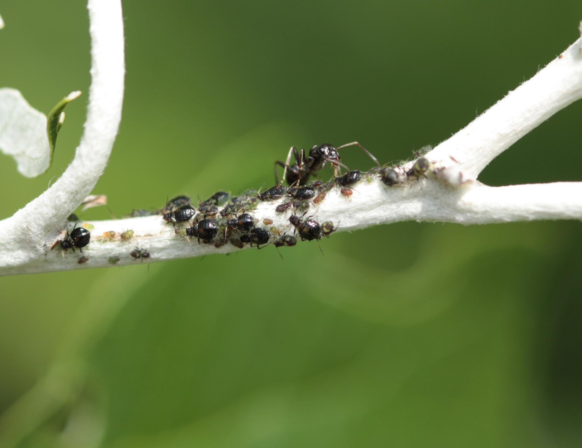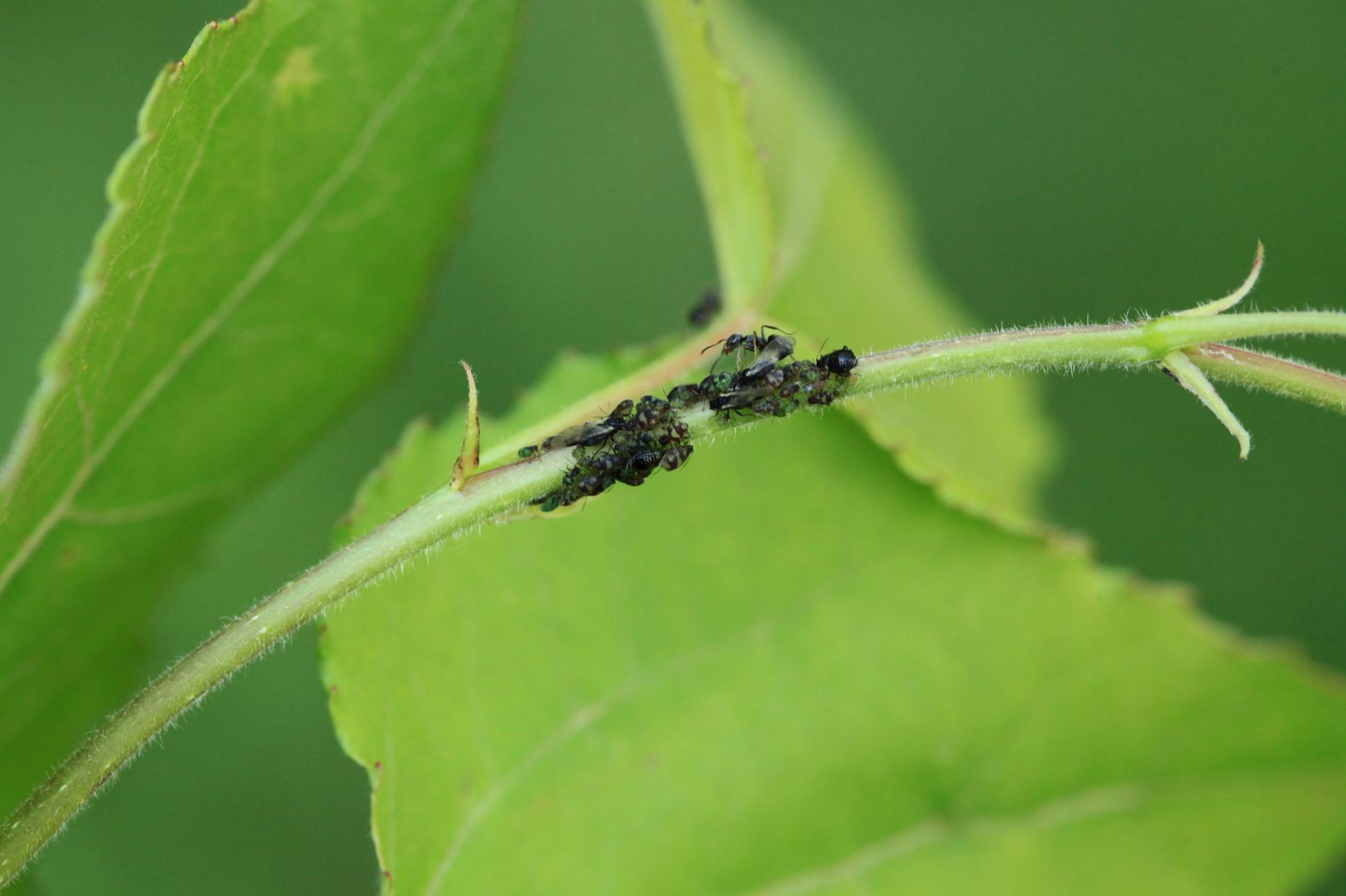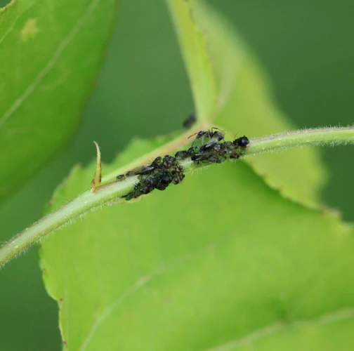 Dark winged aphids at tips of young shoots or leaves petioles, living in a colony. Intensively attended by ants.