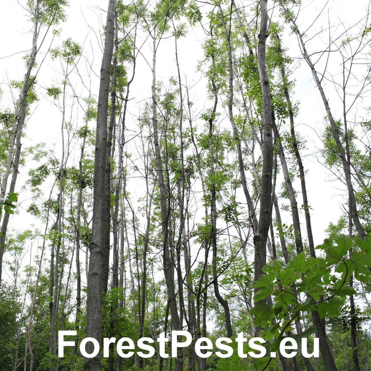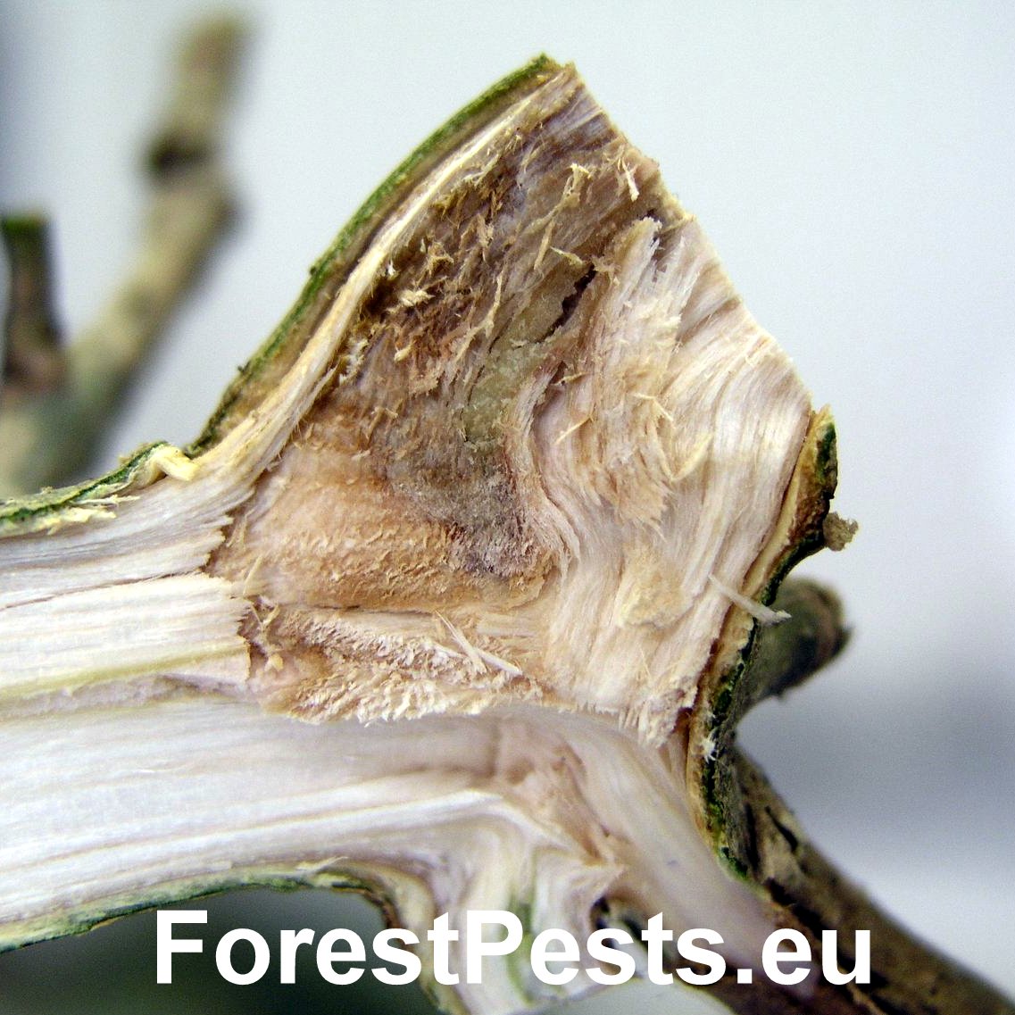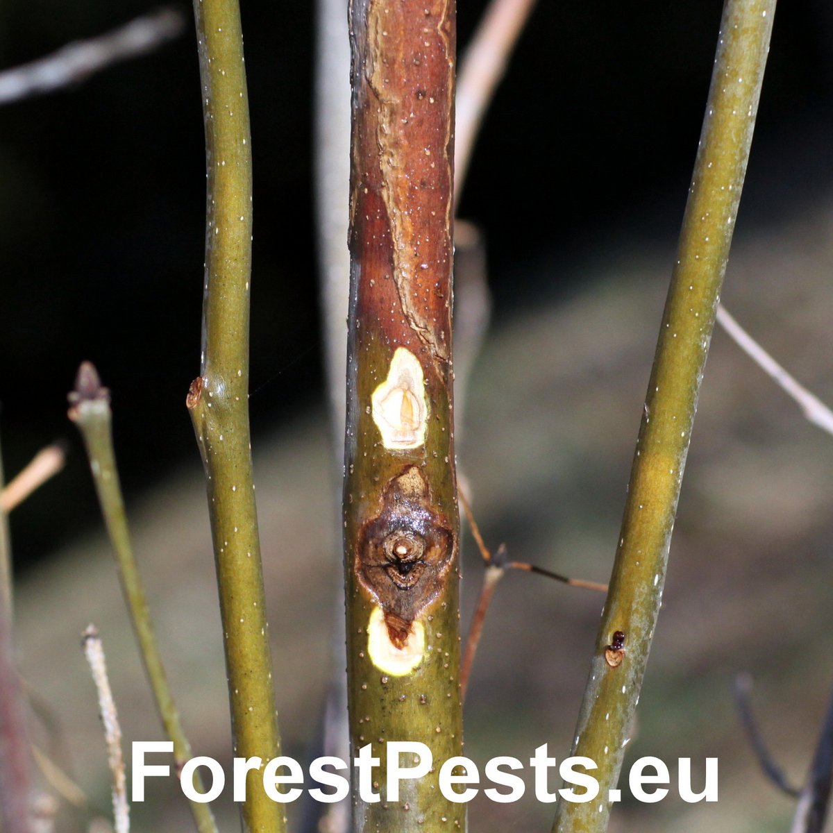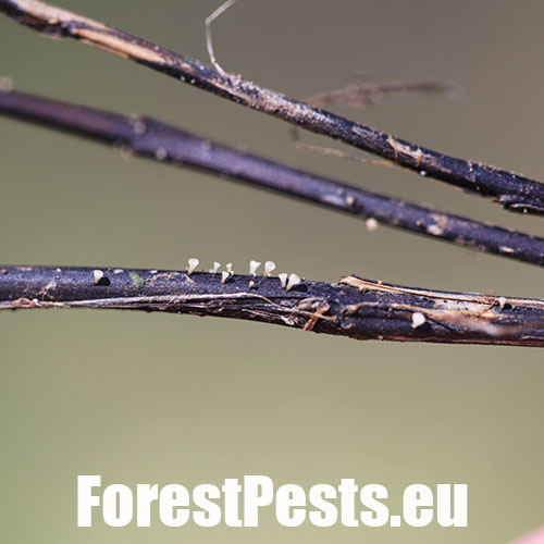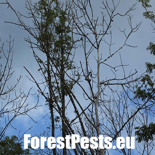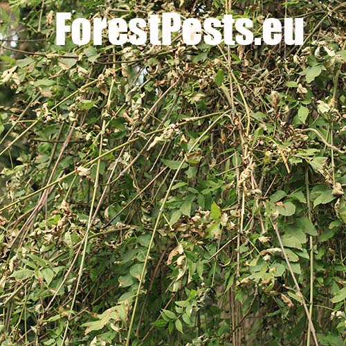 This disease causing tree mortality has increasingly been observed in Central European countries on ash trees since 1990s. The first studies revealed the presence of a pathogenic fungus which was described as a new species, Chalara fraxinea, in 2006. Initially, small necrotic spots (without exudate) appear on stems and branches some necrotic lesions are sunken. These necrotic lesions then enlarge resulting in wilting, dieback of branches and particularly in the death of the top of the crown. The disease is often chronic but can be lethal. Ash dieback has been observed not only on forest trees but also in urban areas (parks and gardens) and in nurseries. Sexual stage of the fungus is Hymenoscyphus pseudoalbidus.
