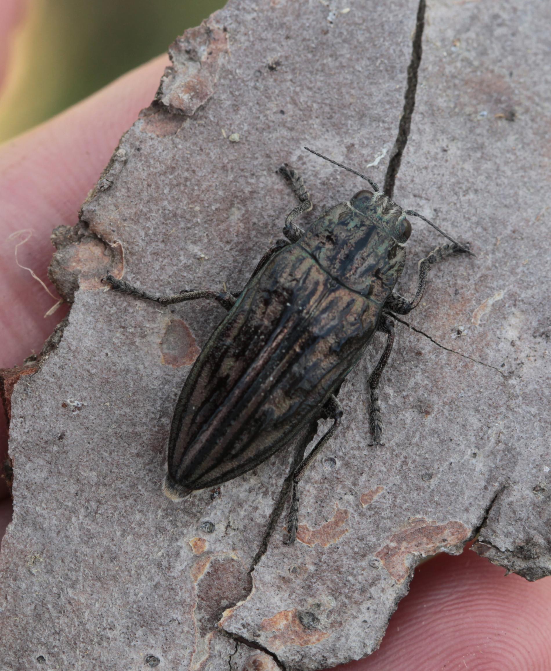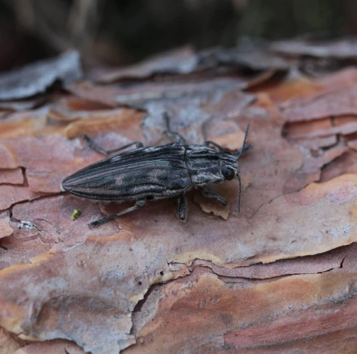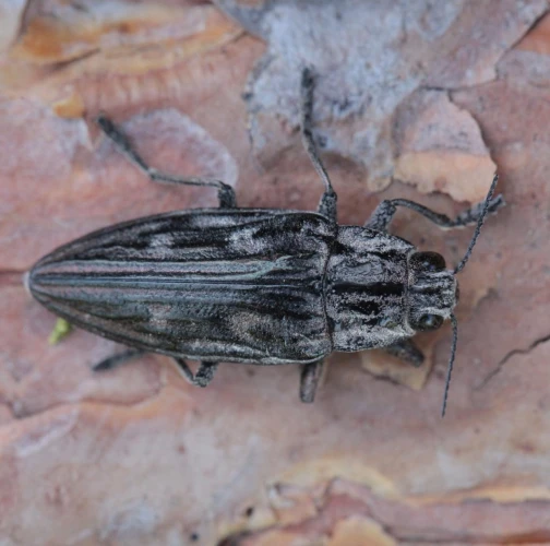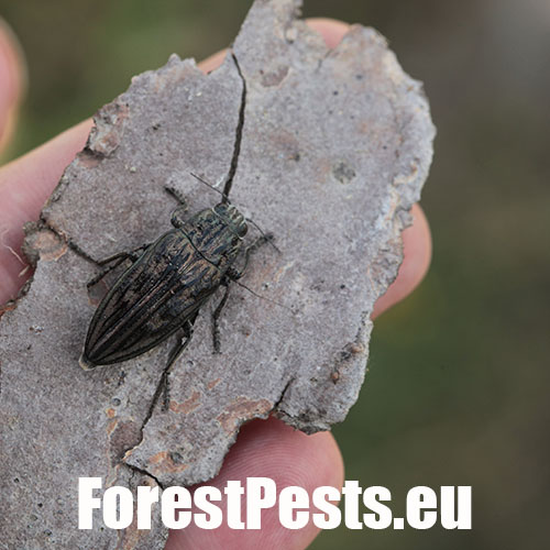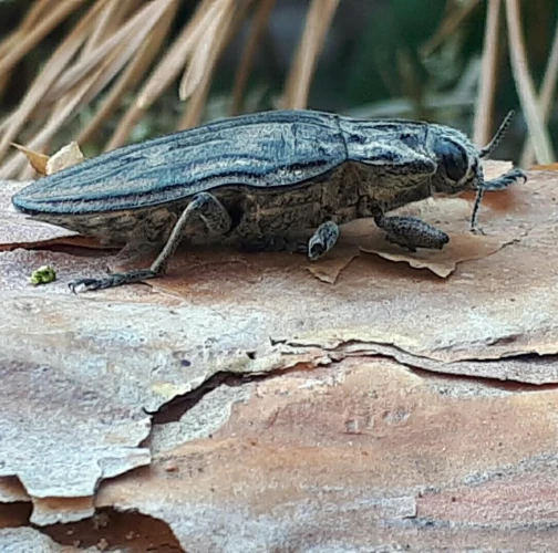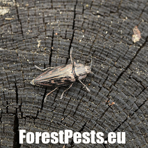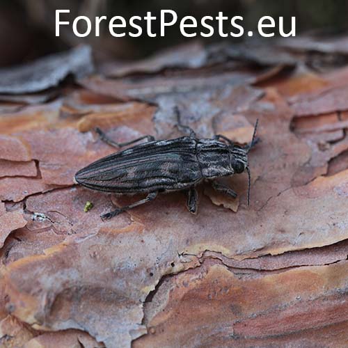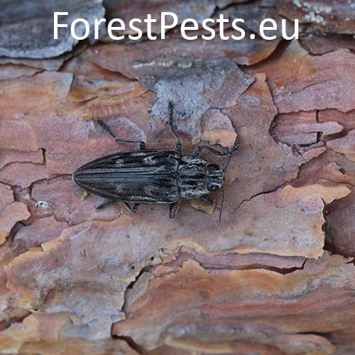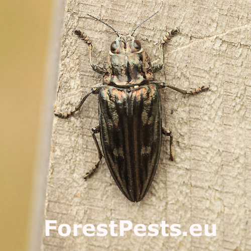 With its length of 21 to 32 mm, the pine borer is one of the largest species of the jewel beetles (family Buprestidae) in Central Europe. The larva is white, up to 70 mm long, legless. The species develops for 3–6 years in recently dead trunks and stumps of pine. Adults are active from May through July. During warm sunny days they are observed mainly on pine stumps in clear cut areas. Females oviposit eggs in bark crevices of stems or stumps. Larvae hatch after 2 weeks and bore galleries of up to 15 mm wide. Adults emerge through exit holes of 1.0 × 0.5 cm in size. It is most frequently found in larger pine forests. In Europe two similar species occur only in southern areas: Chalcophora intermedia and C. detrita.