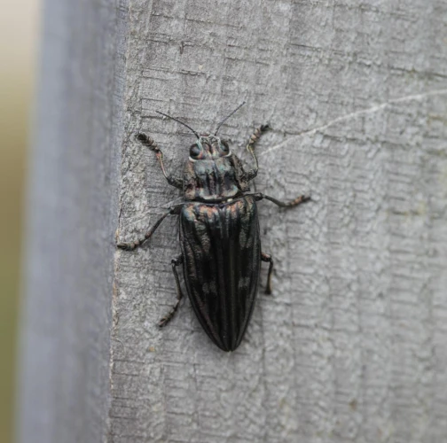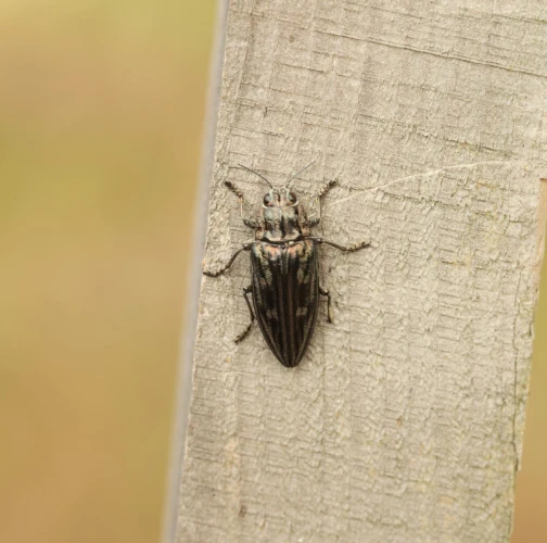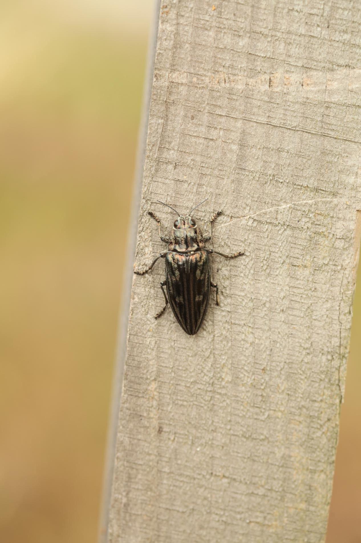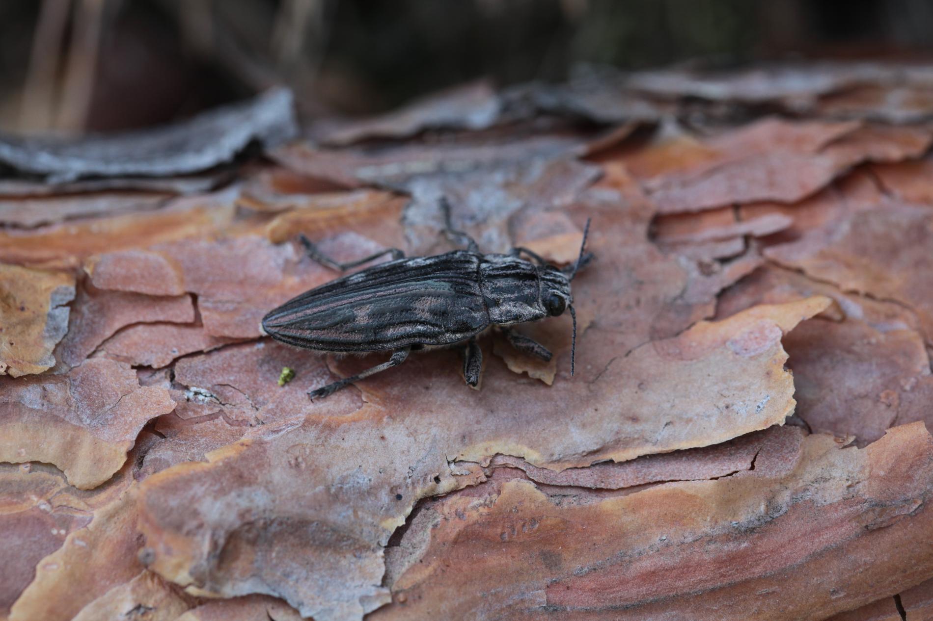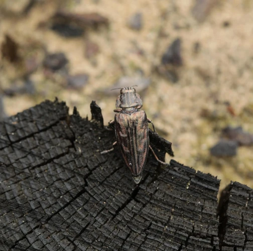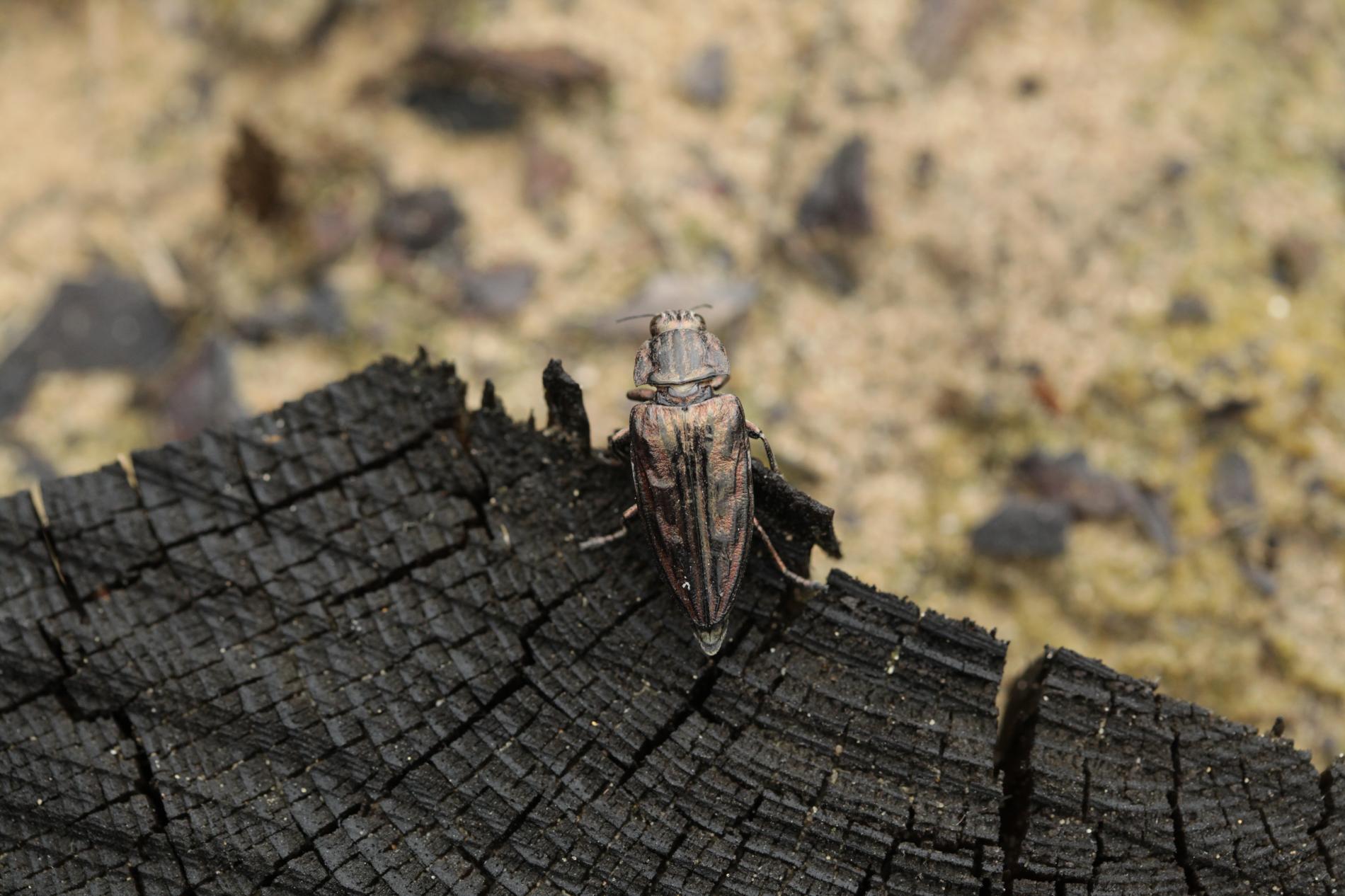 With its length of 21 to 32 mm, the pine borer is one of the largest species of the jewel beetles (family Buprestidae) in Central Europe. The larva is white, up to 70 mm long, legless. The species develops for 3–6 years in recently dead trunks and stumps of pine. Adults are active from May through July. During warm sunny days they are observed mainly on pine stumps in clear cut areas. Females oviposit eggs in bark crevices of stems or stumps. Larvae hatch after 2 weeks and bore galleries of up to 15 mm wide. Adults emerge through exit holes of 1.0 × 0.5 cm in size. It is most frequently found in larger pine forests. In Europe two similar species occur only in southern areas: Chalcophora intermedia and C. detrita.