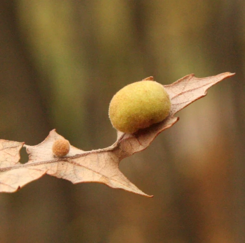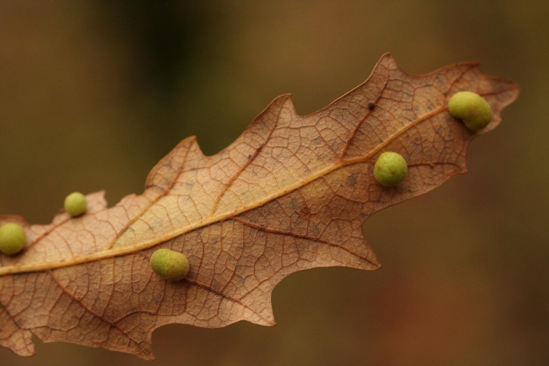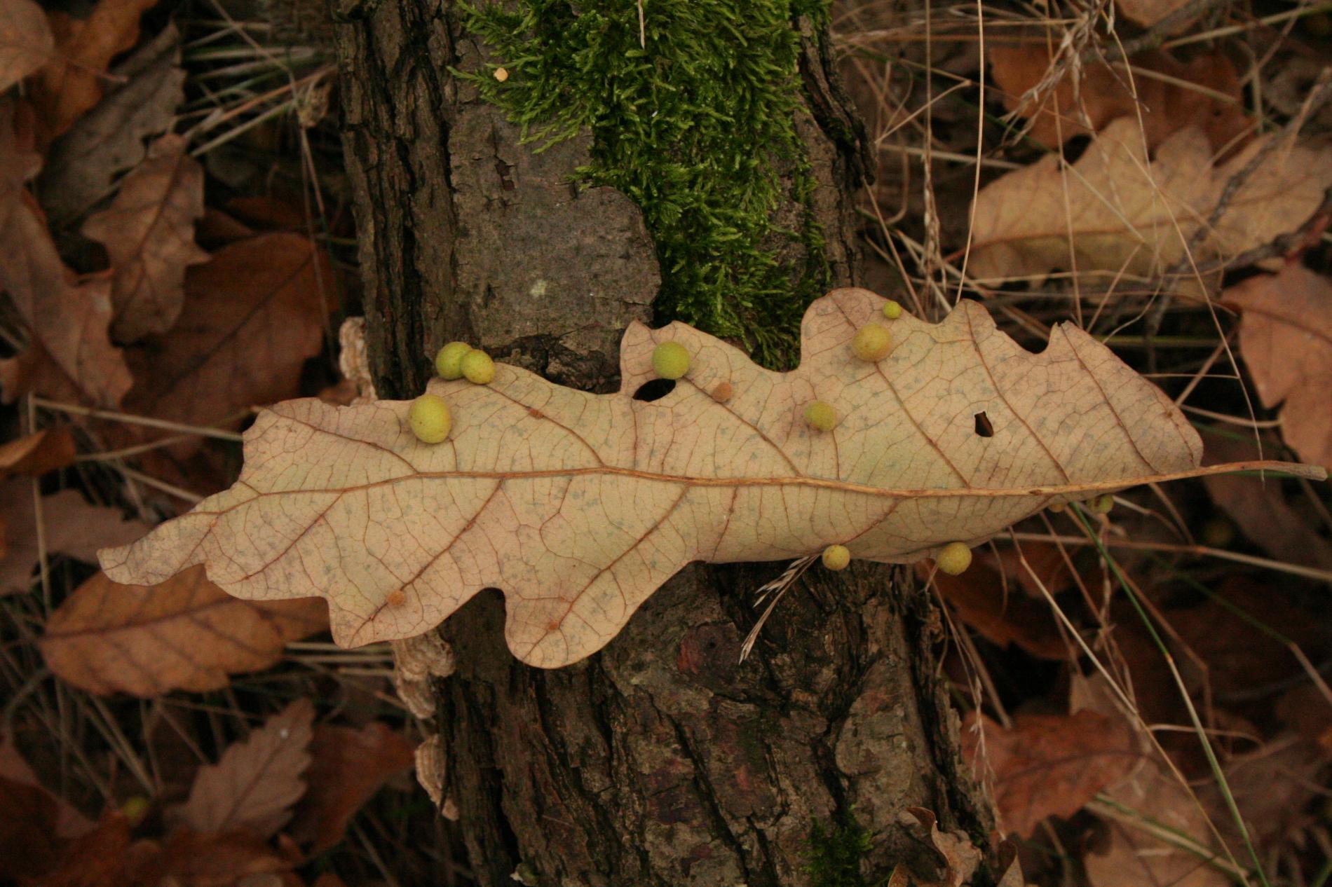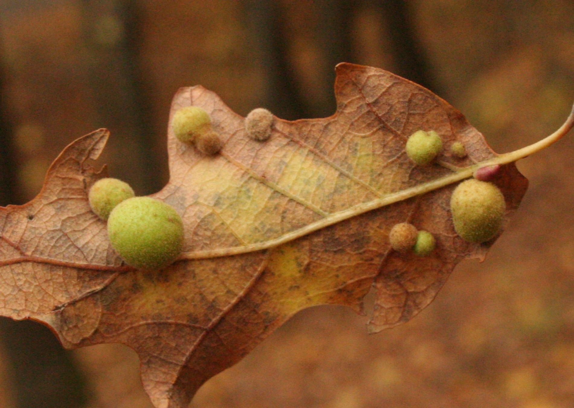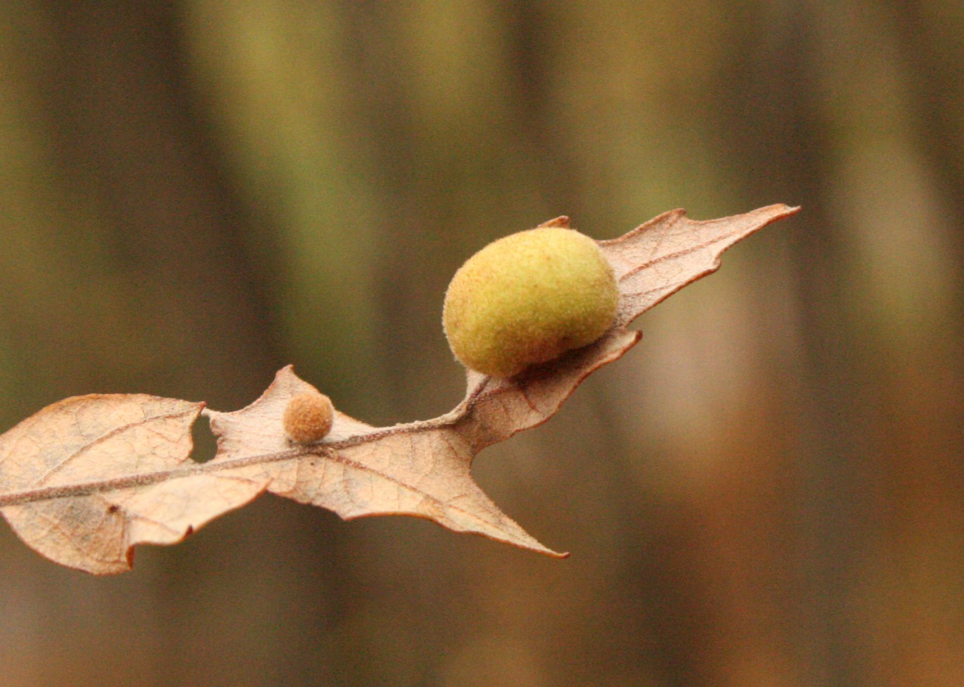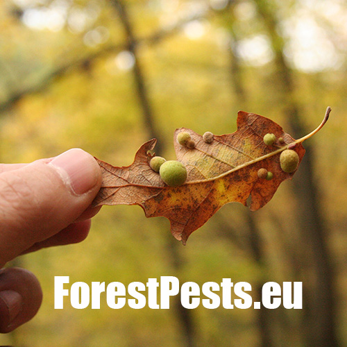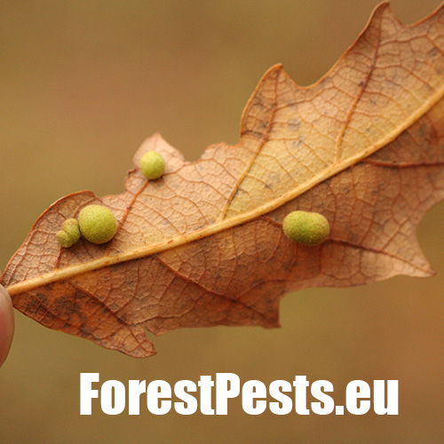 Unisexual generation forms monolocular, pale green globular galls 4-6 mm in diameter on the under side of leaves, usually gregariously.