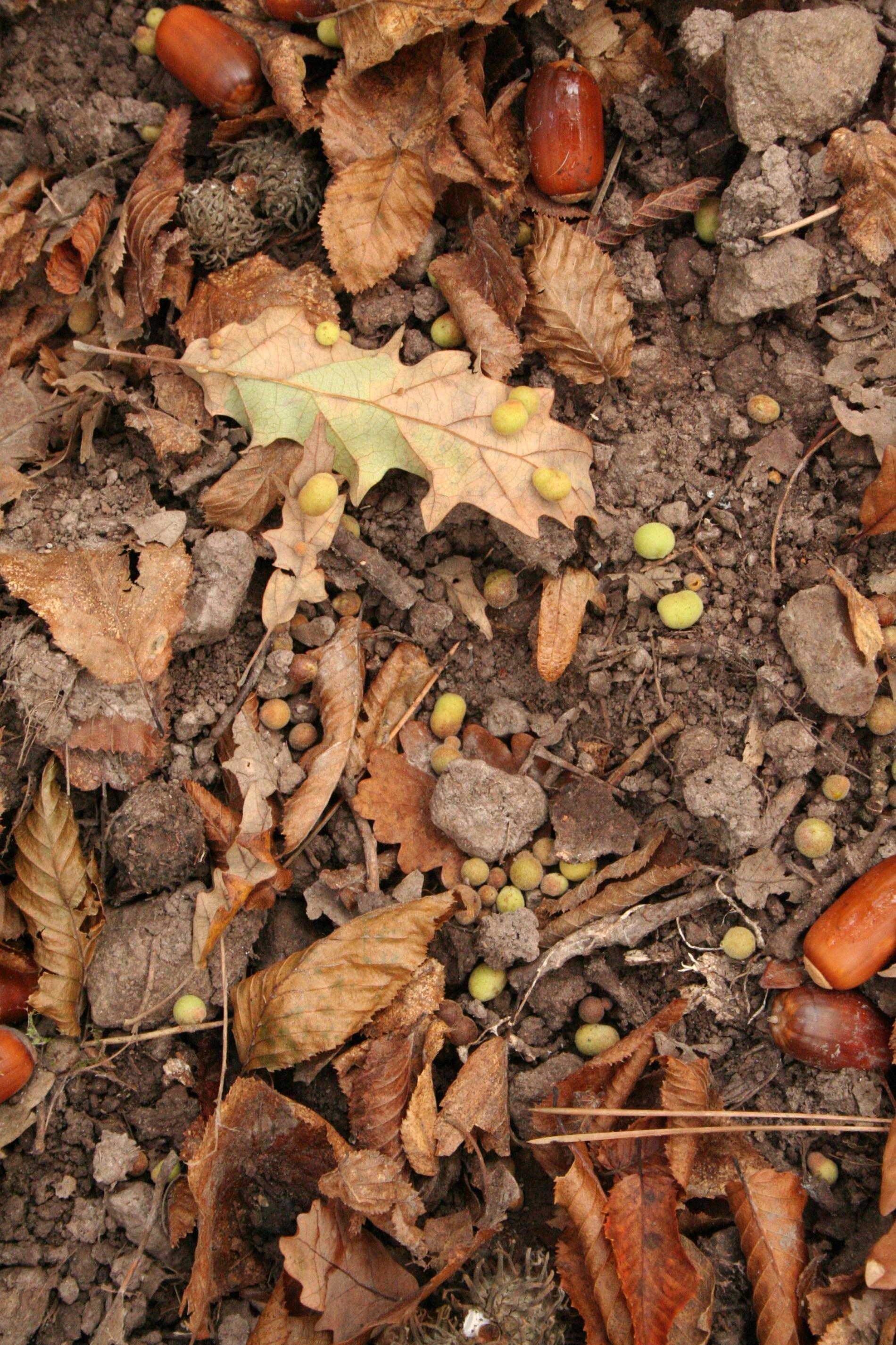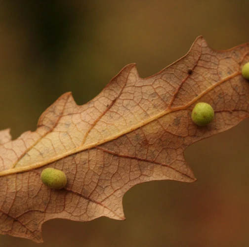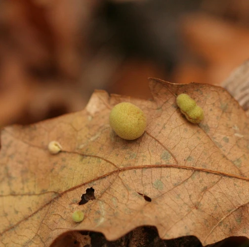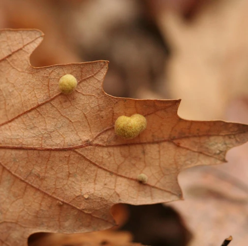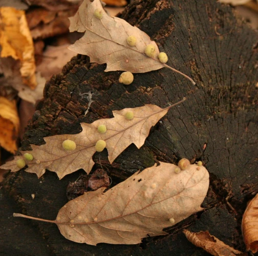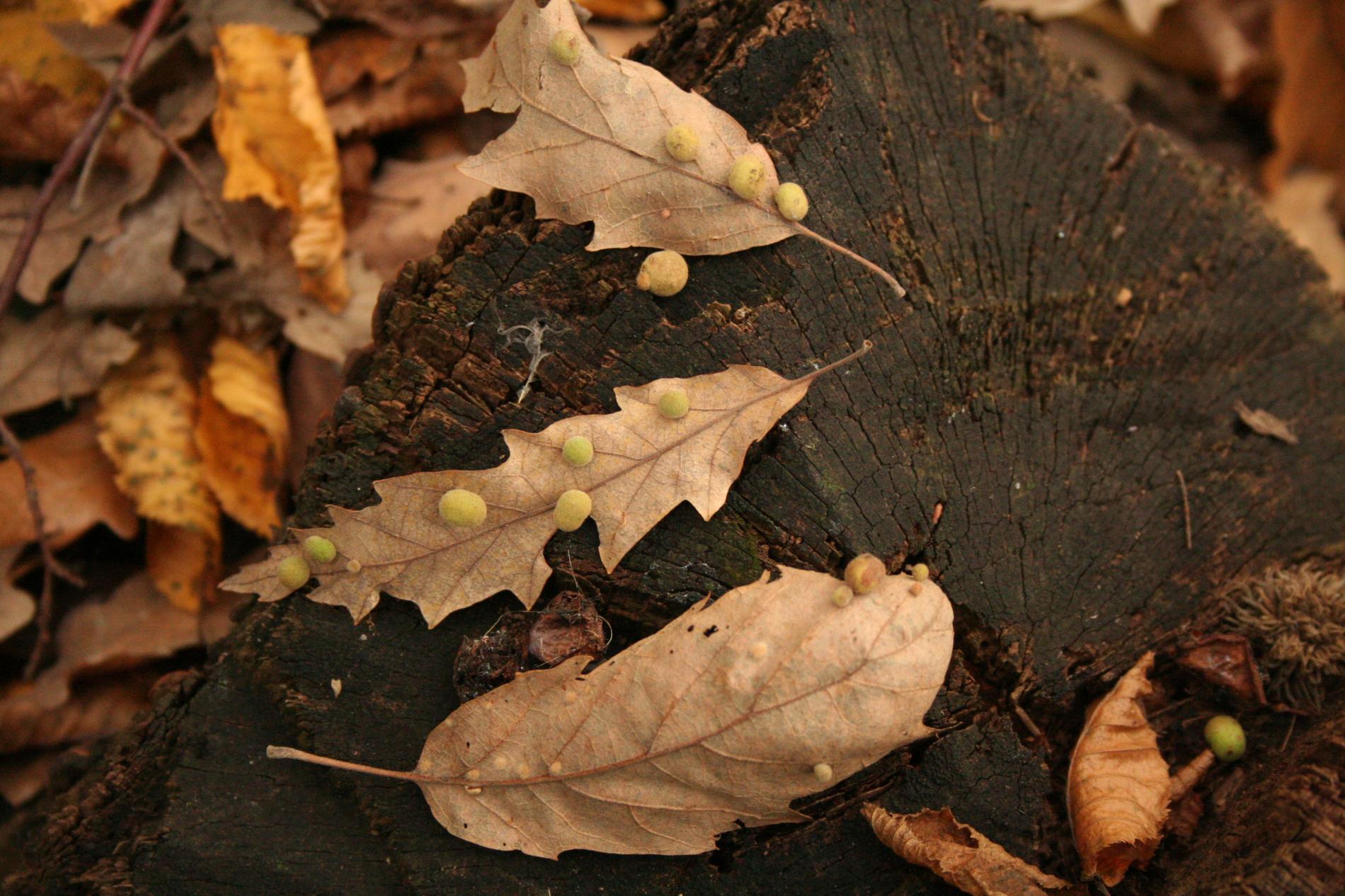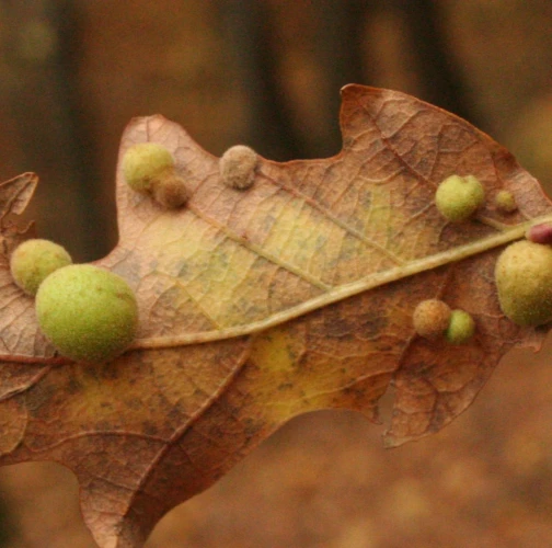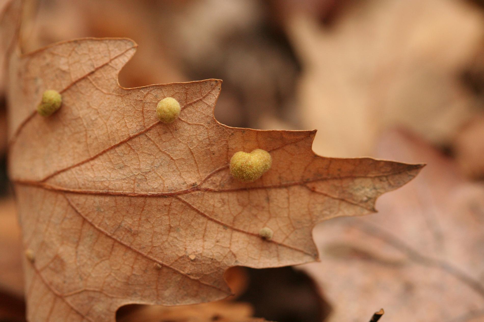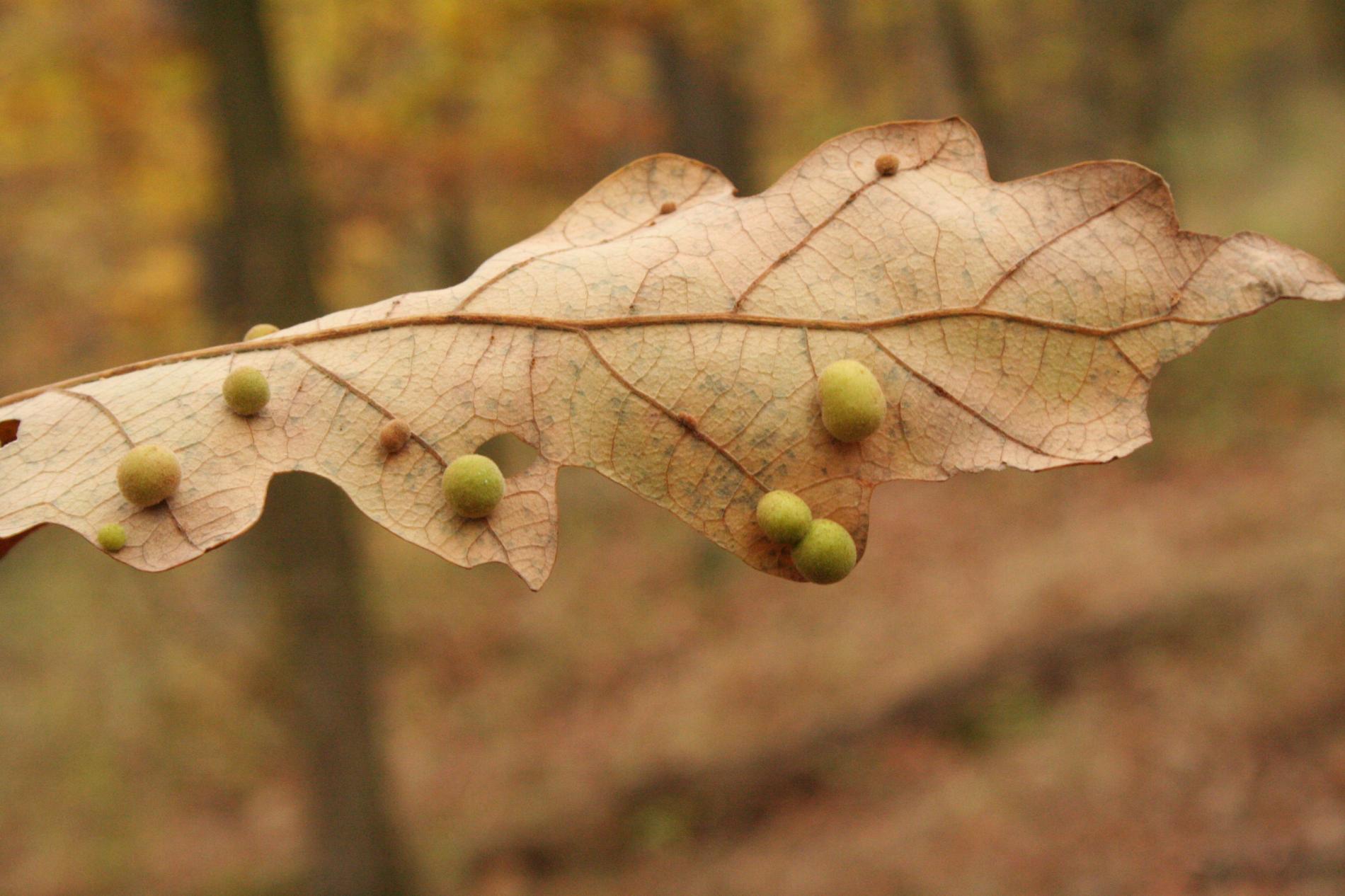 Unisexual generation forms monolocular, pale green globular galls 4-6 mm in diameter on the under side of leaves, usually gregariously.
