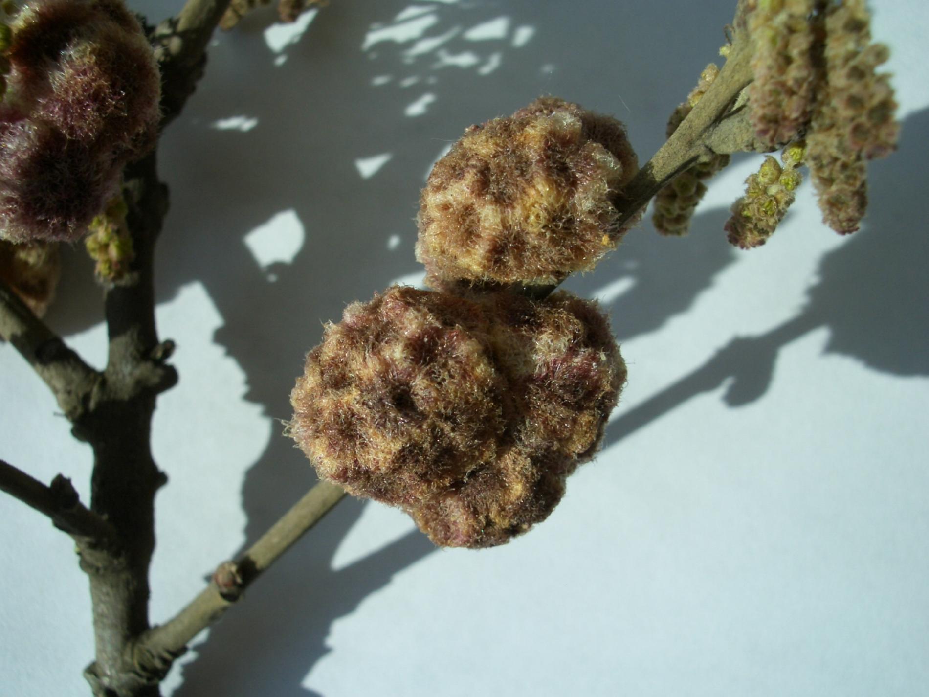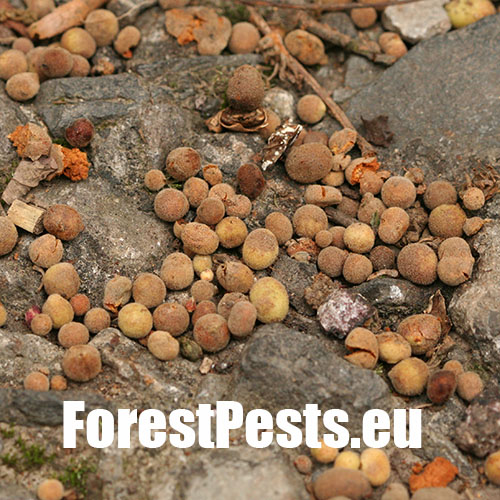 Unisexual generation forms monolocular, pale green globular galls 4-6 mm in diameter on the under side of leaves, usually gregariously. They fall down in October, when they are dry and grey-brown in colour. The bisexual generation forms a globular purple cotton wool-like mass, 10-30 mm across, within which can be found a variable number of hard inner cells, each 2-3 mm long. This generation completes its development by the end of May. Later the galls dry and disintegrate. Both generations live exclusively on Quercus cerris. Often very abundant.