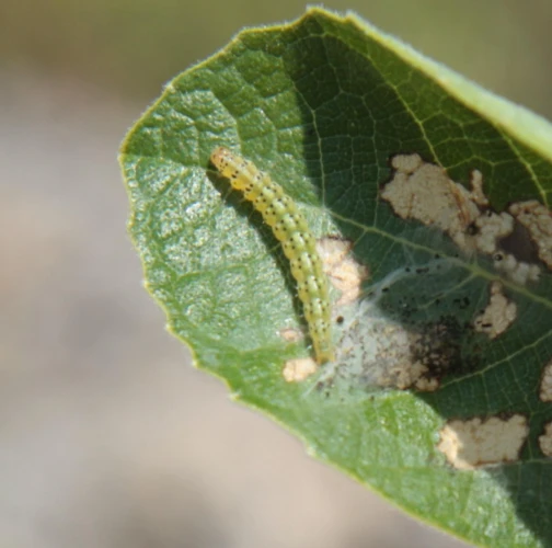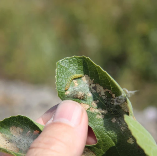 Affected leaves exhibit silken webs with skeletonized patches. Leaf edges may curl, forming shelters for larvae, and white cocoons are visible at fold points.