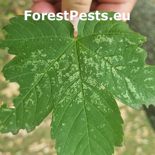 Several leafhopper species, such as Edwardsiana nigriloba, Ossiannilssonola callosa and Fagocyba cruenta, develop on maples (Acer spp.) in Europe. Adults are 2–4 mm long, light-coloured, with wings held roof-like over the body, and they jump quickly when disturbed. Nymphs resemble adults and pass through five immature stages. The species usually overwinter as eggs inserted into host tissue, and adults appear from early summer. Leafhoppers are widely distributed across Europe, including both lowlands and mountain regions. Infestation intensity is usually not strong, but high numbers may reduce leaf assimilation area, which can worsen the overall vitality and ornamental value of maples.