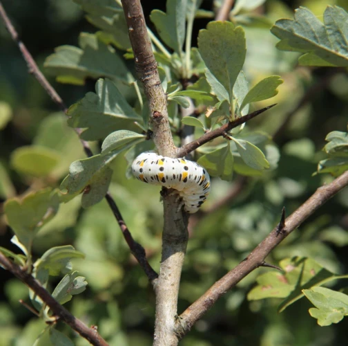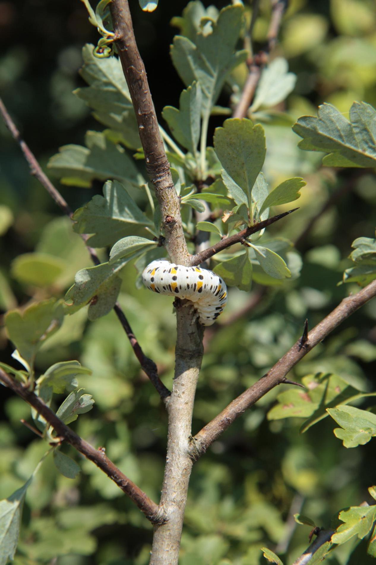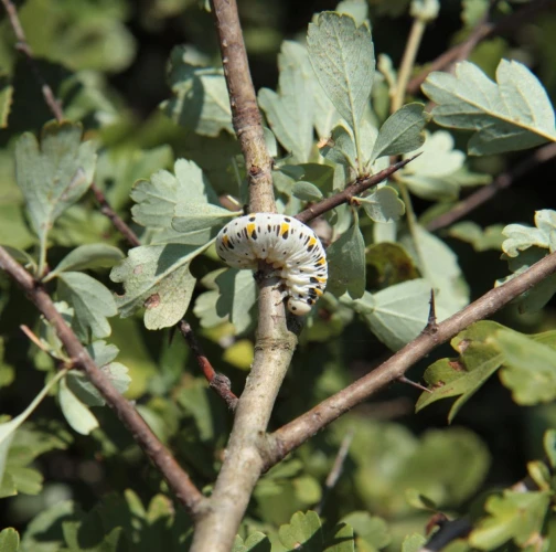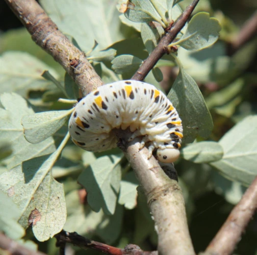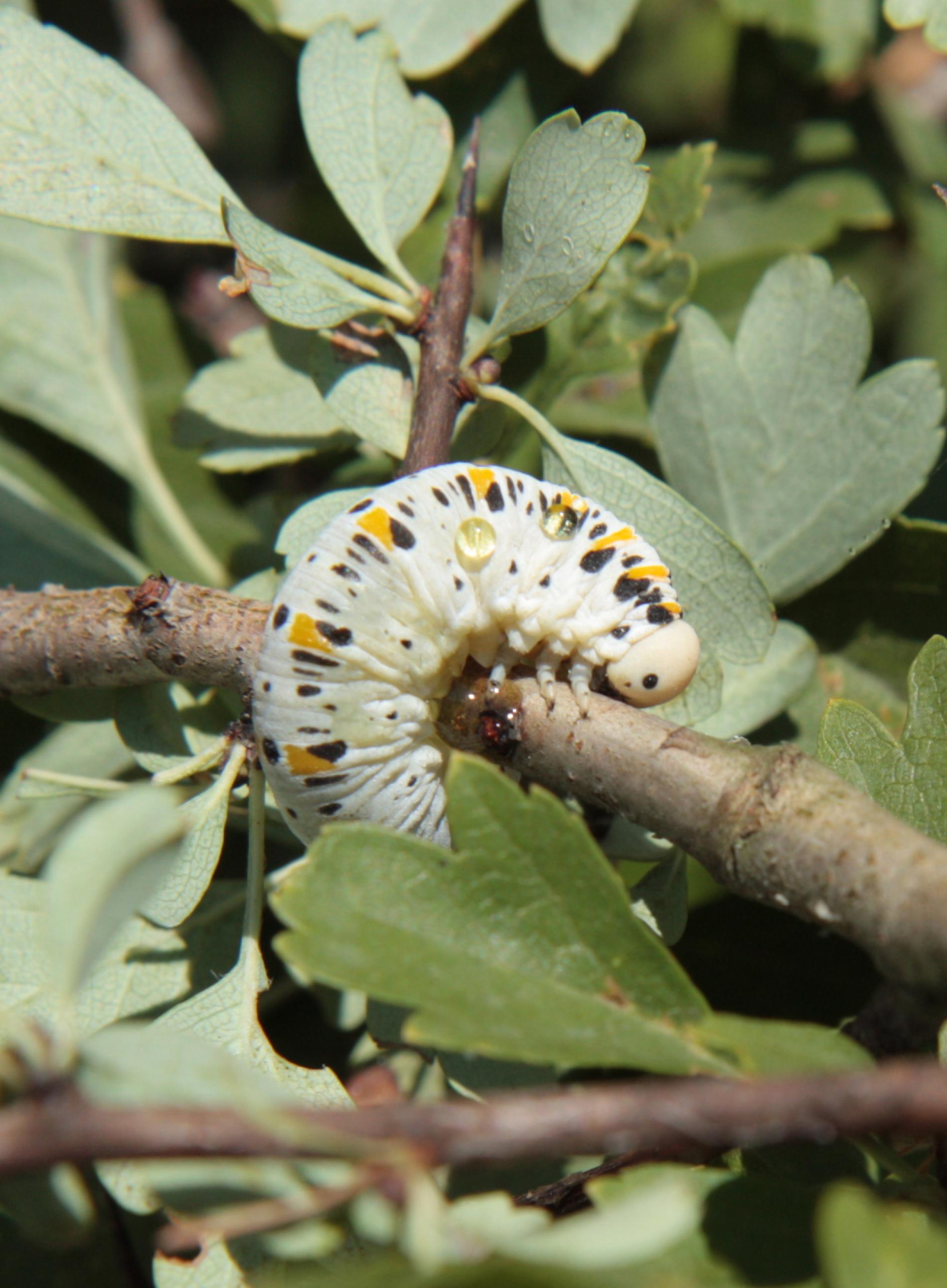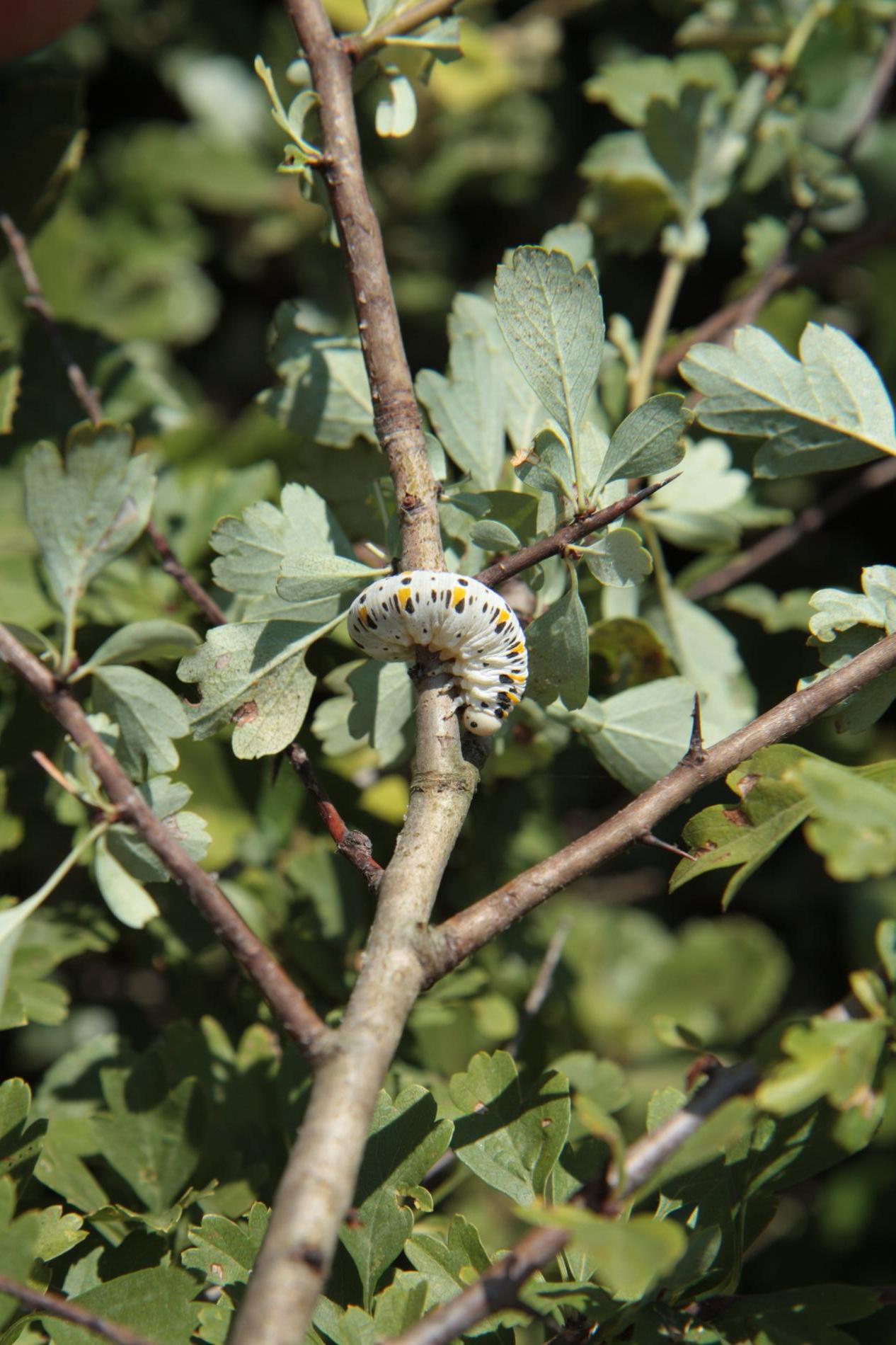 Large, colorful larva—white with black and yellow markings. Causes defoliation of leaves.
