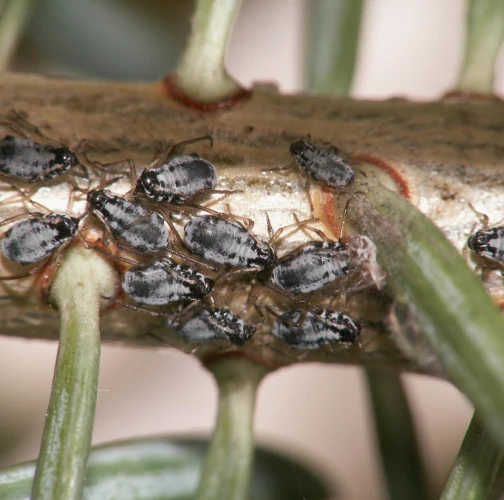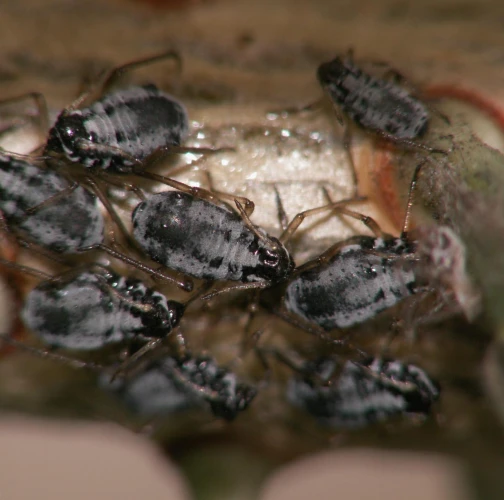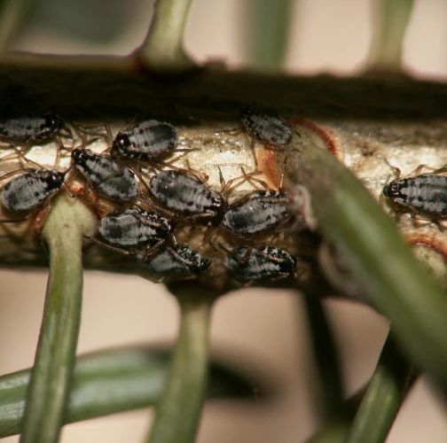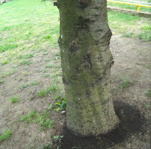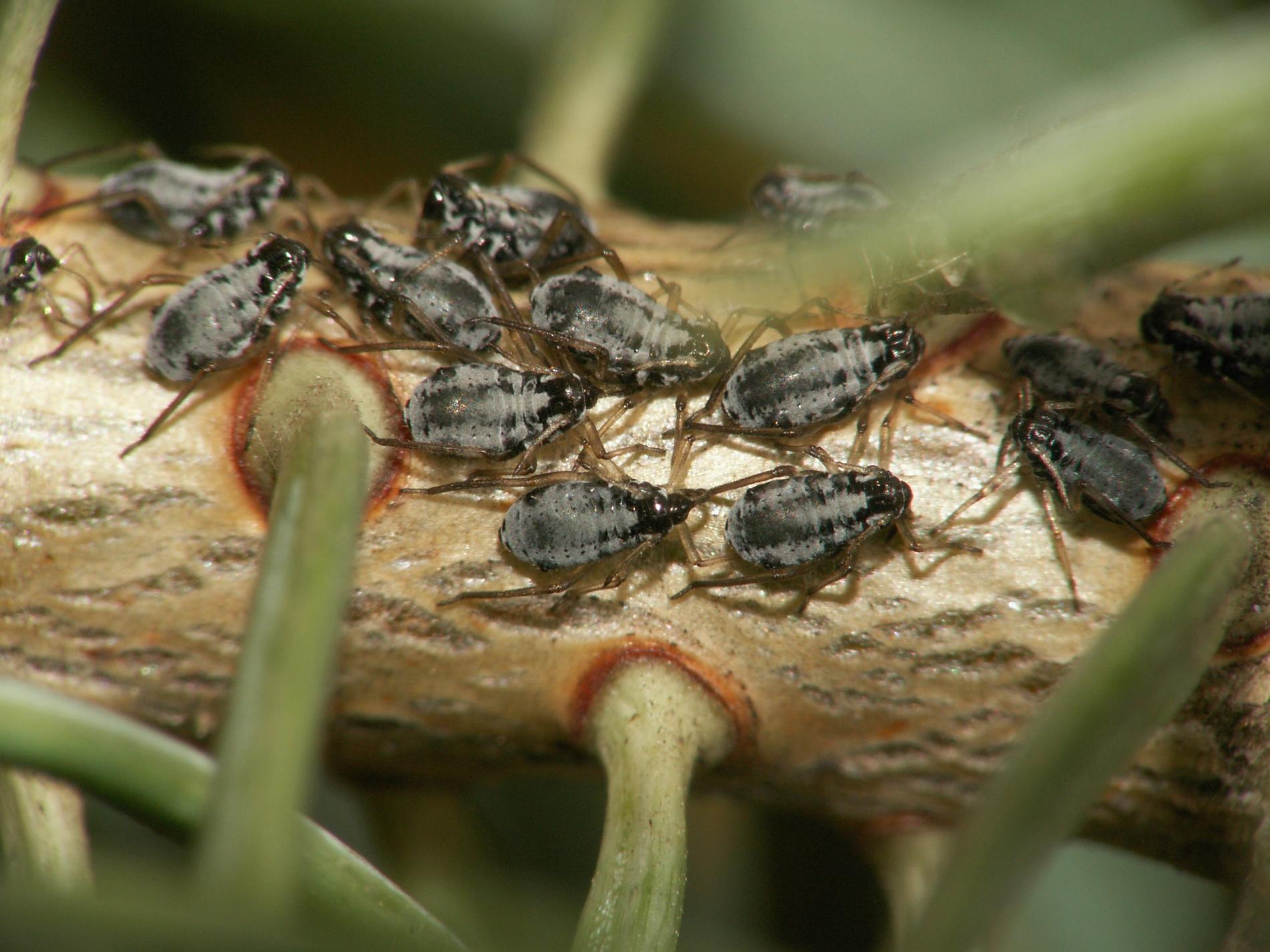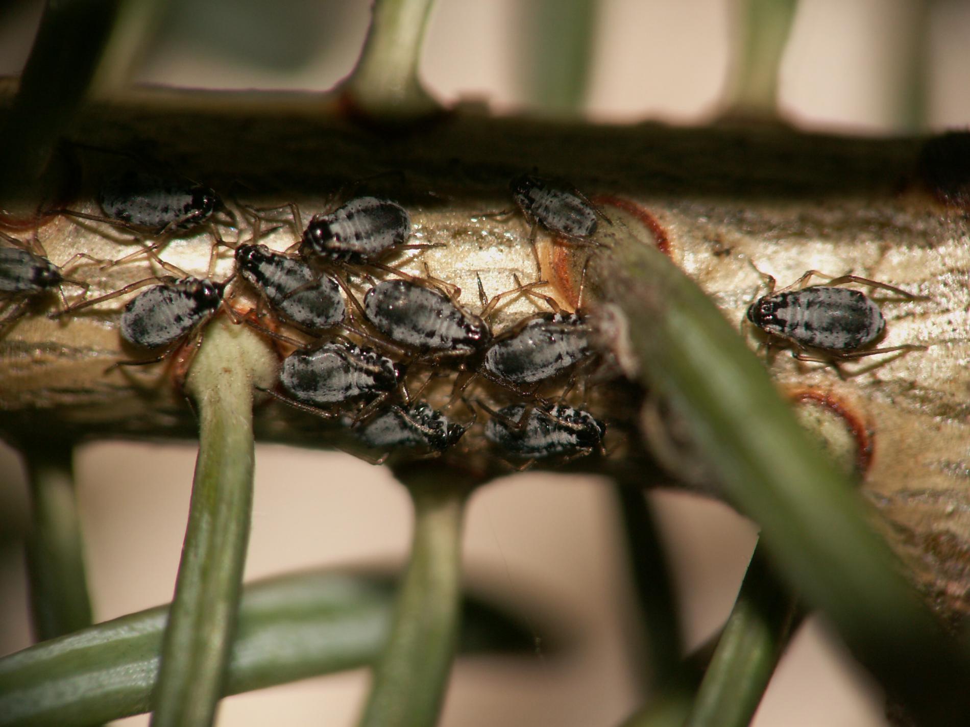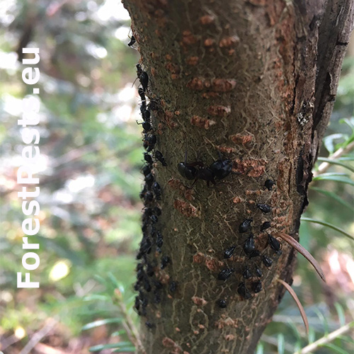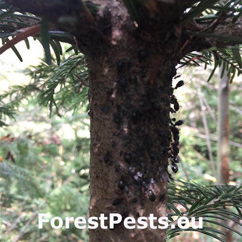 The aphid, bow-legged fir aphid Cinara curvipes (Patch), belongs to the aphids of the subfamily Lachninae. It is a species that is native to North America, in its western part, from Mexico to the north through California, Oregon to the state of Washington and Canada. Here he lives on domestic species of fir, but also on some other woody plants. In Europe, therefore, it is an introduced species. According to available information, it was first detected in the United Kingdom in Europe in 1999. The wingless, vivacious female bow-legged fir aphid Cinara curvipes are relatively large aphids (up to 5-6 mm) of a round body, shiny, dark brown to black, with two light lines on their backs. They can have up to six generations in a year. The vast majority of individuals in the colonies are wingless, but winged females are common. They hibernate eggs. Aphids suck in colonies on the bark, usually on the underside of branches or on the trunk. Their number reaches two peaks during the year; the first during May and June, the second during September and October. Colonies produce large amounts of honeydew, which is mostly harvested by wasps and ants, but harvesting by bees has also been observed. In Europe, it lives on exotic firs such as Abies concolor and giant fir Abies grandis, rarely on other woods, e.g. Cedar atlantica. In its original area, it lives almost exclusively on firs (A. balsamea, A. lasiocarpa, A. magnifica, A. religiosa, A. concolor). In Europe, he has recently appeared on Abies alba. The species is very similar to our domestic species, the bow-legged fir aphid Cinara confinis, known in the past as Todolachnus abieticola. This is common on our domestic Abies alba.