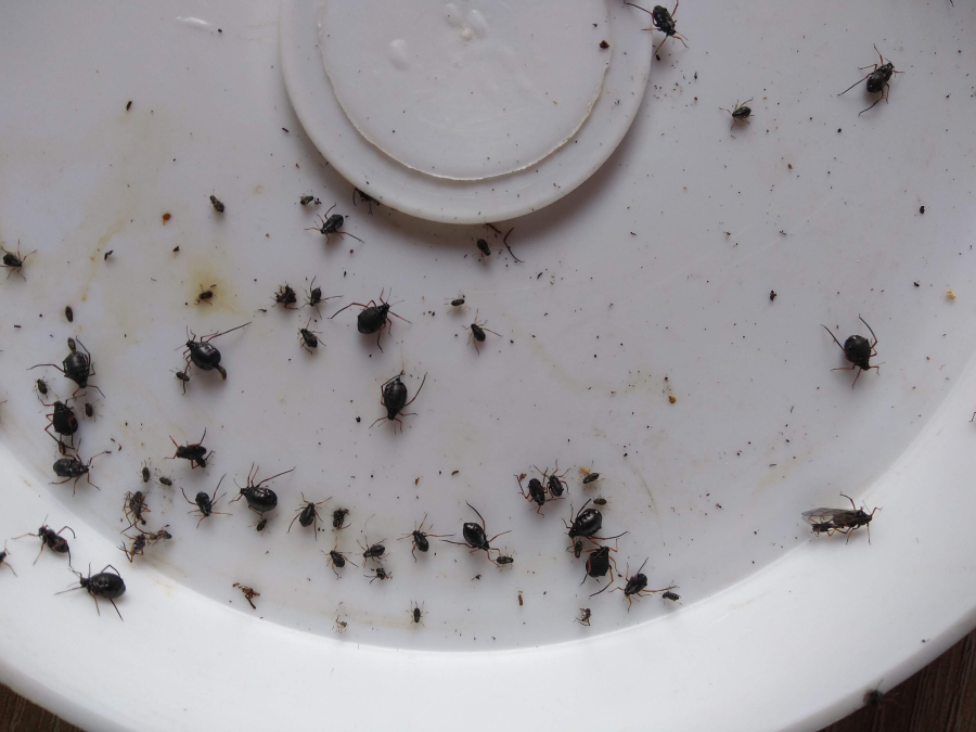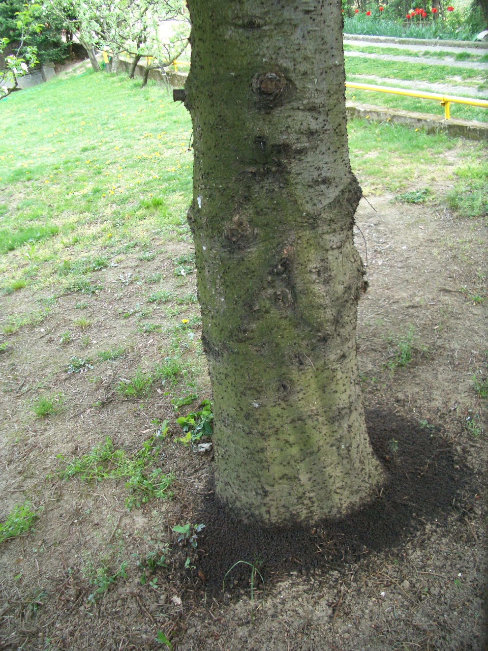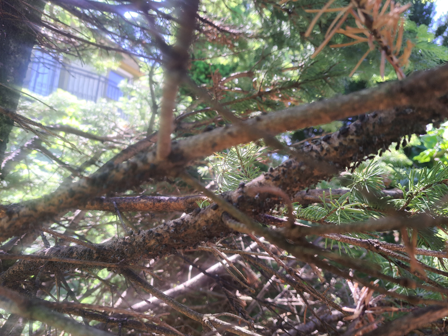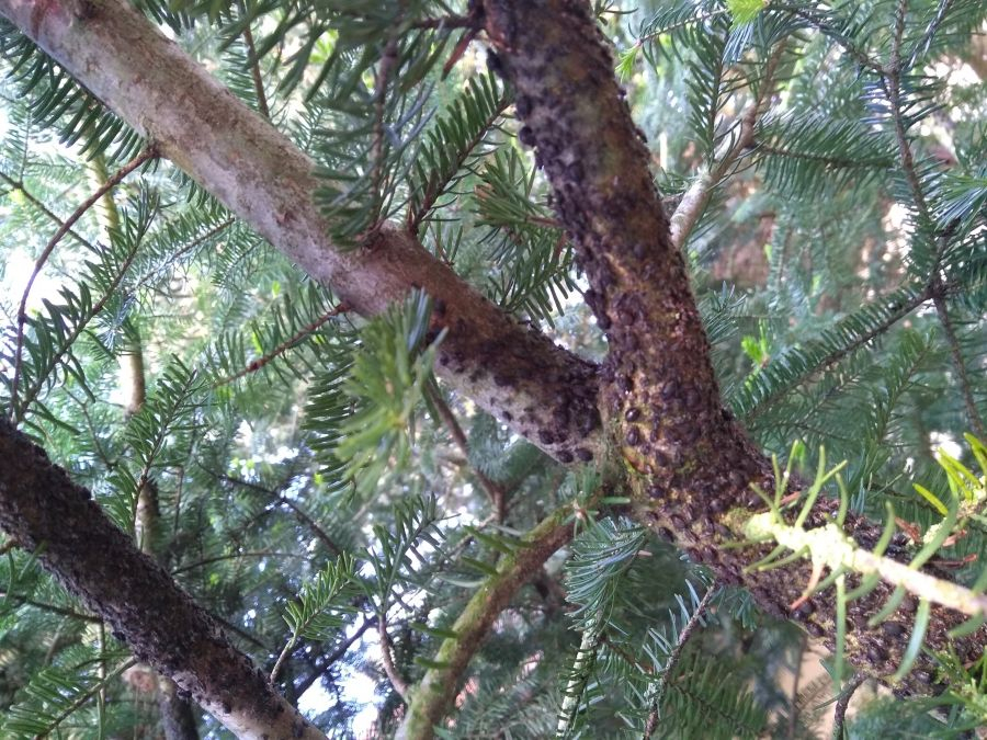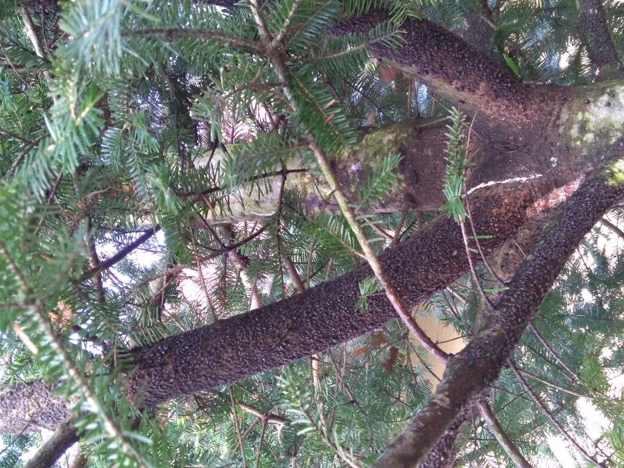 The aphid, bow-legged fir aphid Cinara curvipes (Patch), belongs to the aphids of the subfamily Lachninae. It is a species that is native to North America, in its western part, from Mexico to the north through California, Oregon to the state of Washington and Canada. Here he lives on domestic species of fir, but also on some other woody plants. In Europe, therefore, it is an introduced species. According to available information, it was first detected in the United Kingdom in Europe in 1999. The wingless, vivacious female bow-legged fir aphid Cinara curvipes are relatively large aphids (up to 5-6 mm) of a round body, shiny, dark brown to black, with two light lines on their backs. They can have up to six generations in a year. The vast majority of individuals in the colonies are wingless, but winged females are common. They hibernate eggs. Aphids suck in colonies on the bark, usually on the underside of branches or on the trunk. Their number reaches two peaks during the year; the first during May and June, the second during September and October. Colonies produce large amounts of honeydew, which is mostly harvested by wasps and ants, but harvesting by bees has also been observed. In Europe, it lives on exotic firs such as Abies concolor and giant fir Abies grandis, rarely on other woods, e.g. Cedar atlantica. In its original area, it lives almost exclusively on firs (A. balsamea, A. lasiocarpa, A. magnifica, A. religiosa, A. concolor). In Europe, he has recently appeared on Abies alba. The species is very similar to our domestic species, the bow-legged fir aphid Cinara confinis, known in the past as Todolachnus abieticola. This is common on our domestic Abies alba.