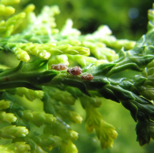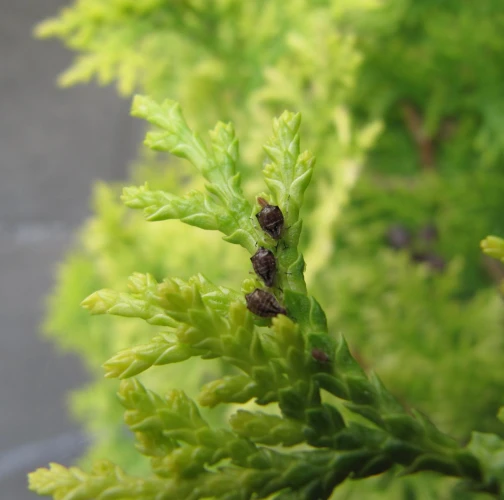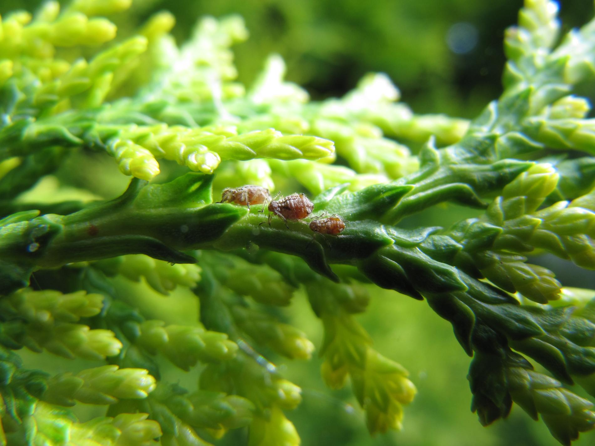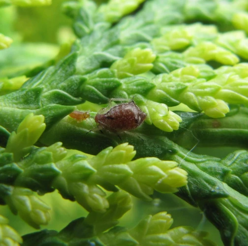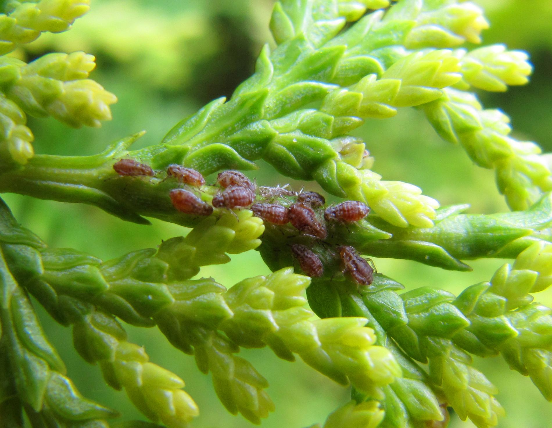 Cinara tujafilina, commonly known as the cypress pine aphid or thuja aphid, is a broadly oligophagous species that primarily infests members of the family Cupressaceae, including Thuja spp., Cupressus spp., and Juniperus spp. The aphids are reddish-brown with bluish-white wax and typically inhabit foliated branches or the undersides of twigs near the trunk. During winter in colder climates, they migrate to the roots of host plants. This species reproduces parthenogenetically and produces multiple generations throughout the year.
