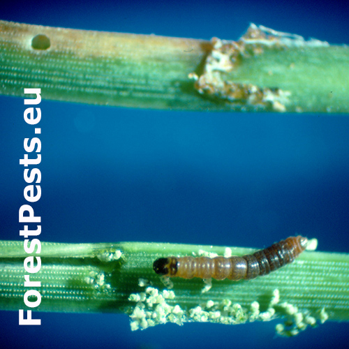 Symptoms include damaged and deformed pine shoots, dieback of young branches, and resin exudation from the larvae's entry points. Severe infestations can lead to stunted growth and weakened trees.