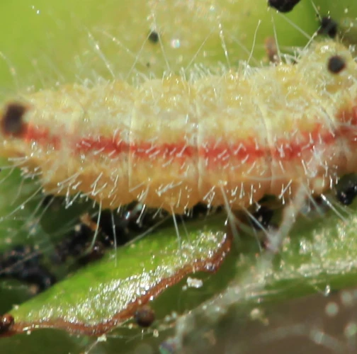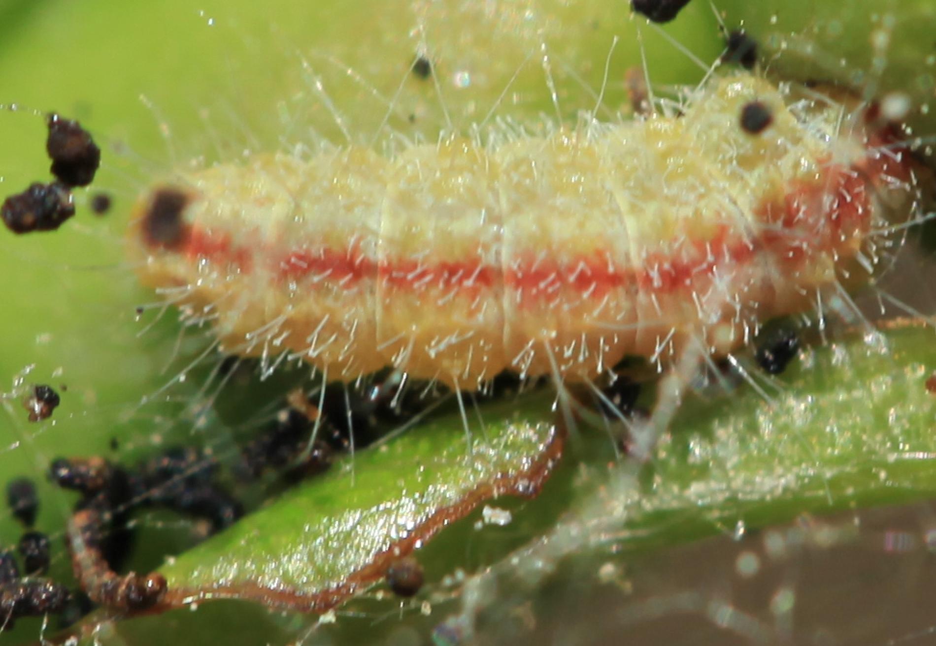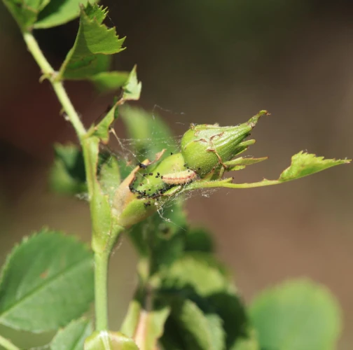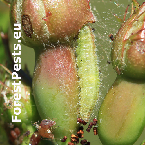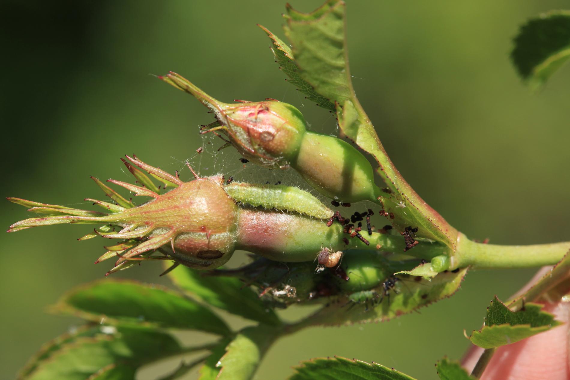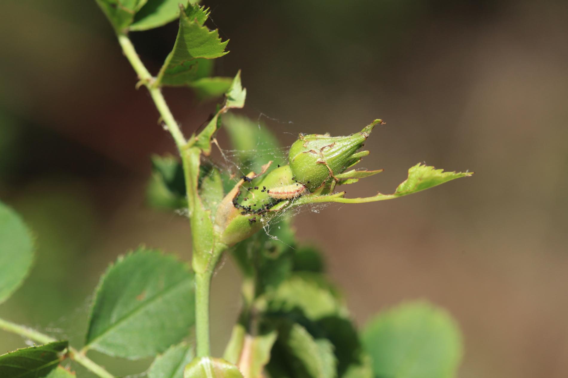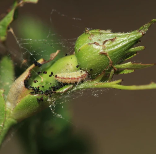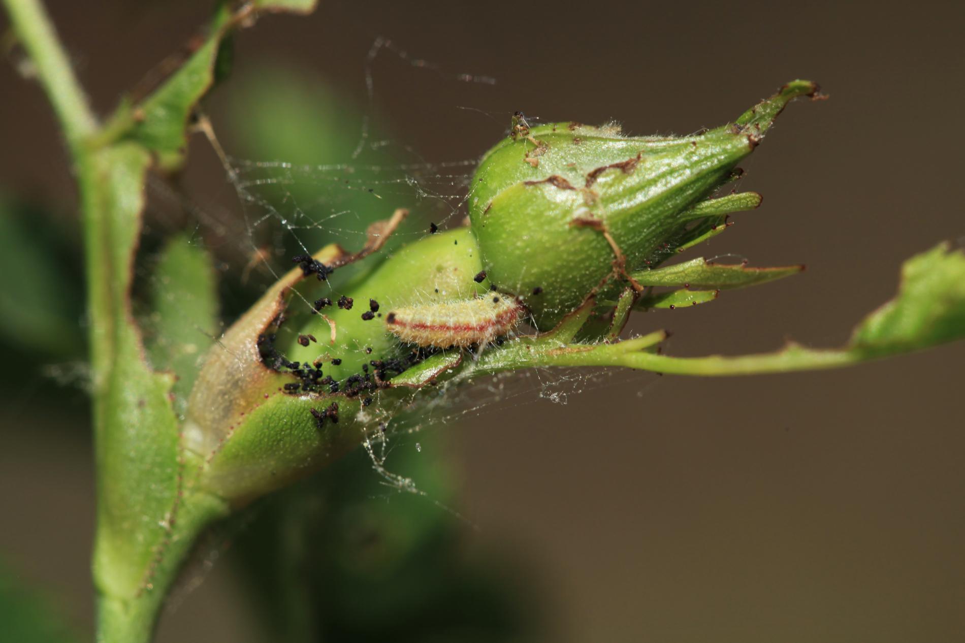 A hairy, slug-like larva found on leaves or near the buds. It creates fine, silk-like webs with fragments of debris around it.
