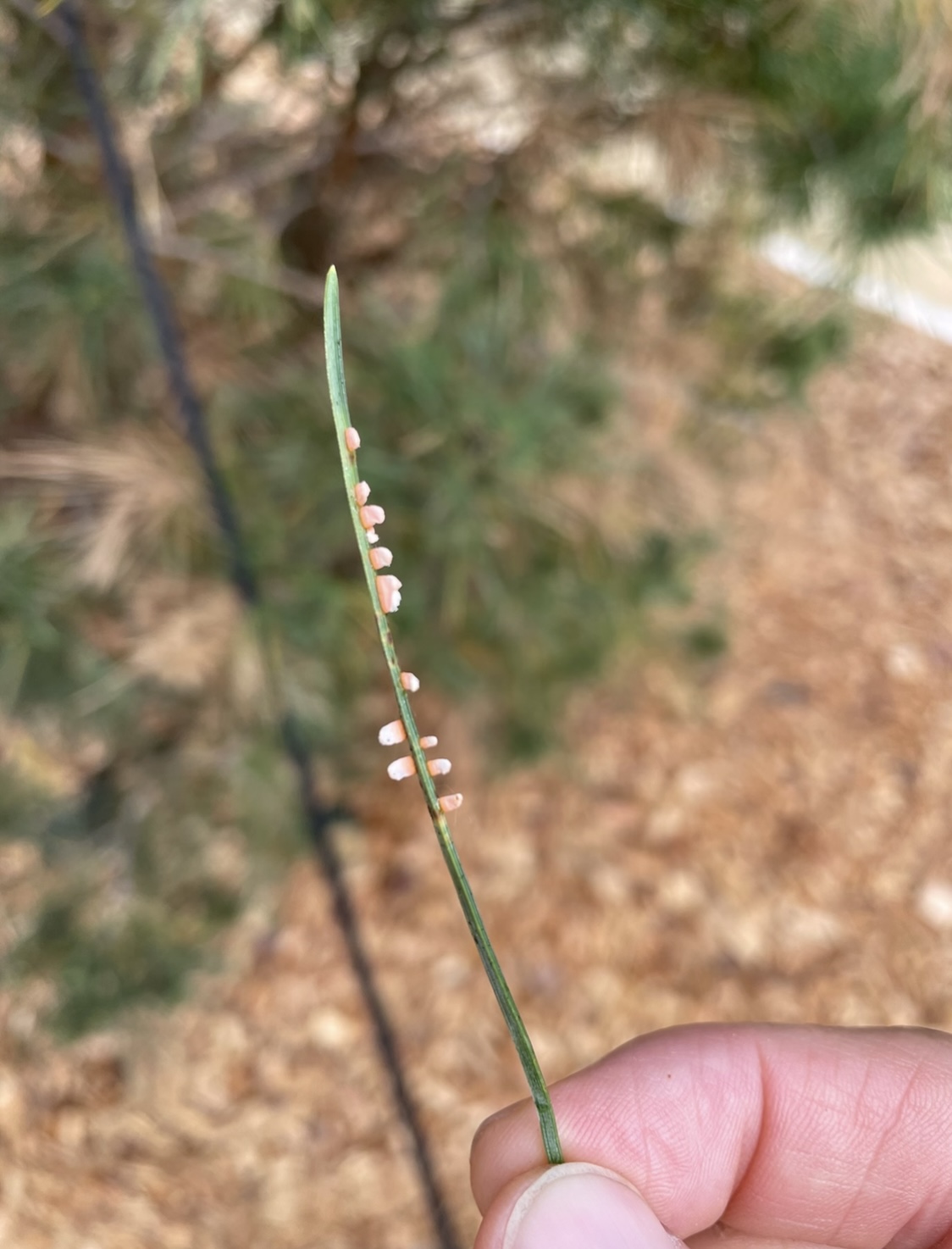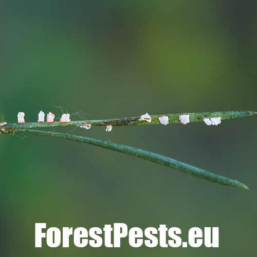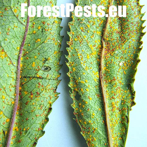 Little orange heaps on needles are formed by spores (aeciospores) – haplophase. They are placed in a receptacle under the needle epidermis which is broken by them and as a result, each receptacle seems to be surrounded by a transparent epidermis collar. The developmental cycle of the rust is relatively complicated. To be developed, it usually needs another intermediate host (Petasites spp., Campanula spp., Tusilago spp., Senecio spp., etc.) on which are developed dicariotic urediospores, teleutospores, and basidiospores. Needle rust of pines occasionally destroys enough foliage to retard the growth of young trees, but usually little damage is caused.