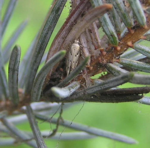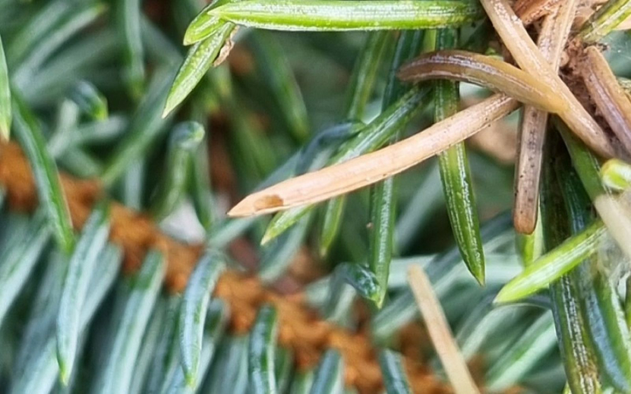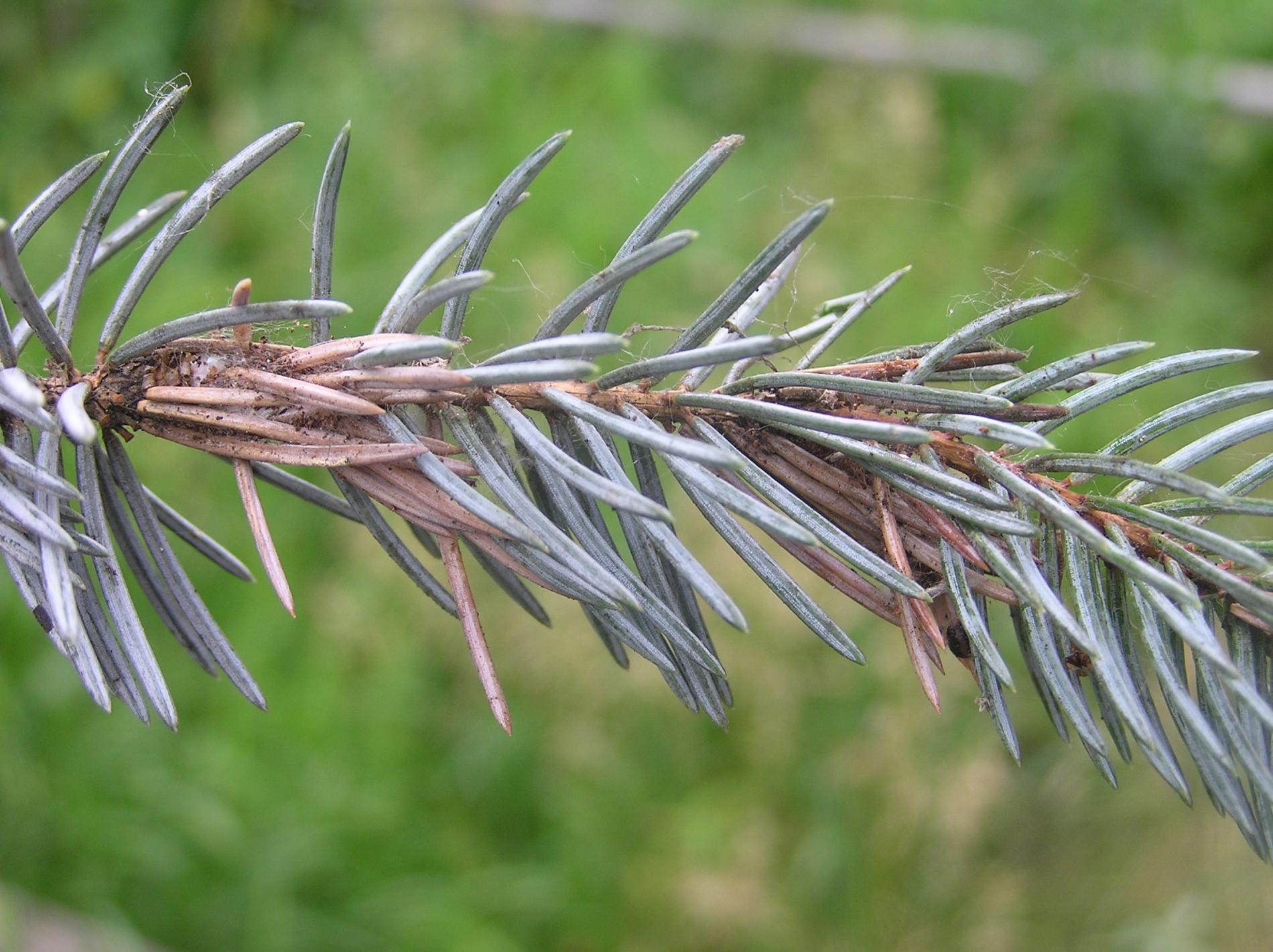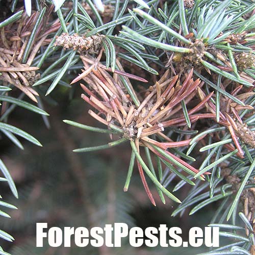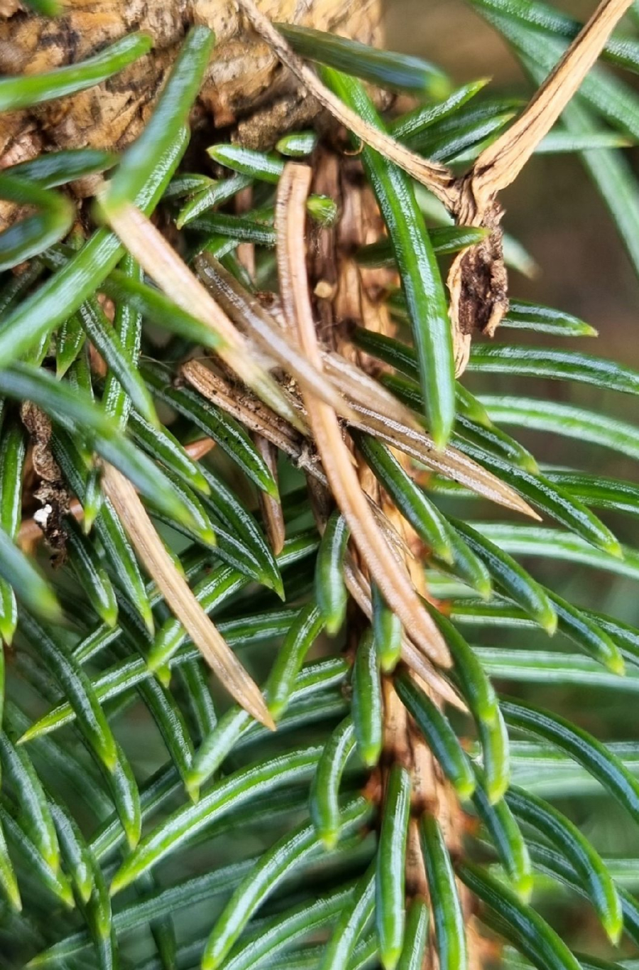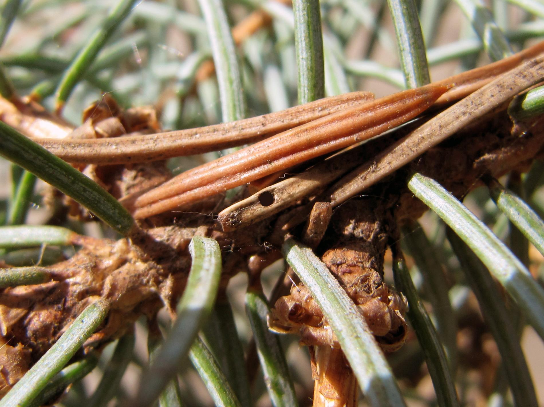 Needles spun and attached to a twig. A small hole in each damaged needle.