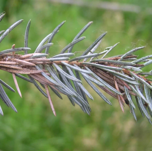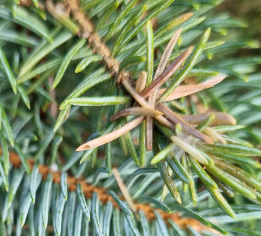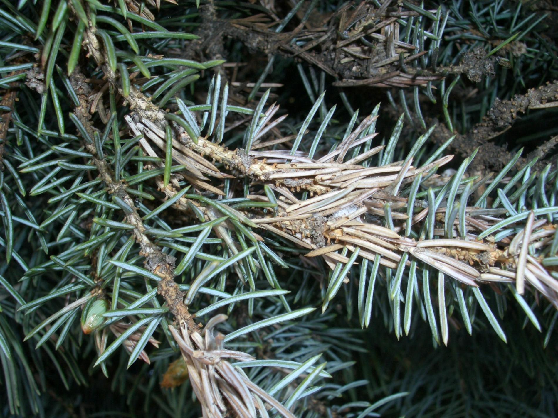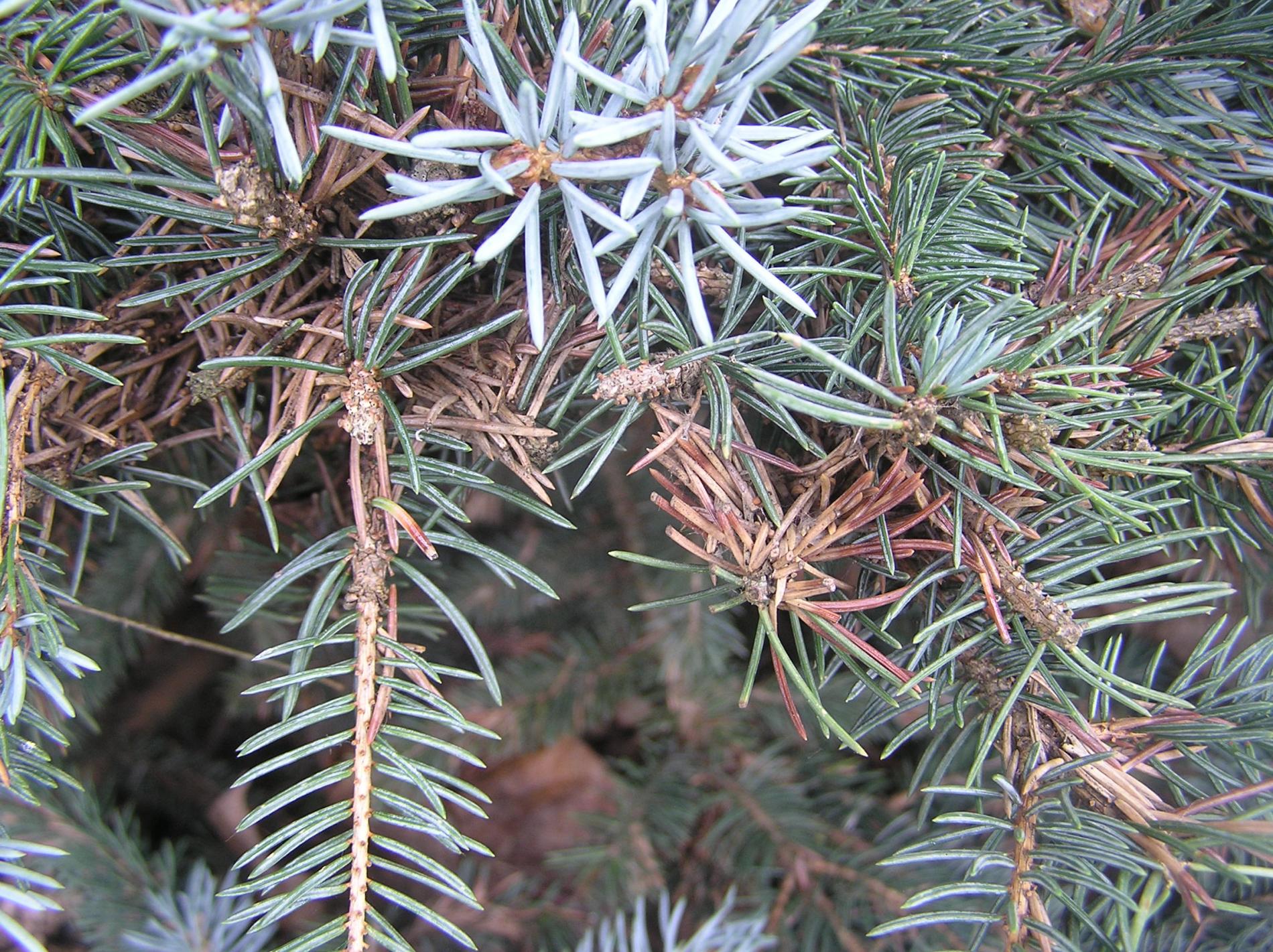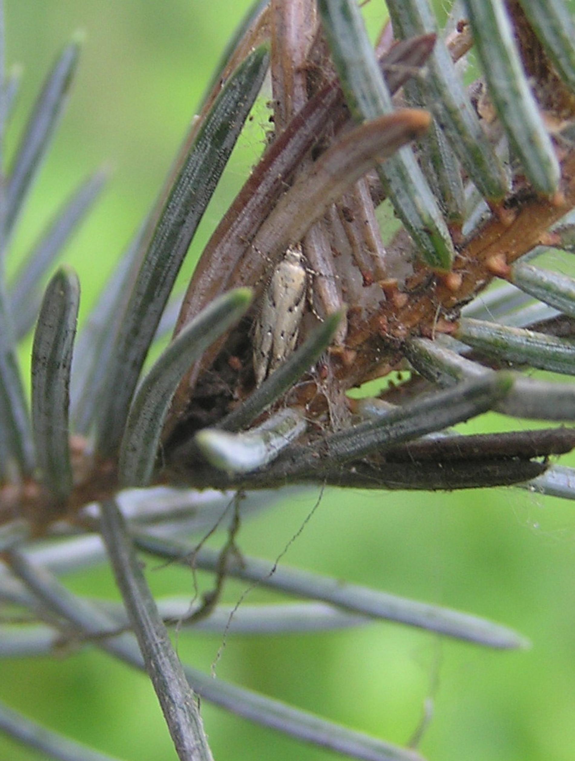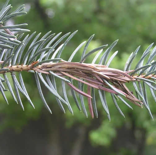 Needles spun and attached to a twig. A small hole in each damaged needle.