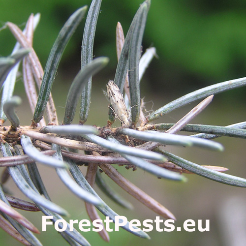 The adult has a wingspan of about 10–11 mm. Females oviposit in July. The larvae bore feeding tunnels inside the needles. On the infested needle round exit holes are found, visible even with the naked eye. During the vegetation period the larvae hollow out a number of needles, using one as a shelter for winter dormancy. The needles are fixed together with fine silk. Partly grown larvae overwinter in the mined needles. Larvae pupate in June. Has one generation per year. A typical symptom of infestation is rusty discolouration of needles in circumference of the spruce canopy. Causes serious damage in orchards and on solitary trees in urban areas. It is an introduced species in Europe and was first recorded in Great Britain in 1952, then in Germany in 1963 and has expanded to entire Europe.
