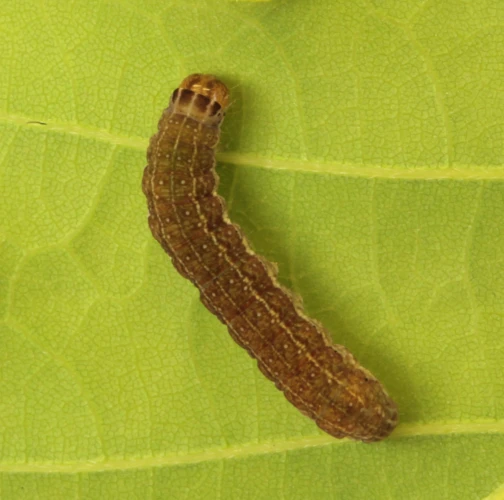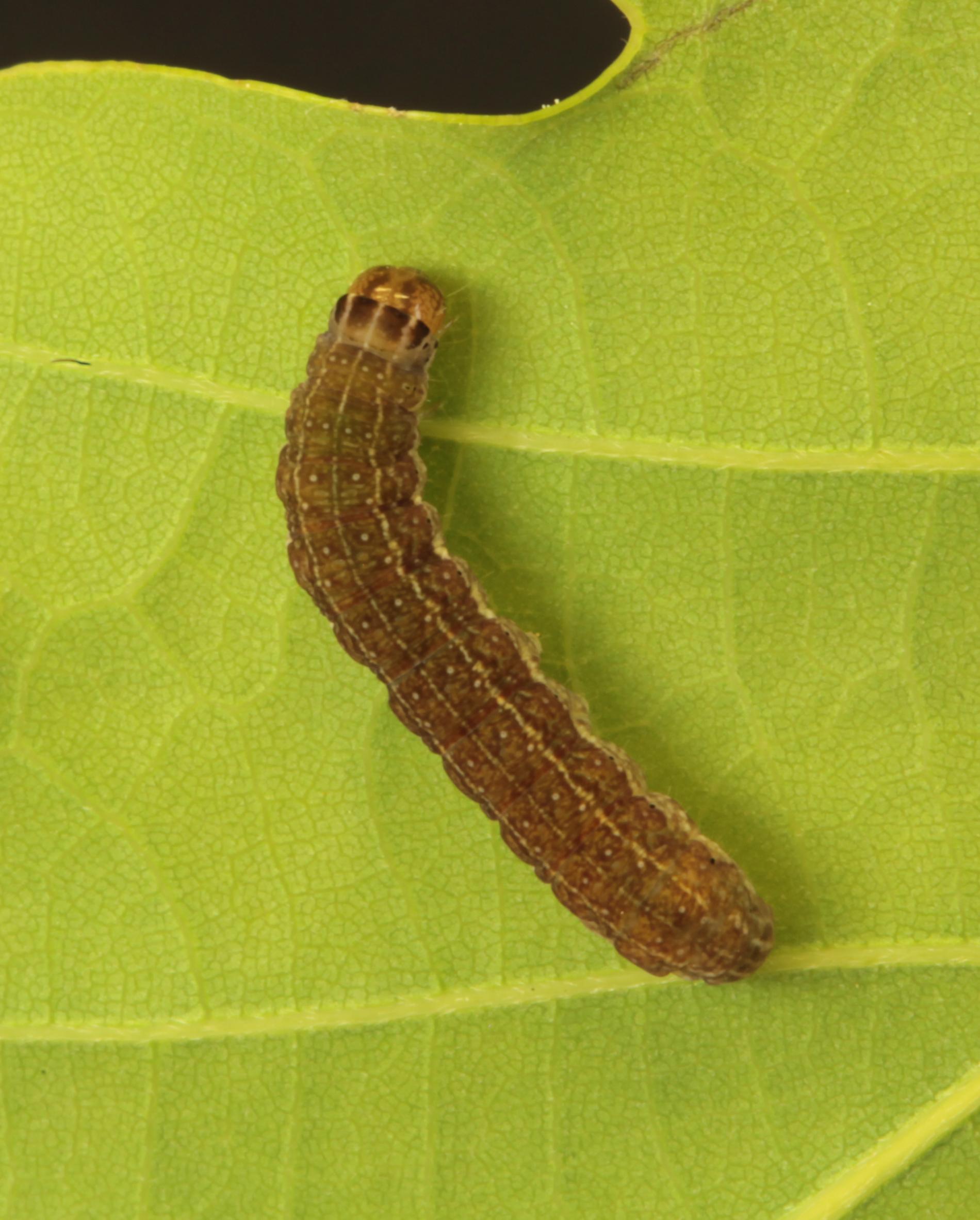 Caterpillar on a leaf, massive, brown with many small darker spots. Head brown.