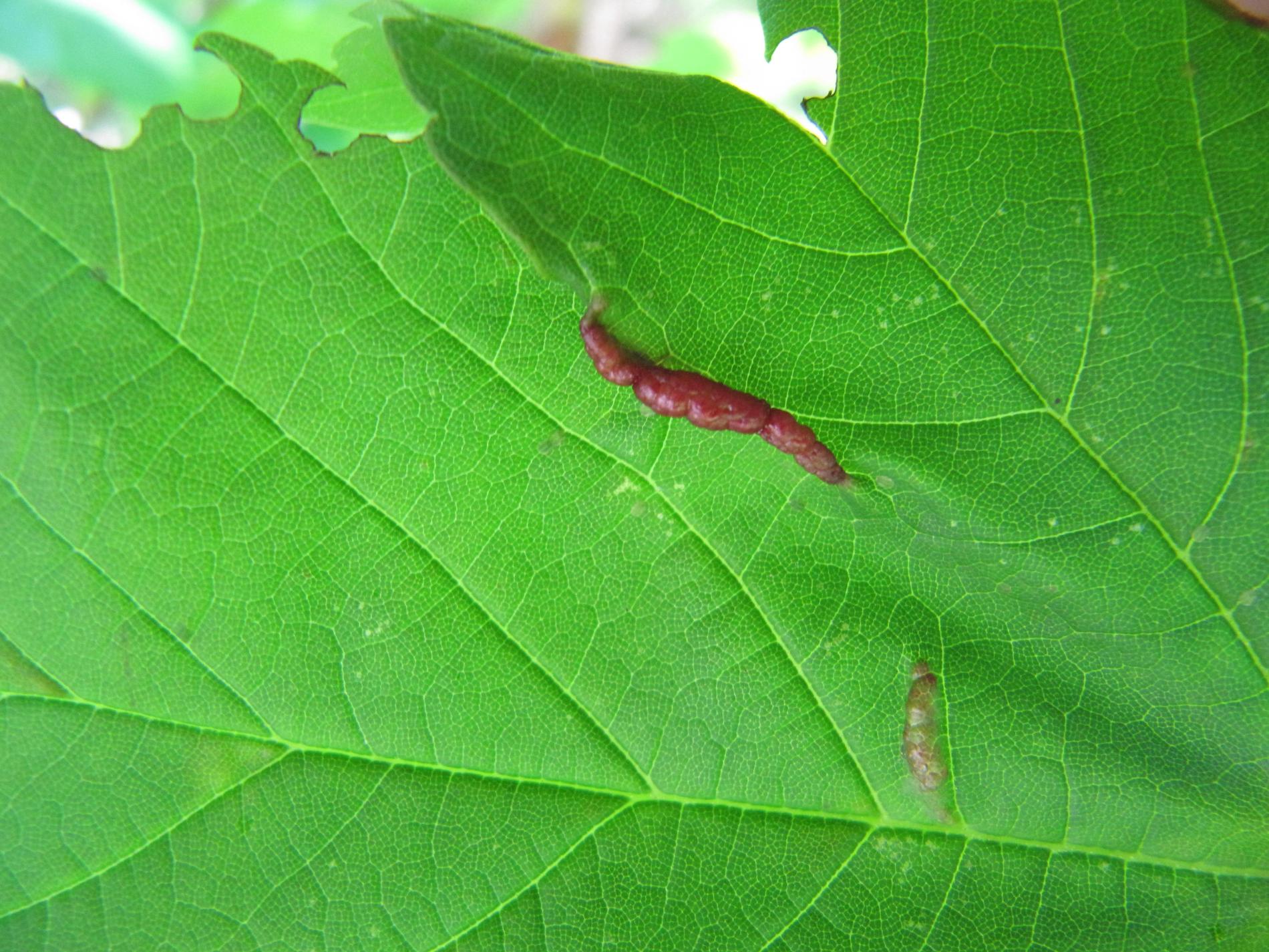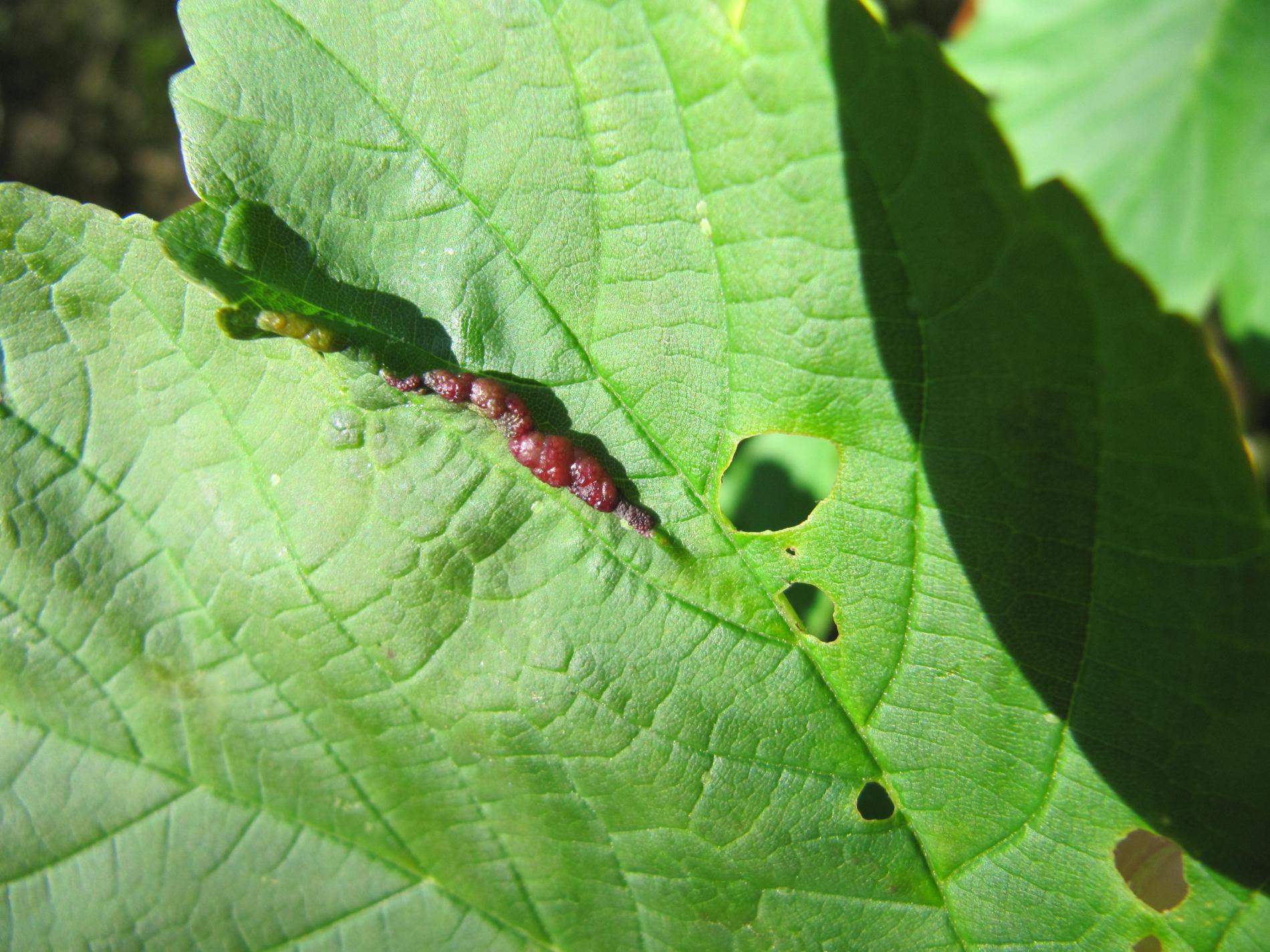 Infested leaves display reddish, folded galls often along the veins. Galls with white hairs inside house white larvae. Severely infested leaves may show curling and deformation.